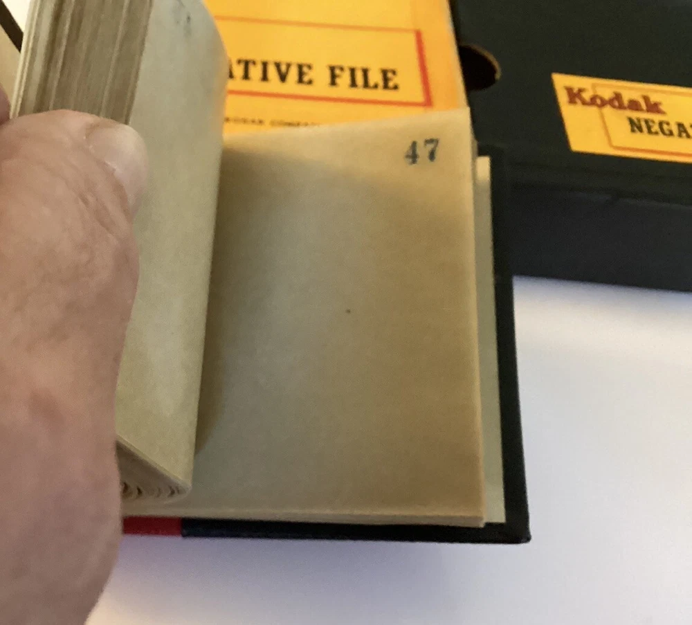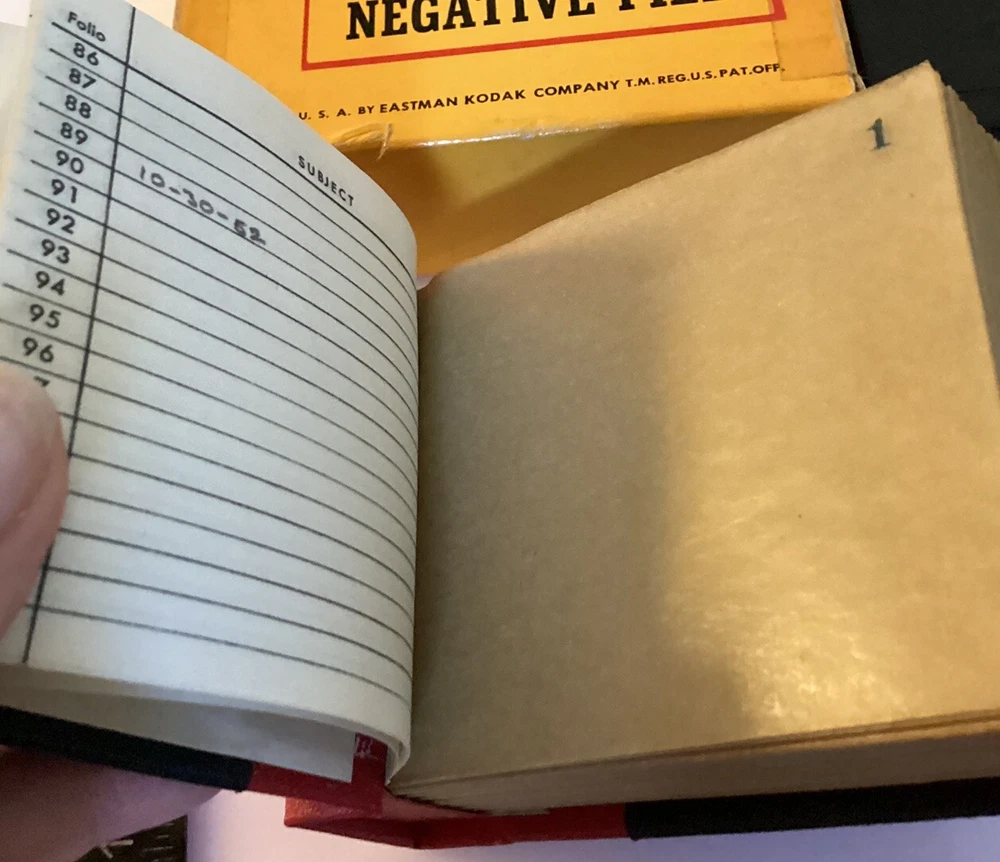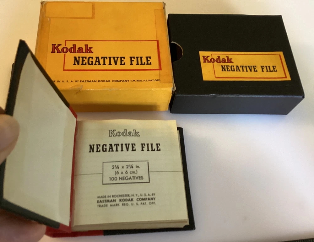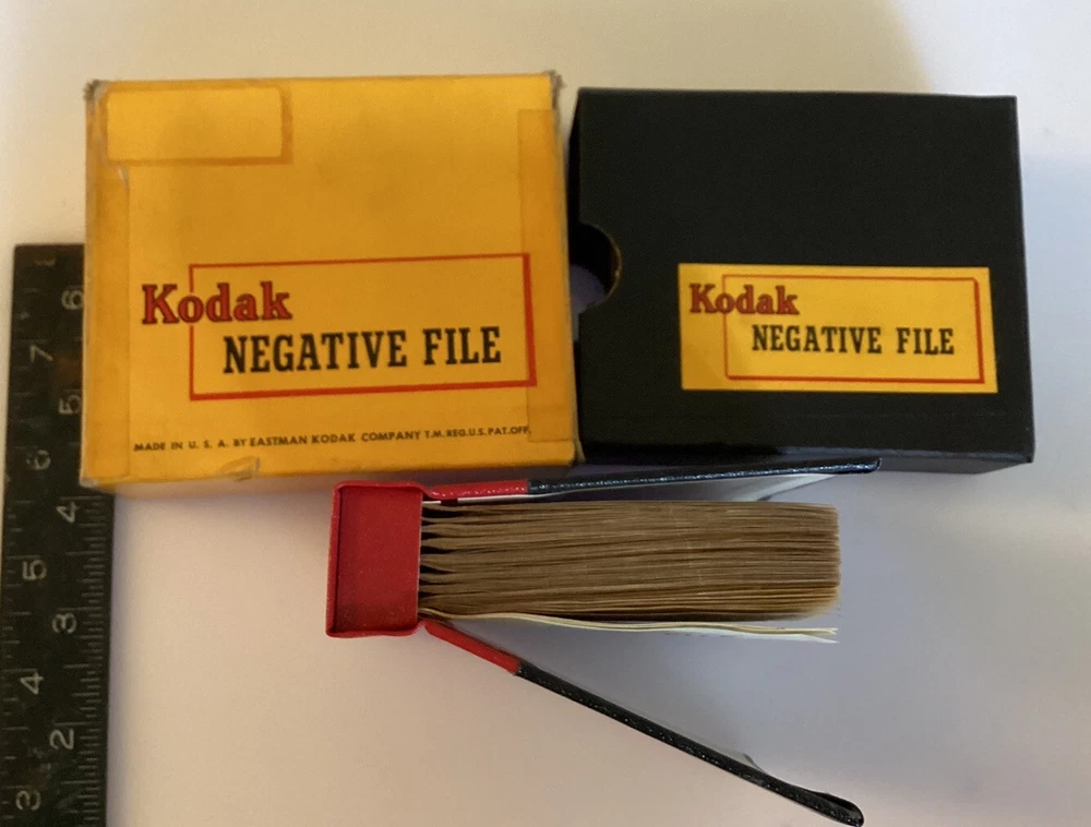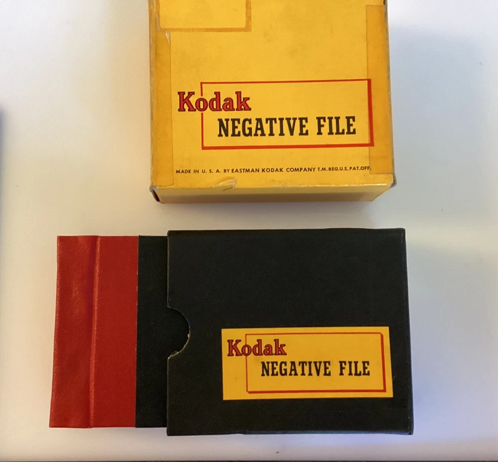 Unique and Rare Kodak 100 Page Glassine photo negative File Book 3x3 1/4” Red and Black Made in Rochester NY Sold together as a set 2 inside boxes great Outside box has Issues,,,see photos& Writing in pencil Sold as-is with tracking @bottom grey drawer