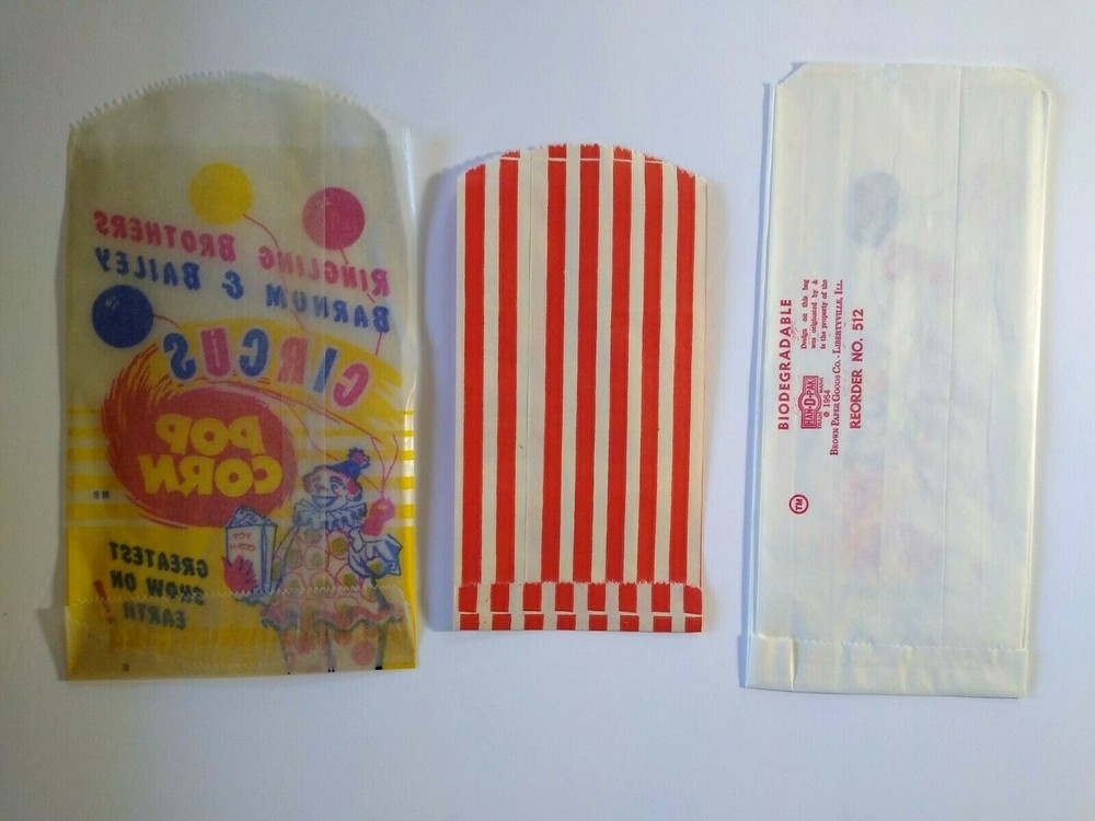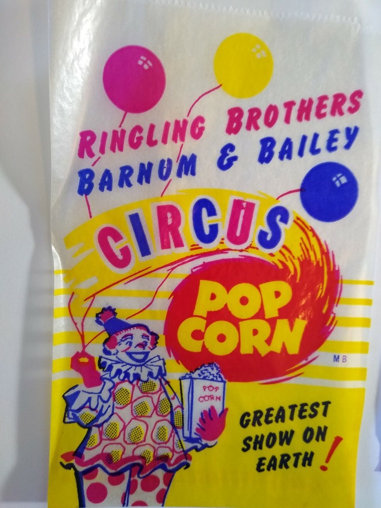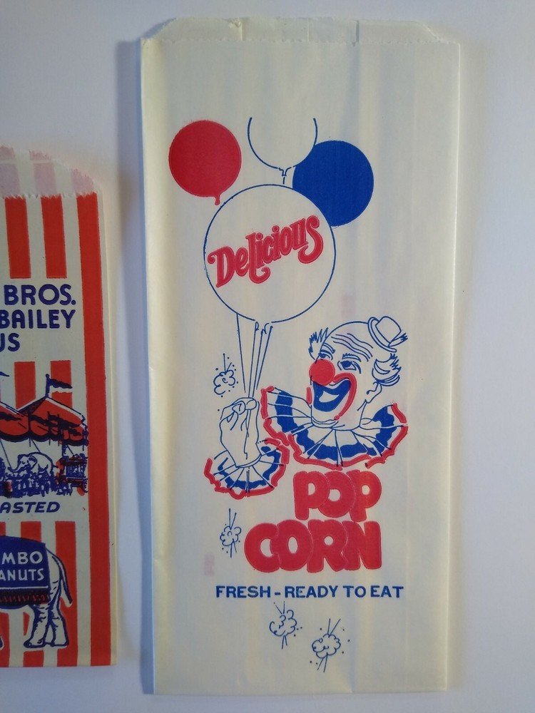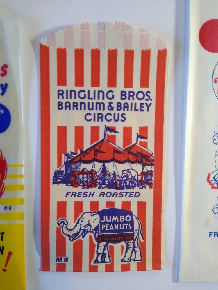 Ringling Brothers Barnum & Bailey Circus Clown Popcorn & Peanut Bags 1940s Lot 3 New old stock empty paper and wax glassine popcorn and peanut bags. Lot of (3) different. Measures between 6.75" - 8.25". Light storage wear only. SHIPPING Buyer pays shipping and handling. Bundle and save by using cart and making single payment. International buyers are responsible for any import fees/taxes. ABOUT US Seller of vintage collectibles, gifts, advertising, artwork, original pinball flyers, vinyl records, video arcade flyers, pinball machine translites, game manuals, score cards, magazines, antique Halloween and holiday postcards, Christmas items, super hero memorabilia, horror themed art.