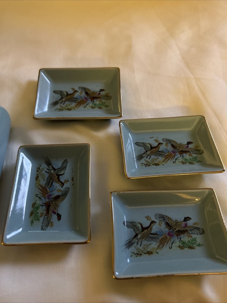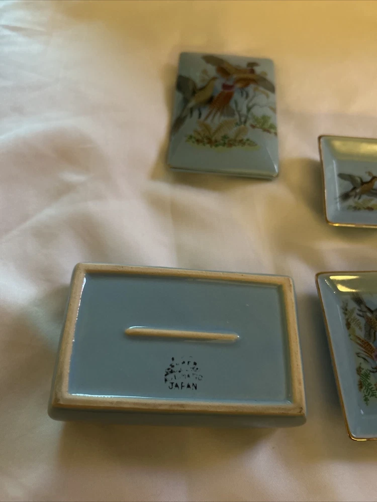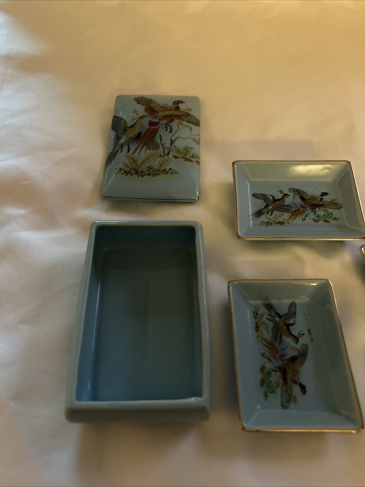 Theme:WildlifeSubject:Pheasants, BirdsTime Period Manufactured:1950-1959Type:Trinket BoxShape:RectangleCollection:AnimalsPattern:PheasantOccasion:All OccasionsSize:4.5x 3inFinish:GlossyMaterial:Ceramic, PorcelainStyle:1950sCountry/Region of Manufacture:JapanCharacter:pheasantBrand:ATCColor:BlueFeatures:Boxed