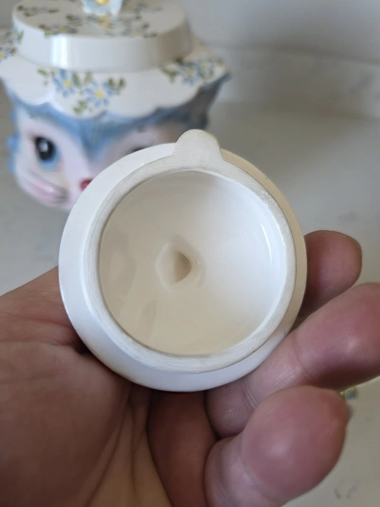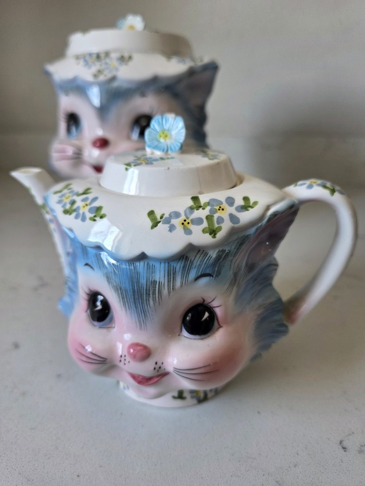 The Vintage 1950s Lefton Miss Priss Kitty Blue Ceramic 4 Cup Teapot from Japan is a charming collectible piece perfect for any vintage lover or tea enthusiast. With its novelty shape and kitchy retro theme, this teapot features a Miss Priss character design in a vibrant multicolor finish. Made of ceramic with a glossy finish, this teapot set includes the teapot and lid, making it a unique addition to any kitchen or home decor collection. Its original 1950s style and Lefton franchise add to its appeal as a vintage treasure. Lid has very small chip in top flower as shown. With sticker.