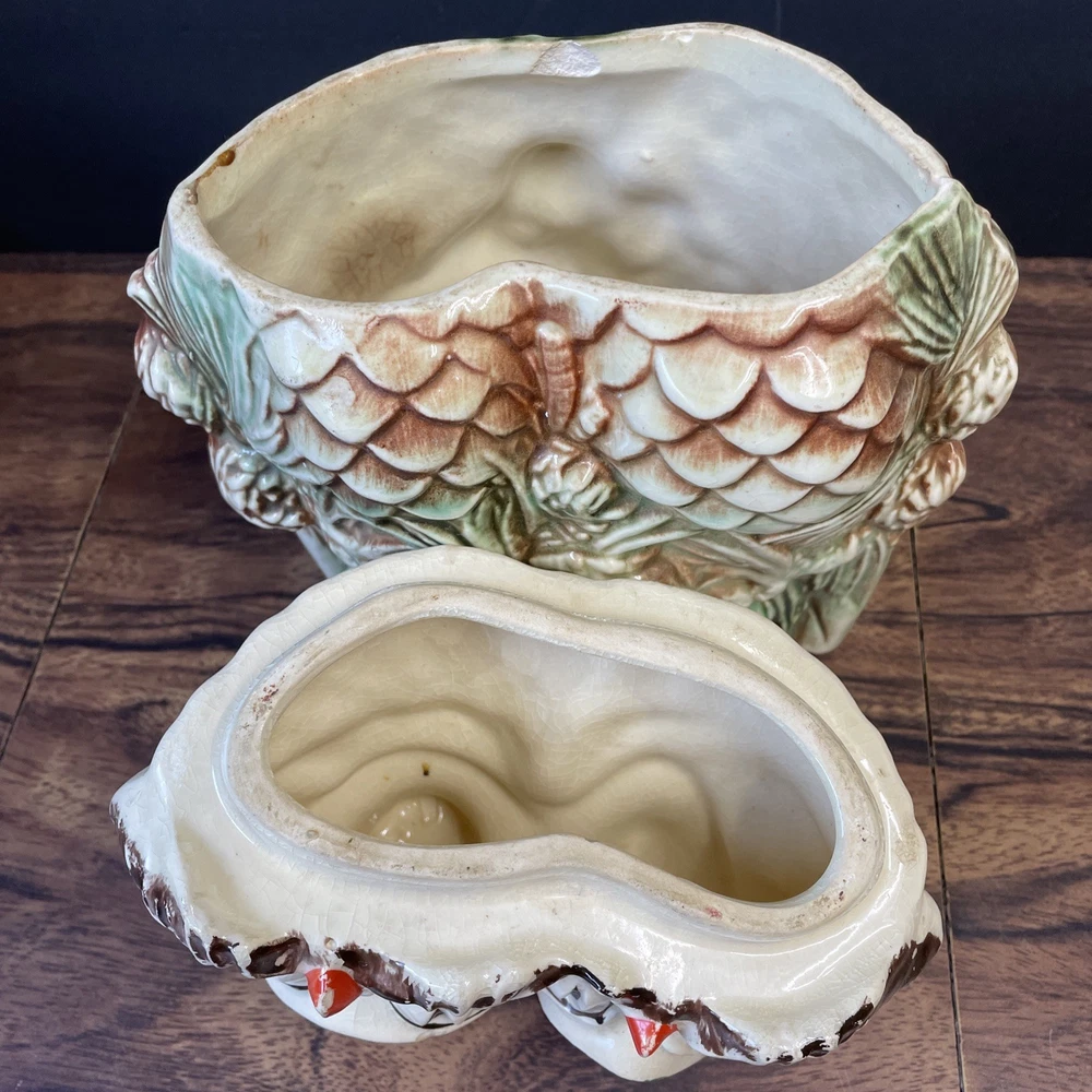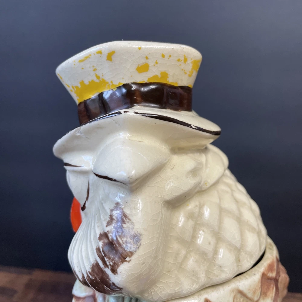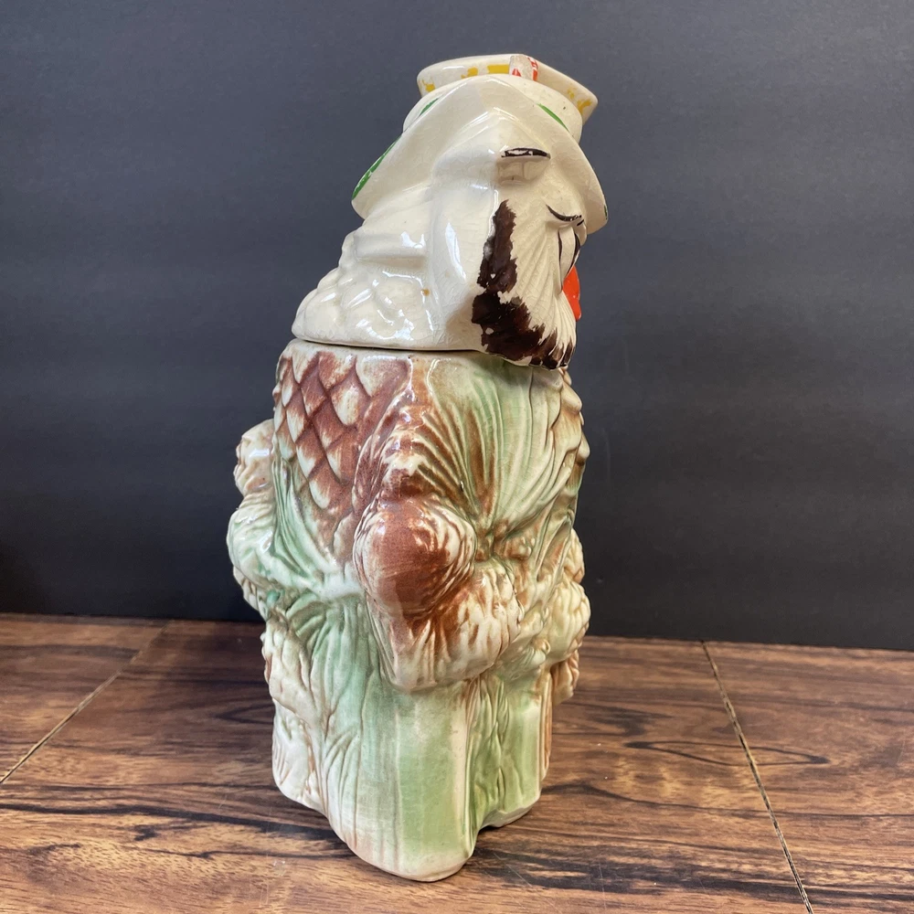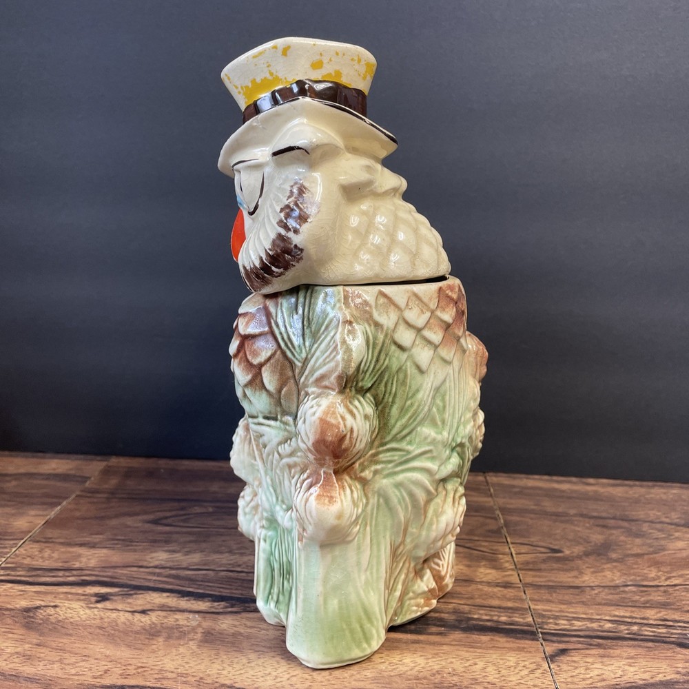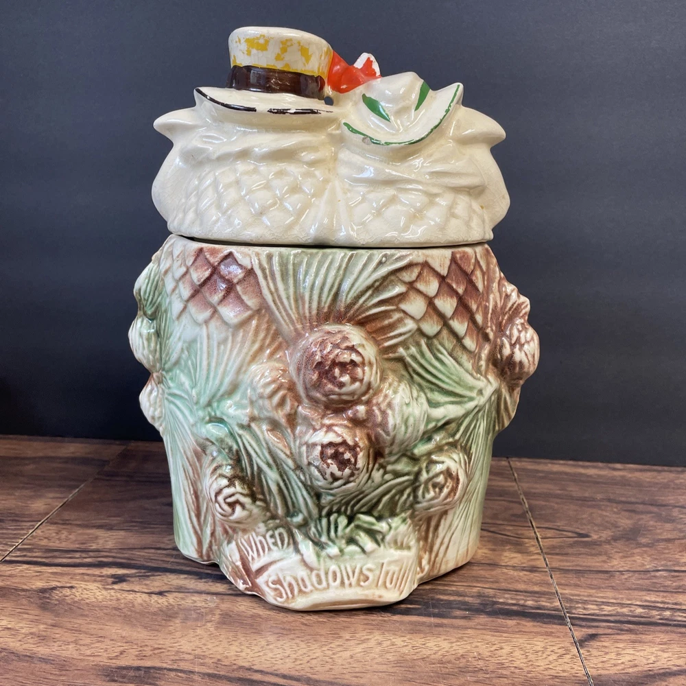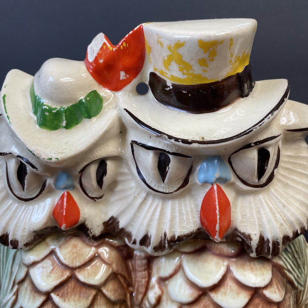 The McCoy Pottery USA Cookie Jar featuring Mr & Mrs Owl is a vintage piece from the 1950s. This large, square-shaped jar has a whimsical design with a lift-off lid, perfect for storing and displaying cookies. The cream, brown, green, and red colors of the ceramic and porcelain material give it a unique and charming look. With its antique style and fantastical theme of owls, this cookie jar is a delightful addition to any kitchen or collectibles collection. Please see photos because there are some chips in the glass.