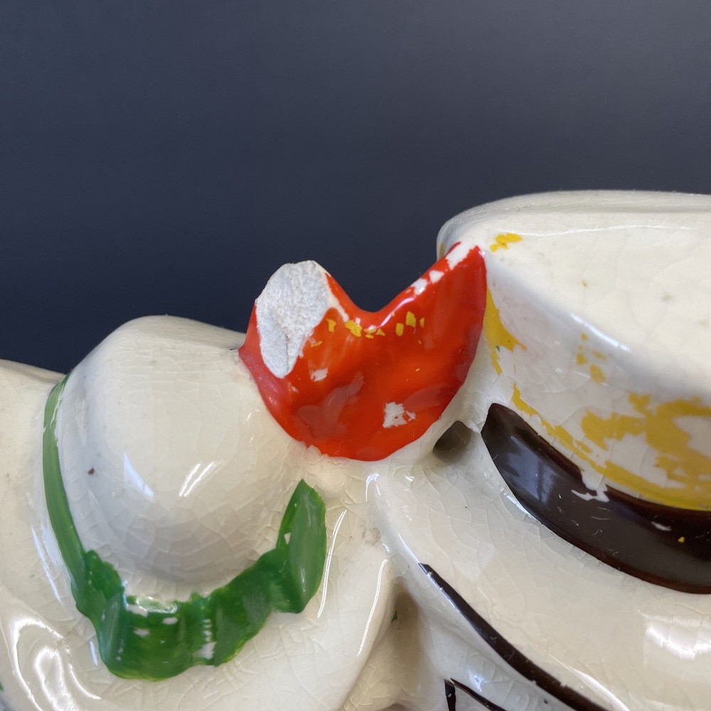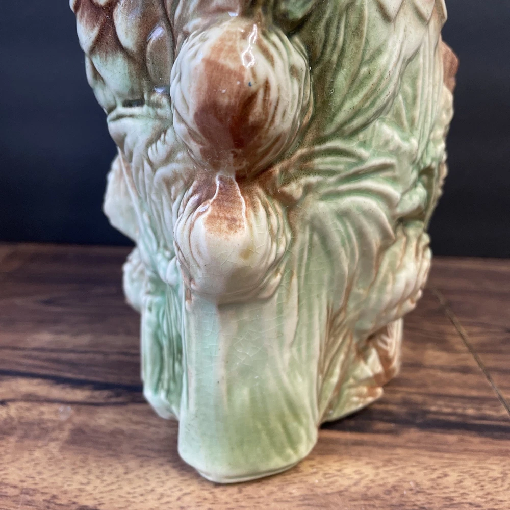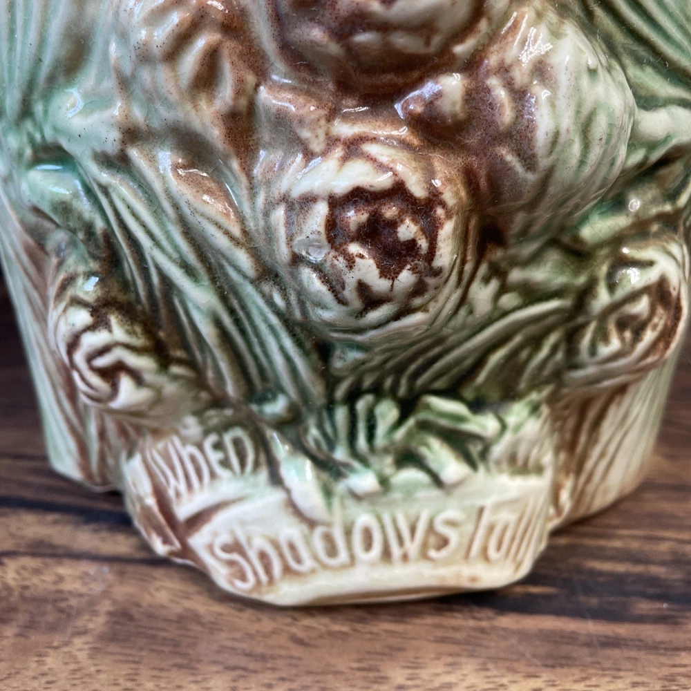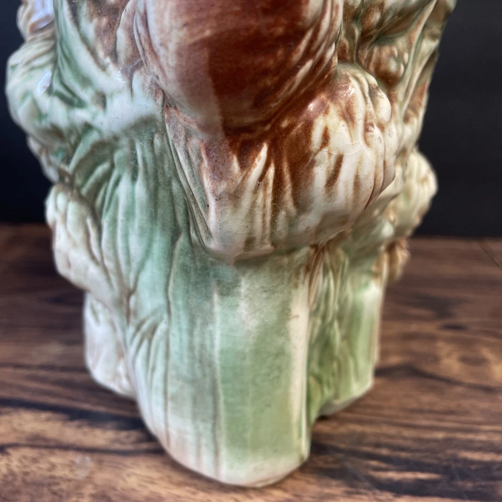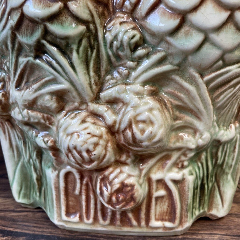 The McCoy Pottery USA Cookie Jar featuring Mr & Mrs Owl is a vintage piece from the 1950s. This large, square-shaped jar has a whimsical design with a lift-off lid, perfect for storing and displaying cookies. The cream, brown, green, and red colors of the ceramic and porcelain material give it a unique and charming look. With its antique style and fantastical theme of owls, this cookie jar is a delightful addition to any kitchen or collectibles collection. Please see photos because there are some chips in the glass.
