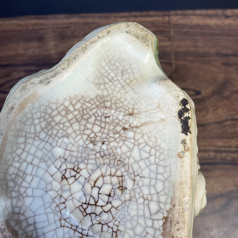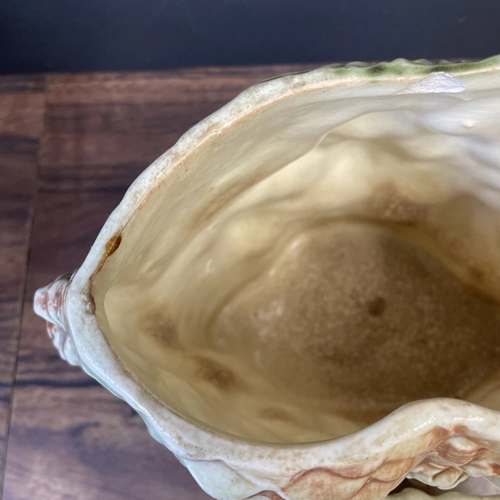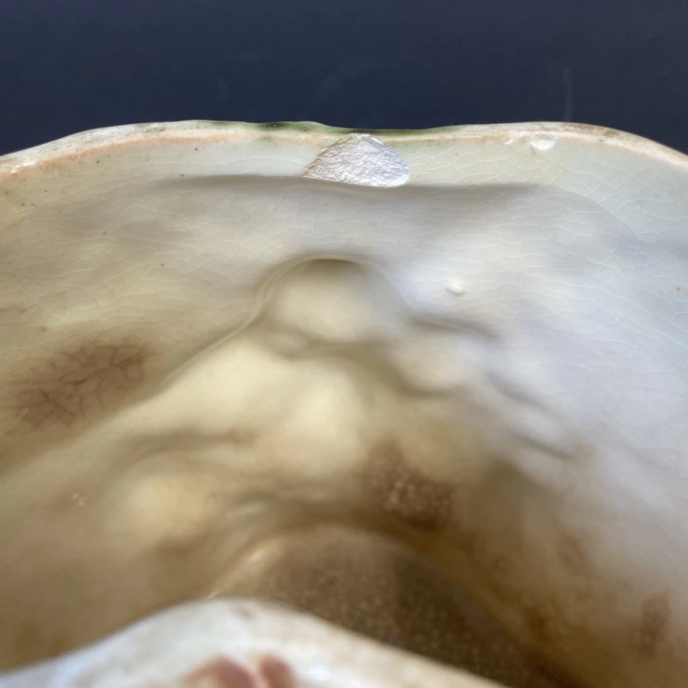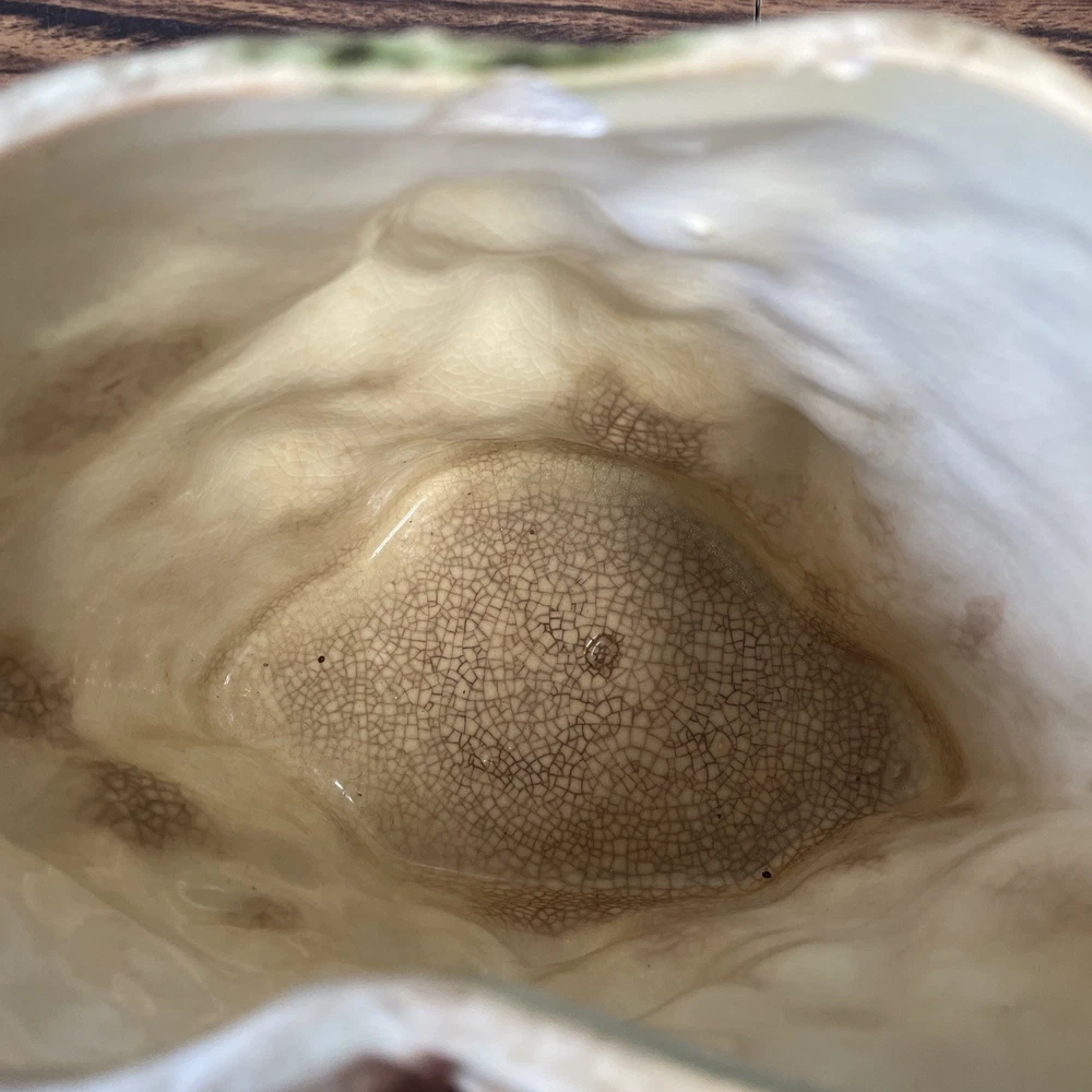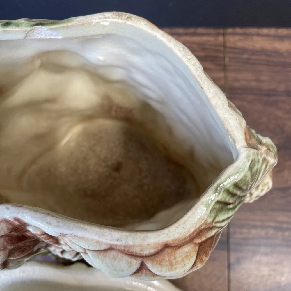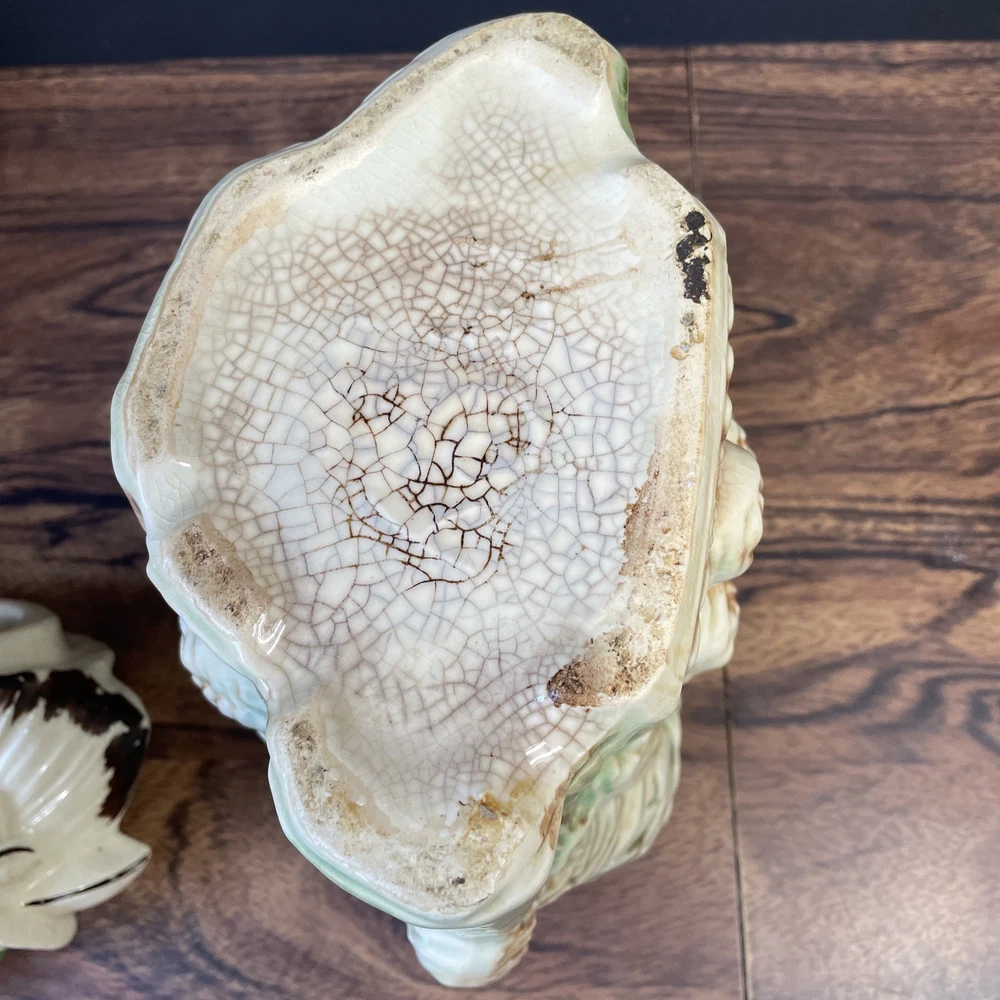 The McCoy Pottery USA Cookie Jar featuring Mr & Mrs Owl is a vintage piece from the 1950s. This large, square-shaped jar has a whimsical design with a lift-off lid, perfect for storing and displaying cookies. The cream, brown, green, and red colors of the ceramic and porcelain material give it a unique and charming look. With its antique style and fantastical theme of owls, this cookie jar is a delightful addition to any kitchen or collectibles collection. Please see photos because there are some chips in the glass.