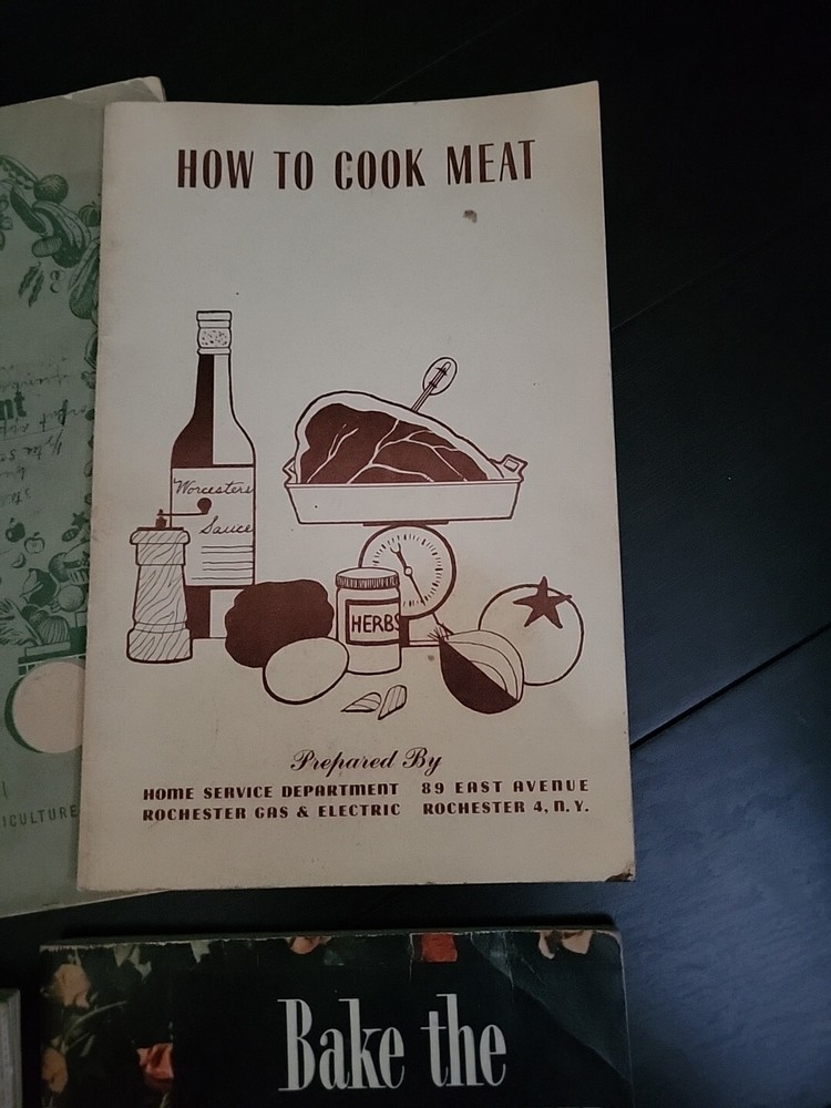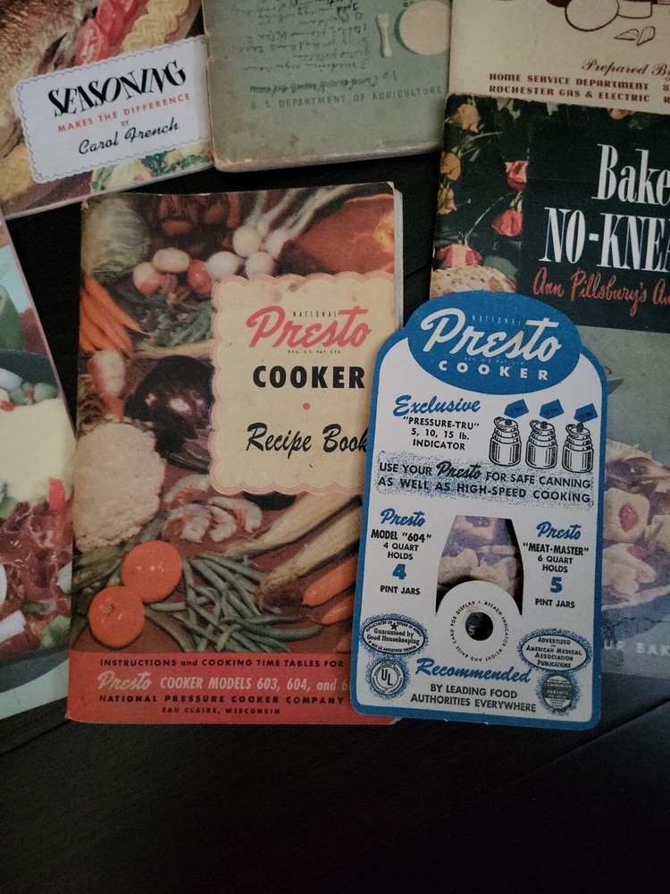 Lot of 7 recipe books. 1.Presto Cooker recipe book 2.Bake the No-Knead Way 3.Carnations Failure-Proof recipes 4.How To Cook Meat book by Rochester Gas & Electric Service 5.Family Fare by U.S. Dept of Agriculture 6.Seasoning Makes the Difference By Carol French 7. 500 delicious dishes from Leftovers(cover torn)
