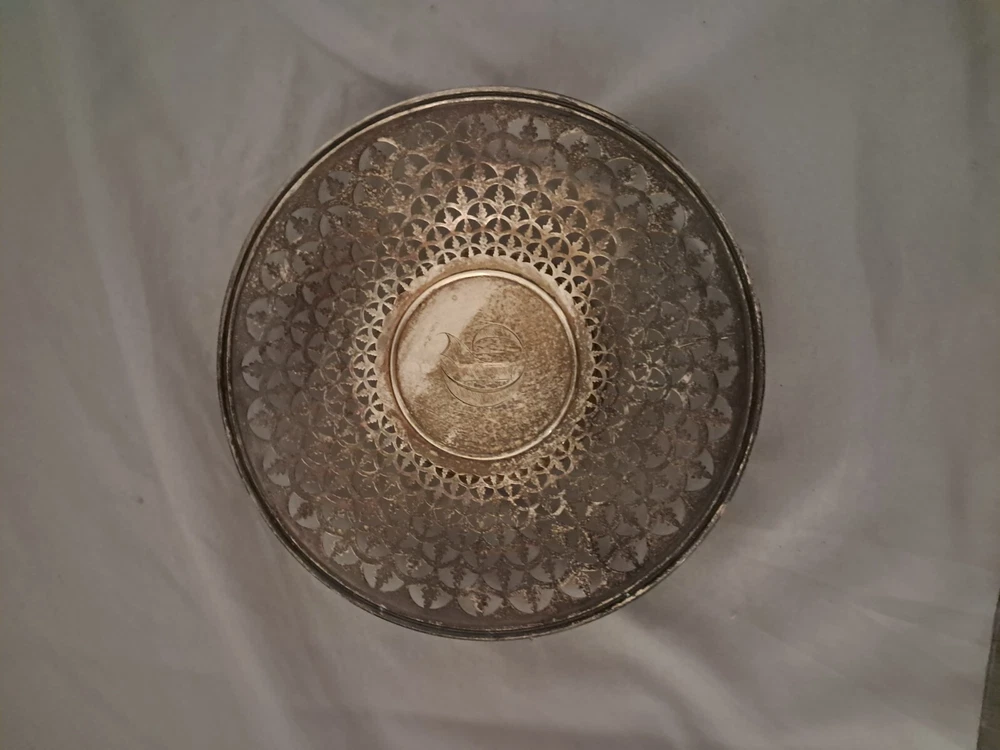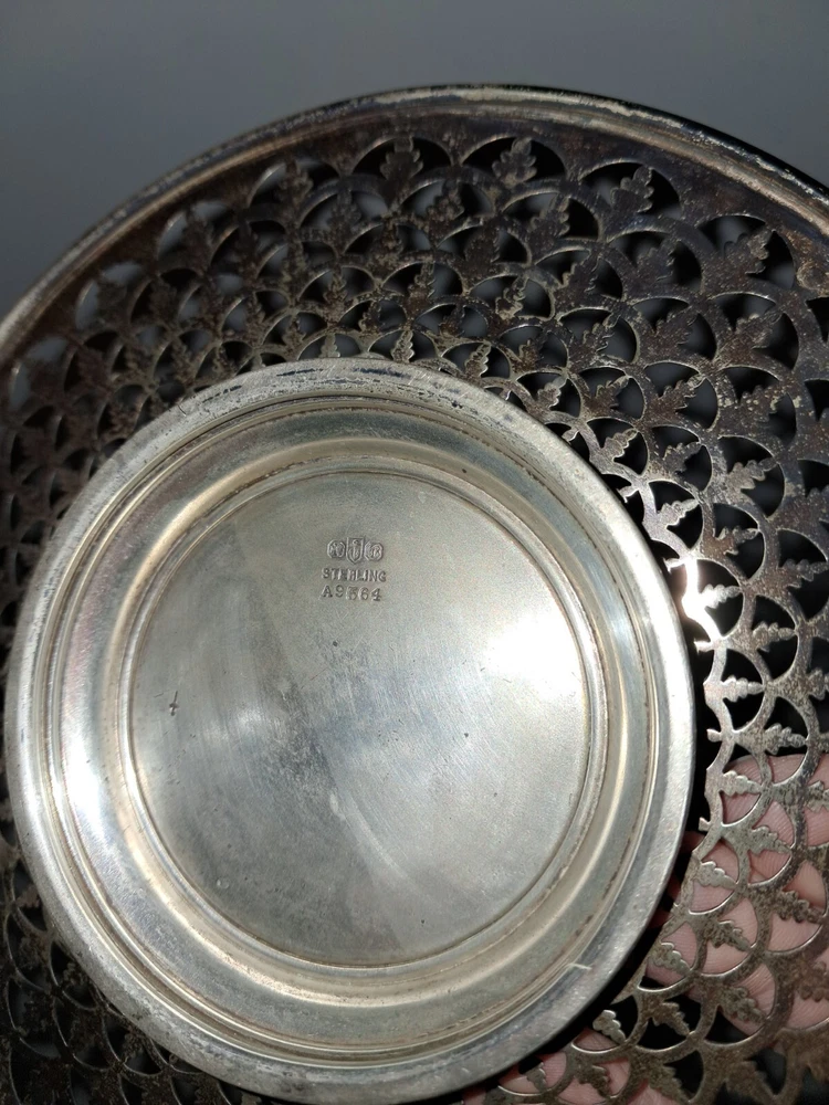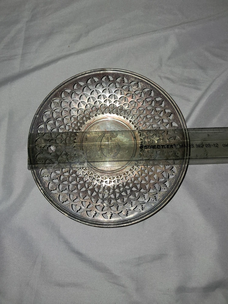 Good pre-owned condition. Vintage reticulated tray. Small, approximately 6.5 inches in diameter. Etched with a C in the middle. Silver plated. Sterling stamped on the back. Smoke free, pet friendly home. 112