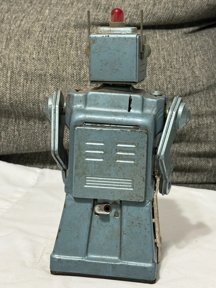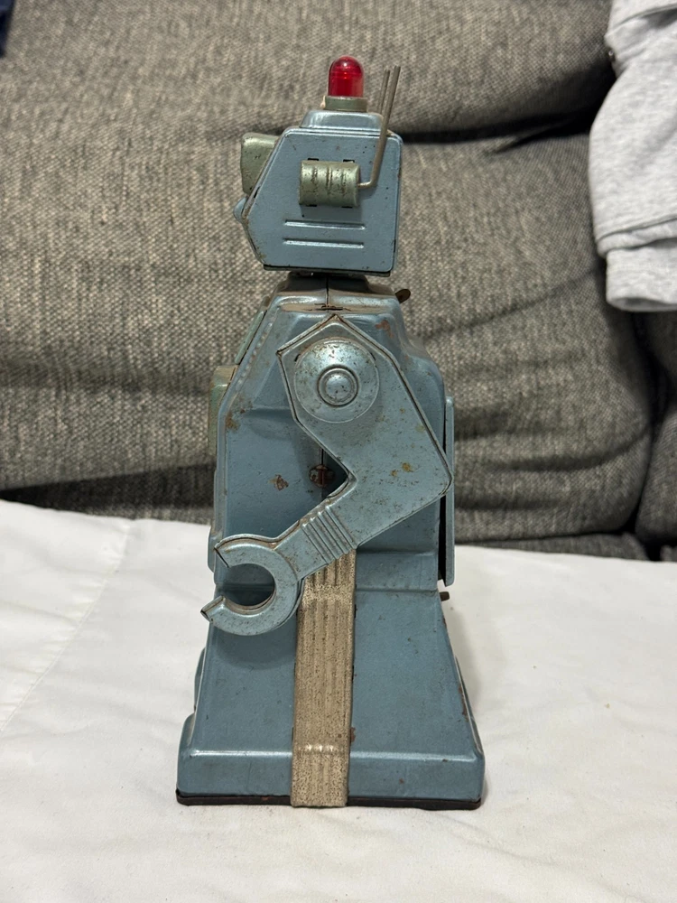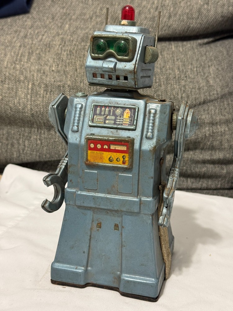 Offered for sale is an authentic vintage Japanese tin robot manufactured by Yonezawa in the 1950s , a highly collectible piece from the golden era of Japanese mechanical toys. This robot features classic mid-century design with lithographed control panel details, green eye lenses, red dome head light, and articulated arms including a claw-style hand. A strong example of early post-war Japanese tin toy production. Key Details: Brand: Yonezawa Origin: Japan Period: 1950s Material: Lithographed tin Markings: “Made in Japan” visible on chest Mechanism: Battery-operated (not tested) Condition: Untested – no battery test has been performed, functionality unknown Shows age-related wear , including surface scratches, oxidation, and minor paint loss Structurally solid with good display presence Original components appear intact Important Note: This item is sold as-is , as a collectible display piece. Due to its age, no guarantee is made regarding operation. Why This Piece Matters: Yonezawa robots from this era are increasingly scarce and highly sought after by advanced collectors of Japanese tin toys. The design, proportions, and surviving original parts make this a strong candidate for both display and restoration. Shipping & Handling: Carefully packed to ensure safe delivery International shipping available