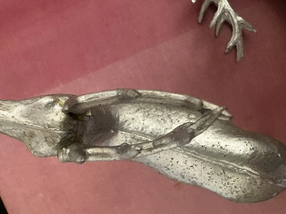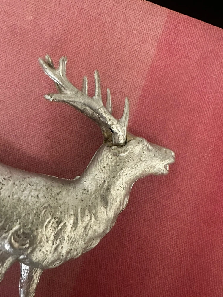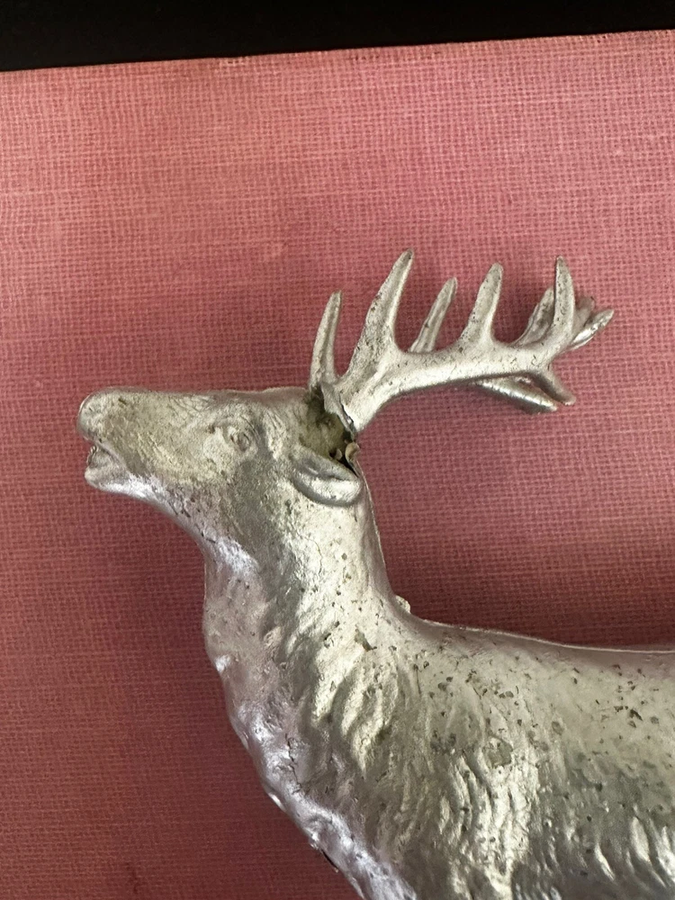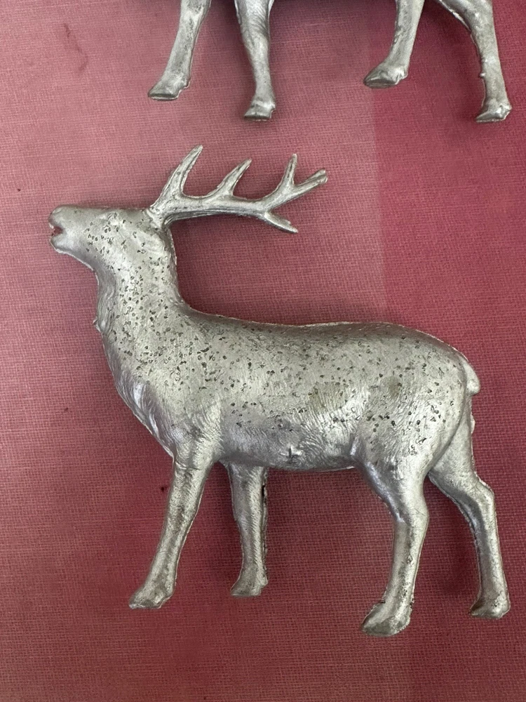 Charming and lovely, vintage 1950s or early 1960s celluloid silver reindeer. They each measure 3” 3/8 tall by 3” 1/2 inches wide. They’re in used condition with some flaws. One of the reindeer has a repaired antler on the left side. It’s secure but sticks out a bit. There’s also some silver paint loss on the middle of its body. There’s a bit of glue residue near the repaired reindeer’s antlers. The other deer has some minor paint loss as well. Each are marked Japan on the bottom of them. Selling as is/as found. A fabulous new addition to your classic holiday decor. Offering free shipping. Thanks for your interest!