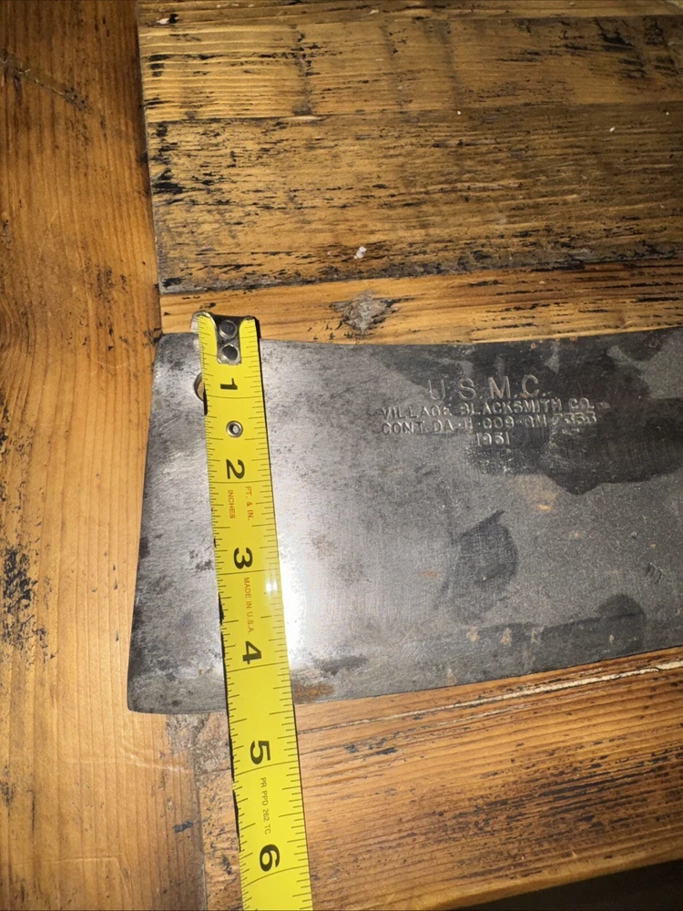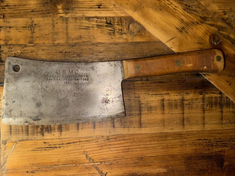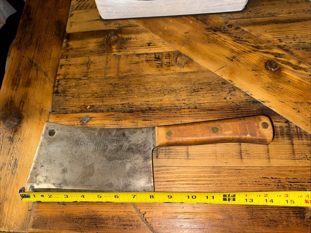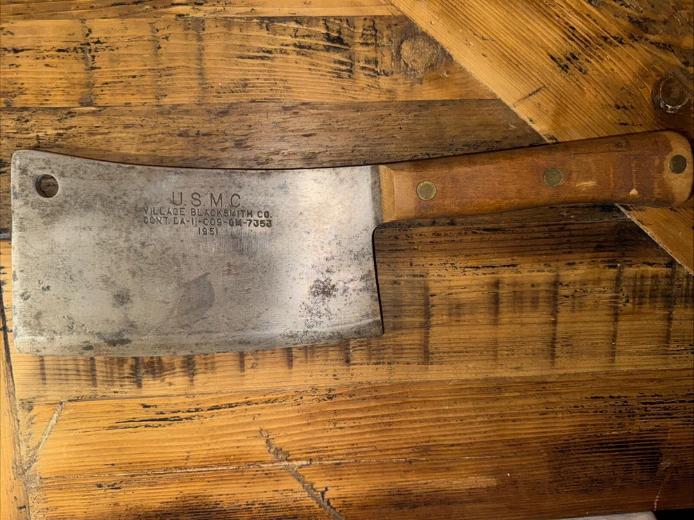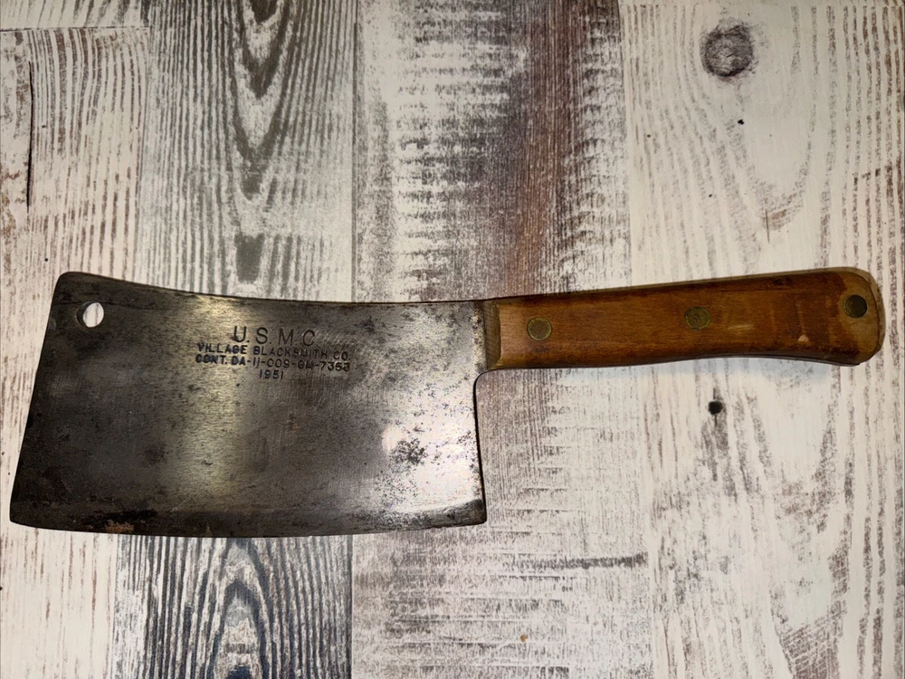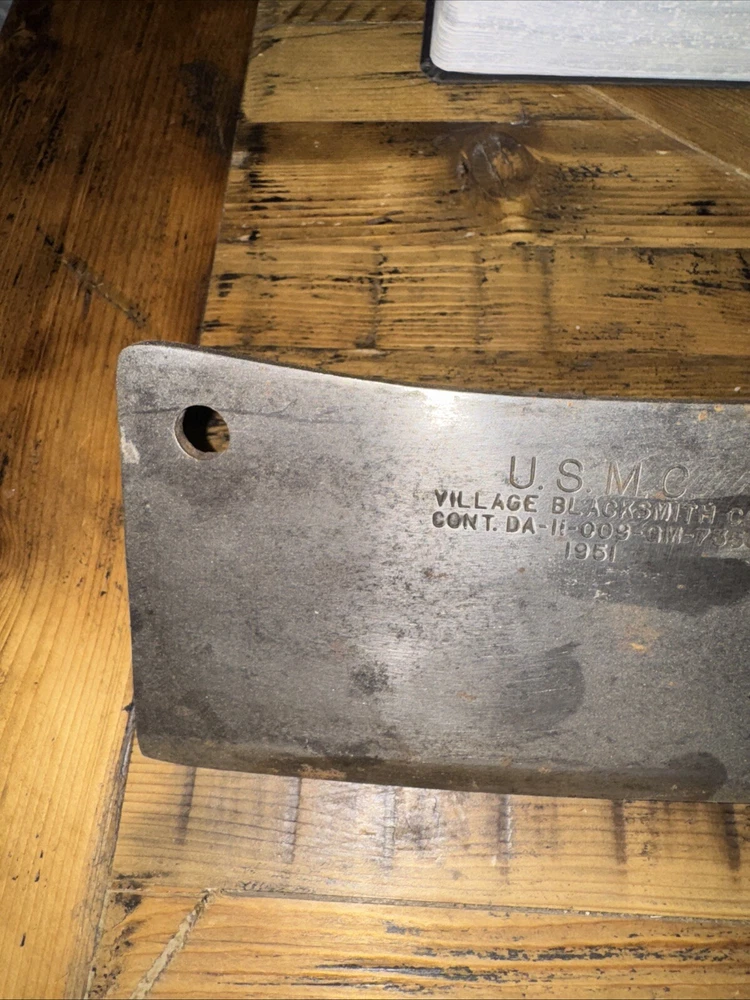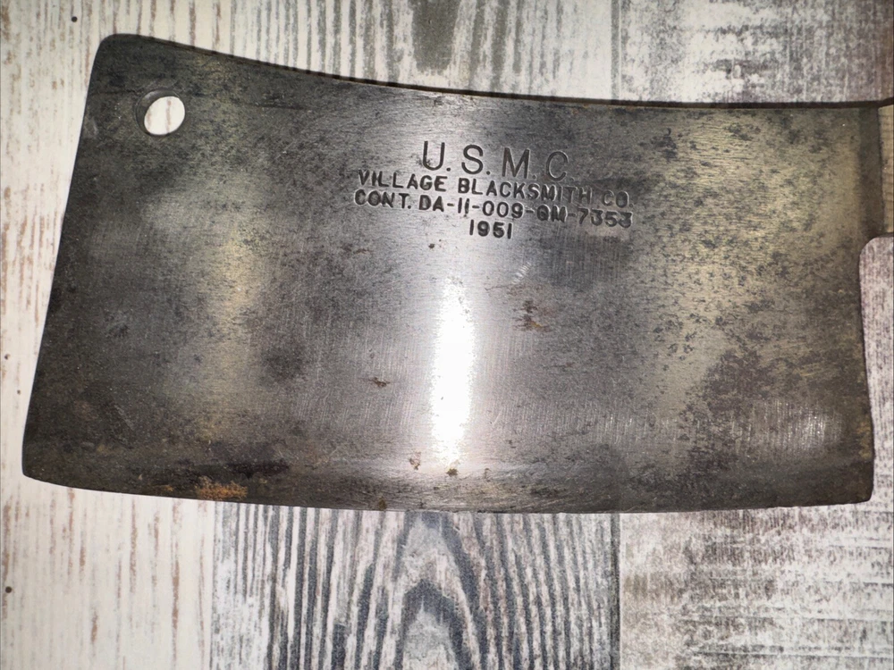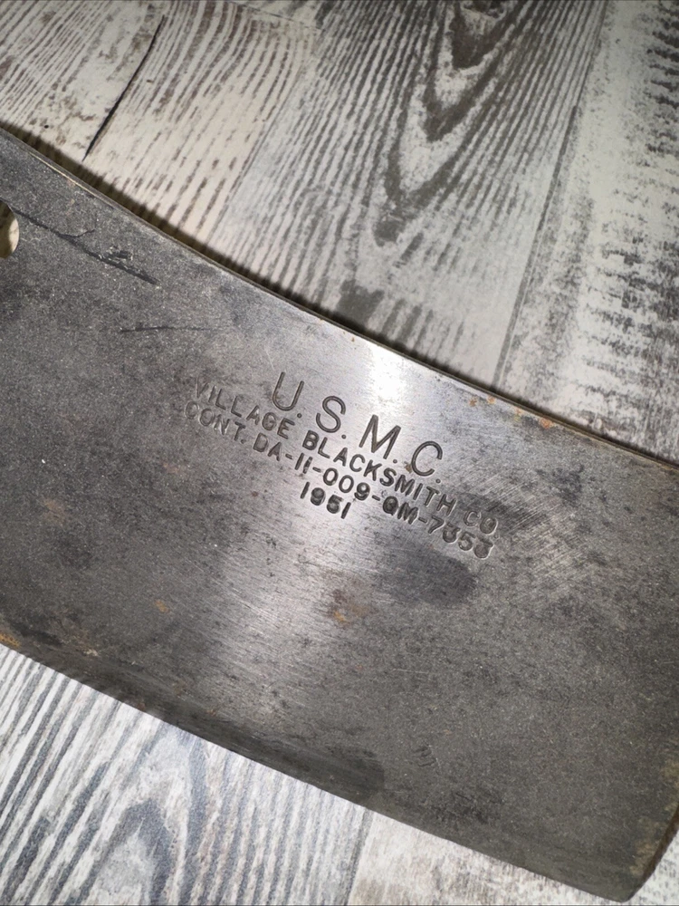 What do I know about meat cleavers? Not much. Here are the details as I see them: This cleaver has the date 1951 engraved on the blade. The blade is engraved with: (as you will see in the pictures) U.S.M.C., Village blacksmith Company CONT.DA-N-009-OM-7353 1951 The overerall length is approximately 14 inches and is 4 inches at the wide end. The wooden handle is sturdy and the metal blade tang extends all the way through the handle fastened by three rivets. There is NO crack on the handle. On one side there are 2 rivets missing. The handle is secure. There is no off odor and the handle feels clean and dry--not greasy. If I have missed any important facts, please feel free to ask!