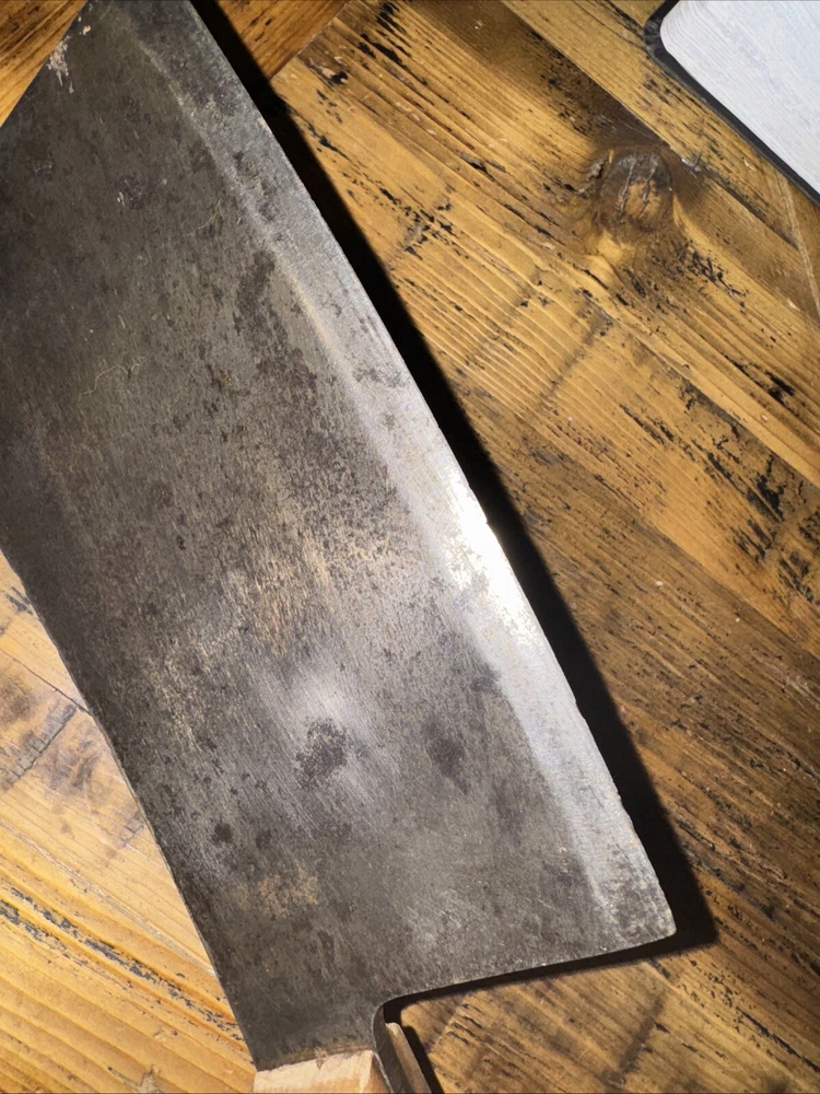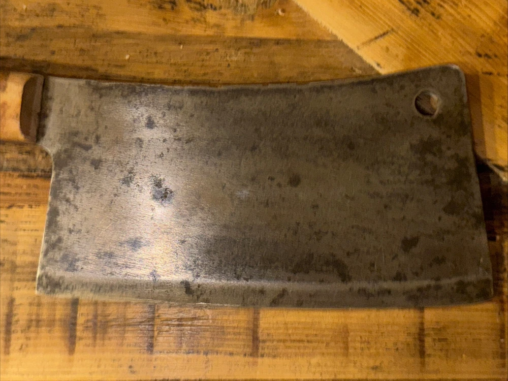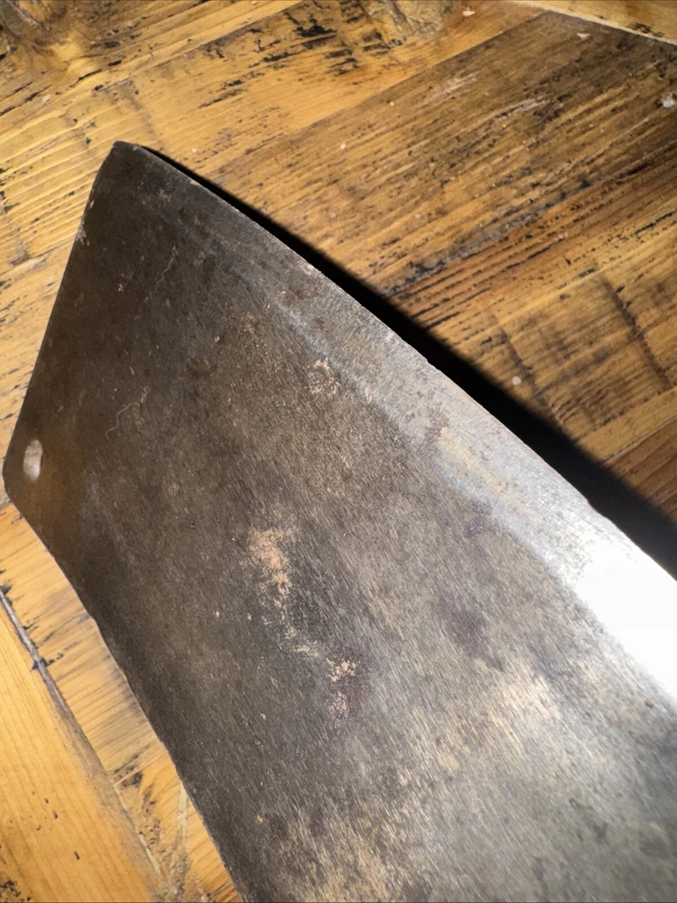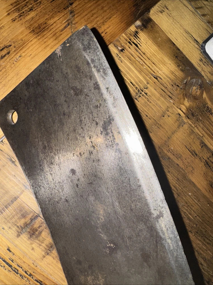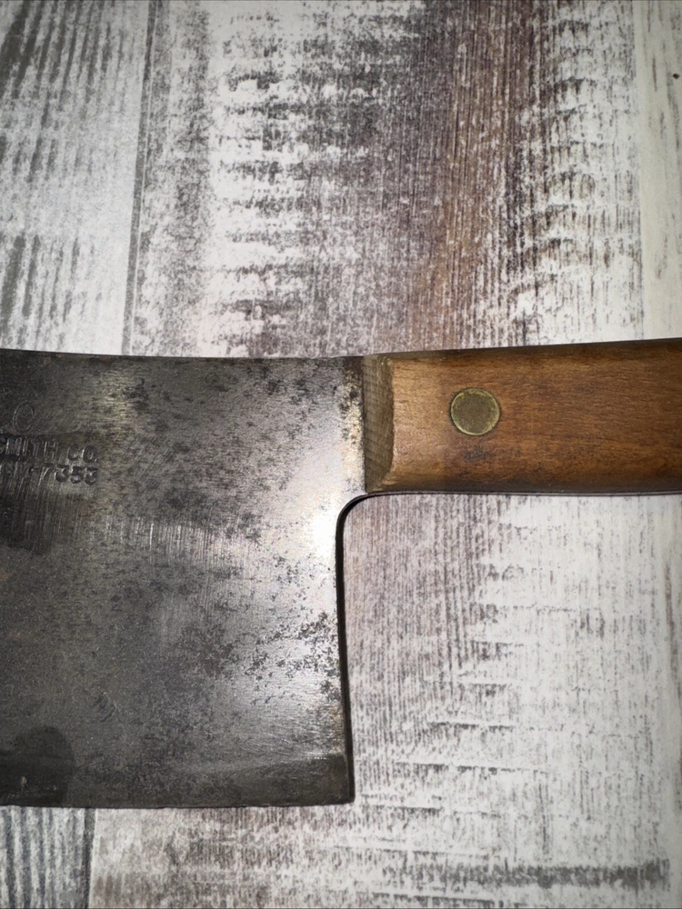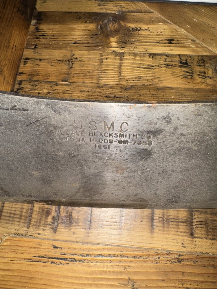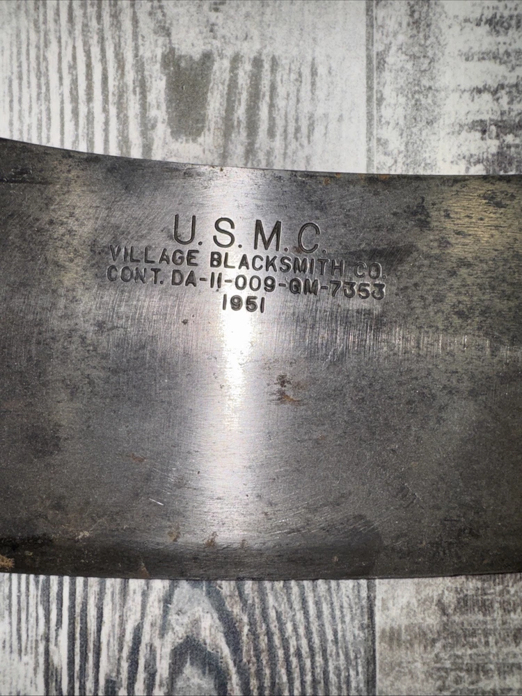 What do I know about meat cleavers? Not much. Here are the details as I see them: This cleaver has the date 1951 engraved on the blade. The blade is engraved with: (as you will see in the pictures) U.S.M.C., Village blacksmith Company CONT.DA-N-009-OM-7353 1951 The overerall length is approximately 14 inches and is 4 inches at the wide end. The wooden handle is sturdy and the metal blade tang extends all the way through the handle fastened by three rivets. There is NO crack on the handle. On one side there are 2 rivets missing. The handle is secure. There is no off odor and the handle feels clean and dry--not greasy. If I have missed any important facts, please feel free to ask!