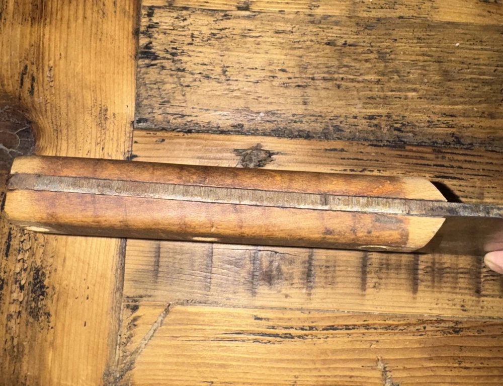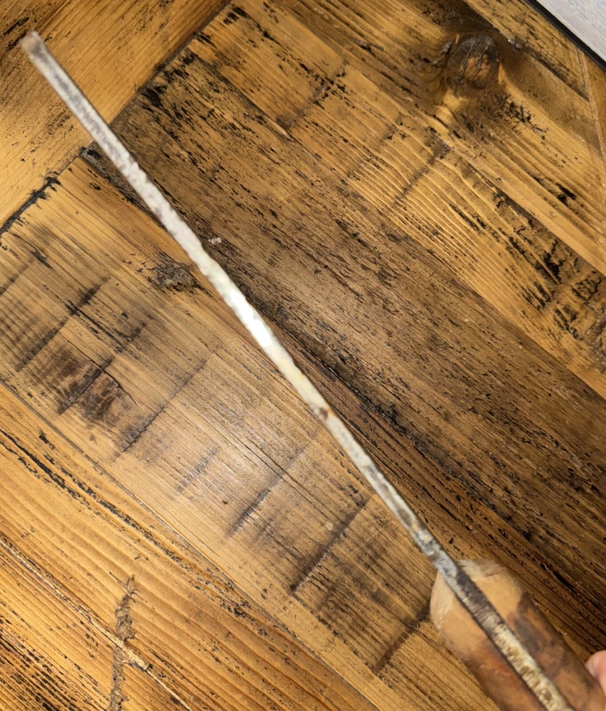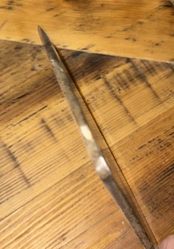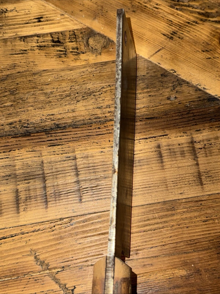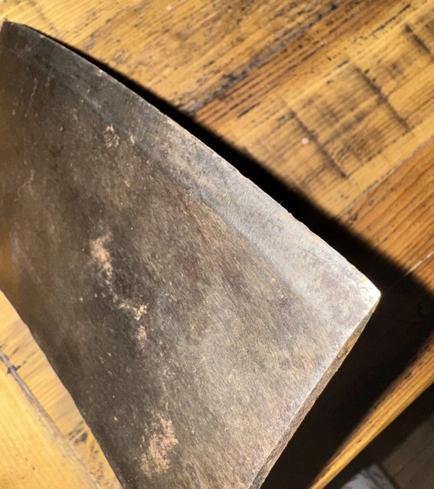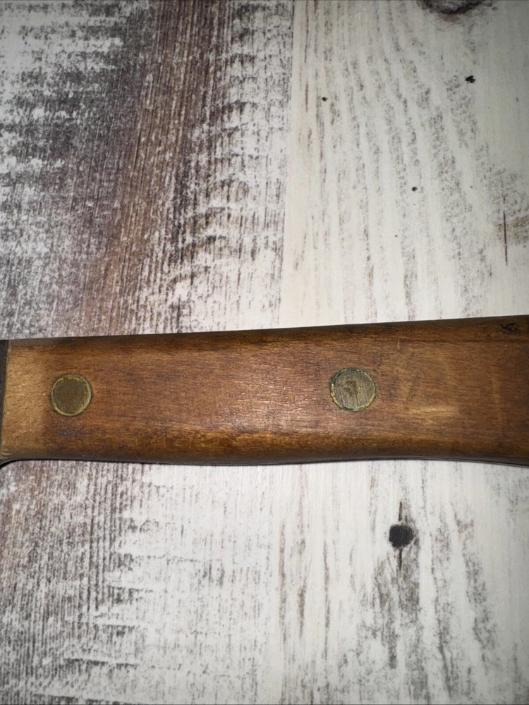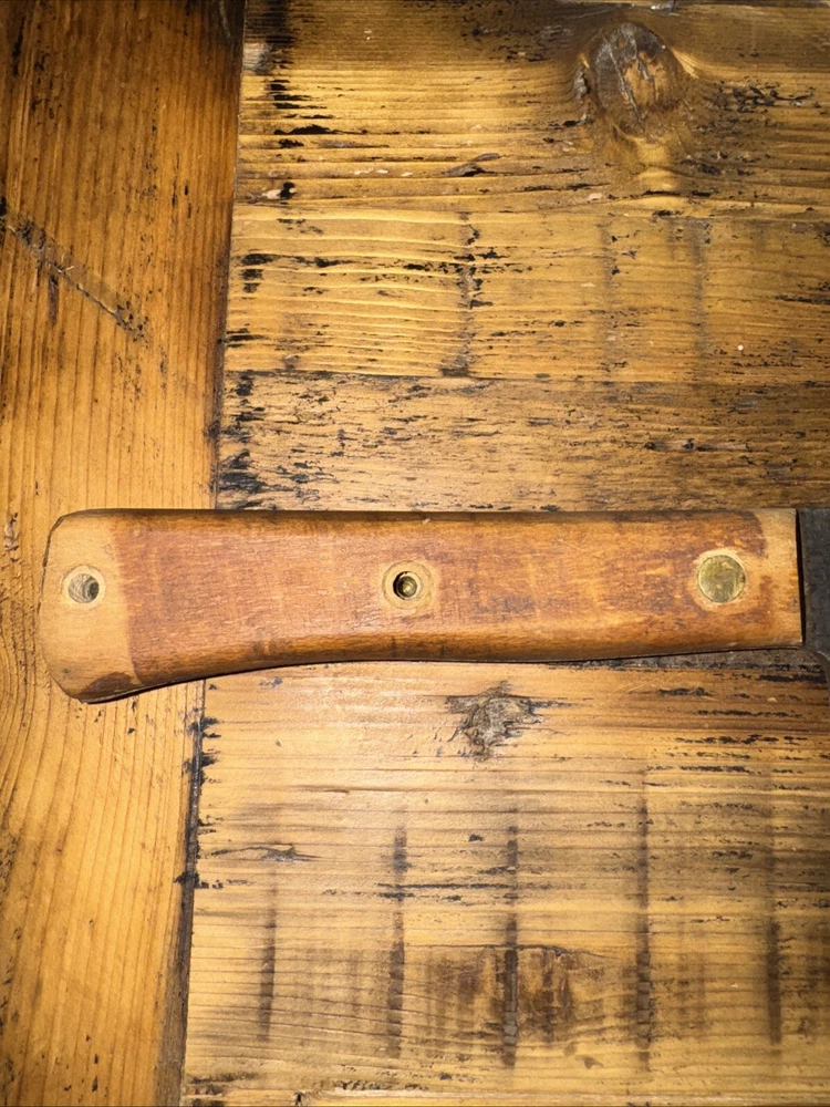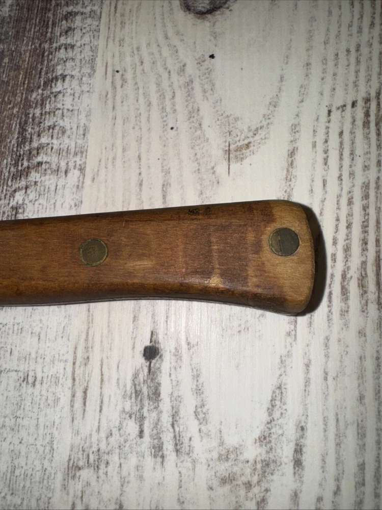 What do I know about meat cleavers? Not much. Here are the details as I see them: This cleaver has the date 1951 engraved on the blade. The blade is engraved with: (as you will see in the pictures) U.S.M.C., Village blacksmith Company CONT.DA-N-009-OM-7353 1951 The overerall length is approximately 14 inches and is 4 inches at the wide end. The wooden handle is sturdy and the metal blade tang extends all the way through the handle fastened by three rivets. There is NO crack on the handle. On one side there are 2 rivets missing. The handle is secure. There is no off odor and the handle feels clean and dry--not greasy. If I have missed any important facts, please feel free to ask!