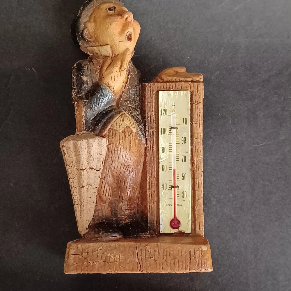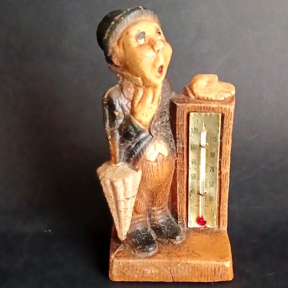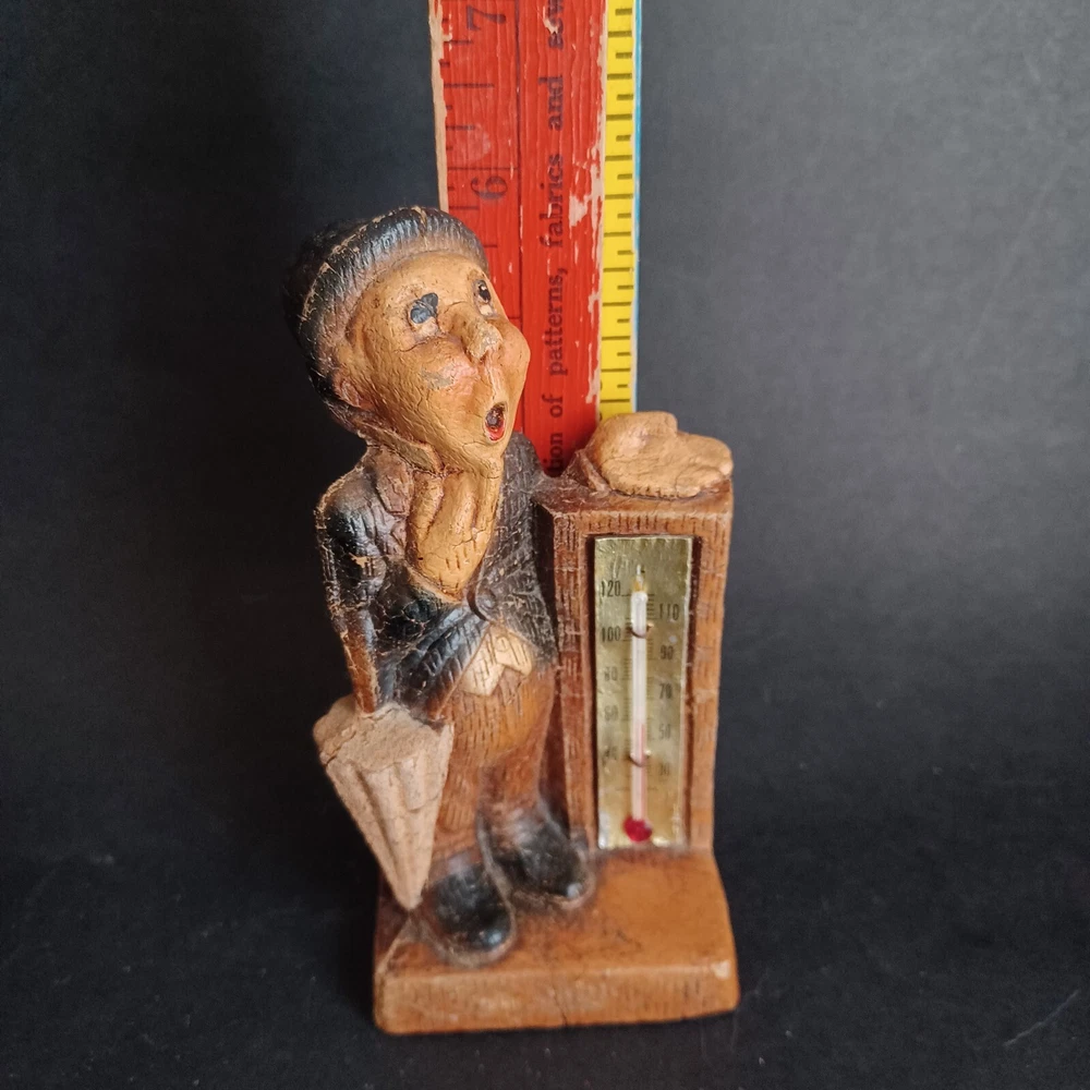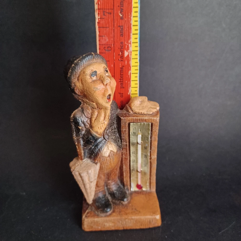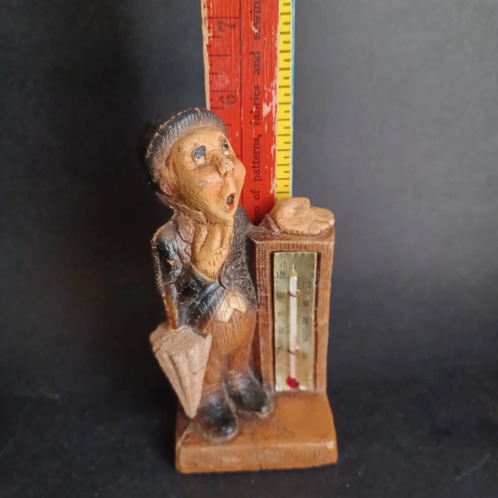 This vintage thermometer from 1952 features a man with a rain umbrella and top hat, made by Multi Products Syroco Wood. It's a great piece for collectors of advertising memorabilia, and would look fantastic in any room. The thermometer is functional and accurate, making it a practical item as well as a decorative one. The attention to detail in the design of the man's clothing and accessories is impressive, and the wood construction is sturdy and durable.