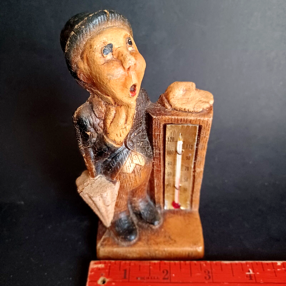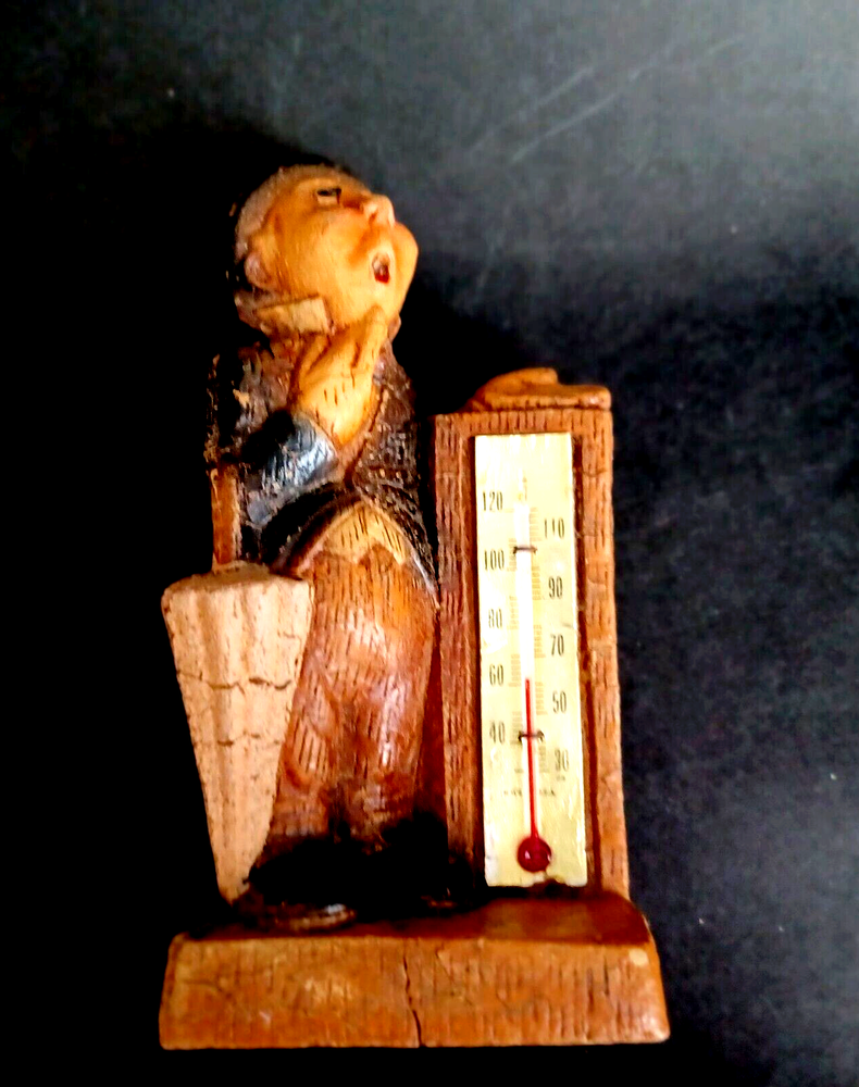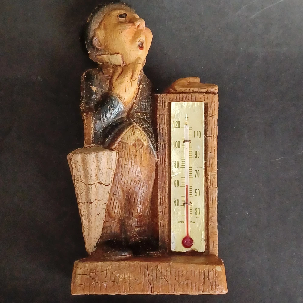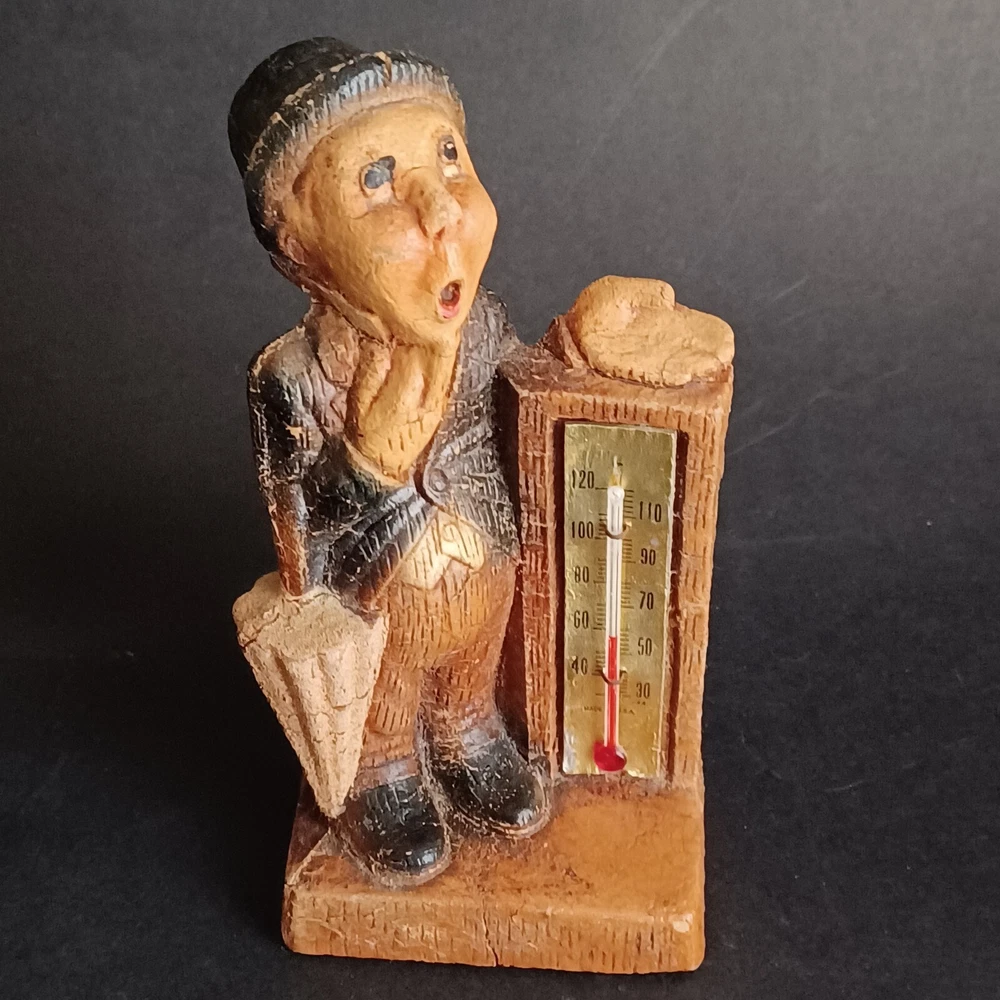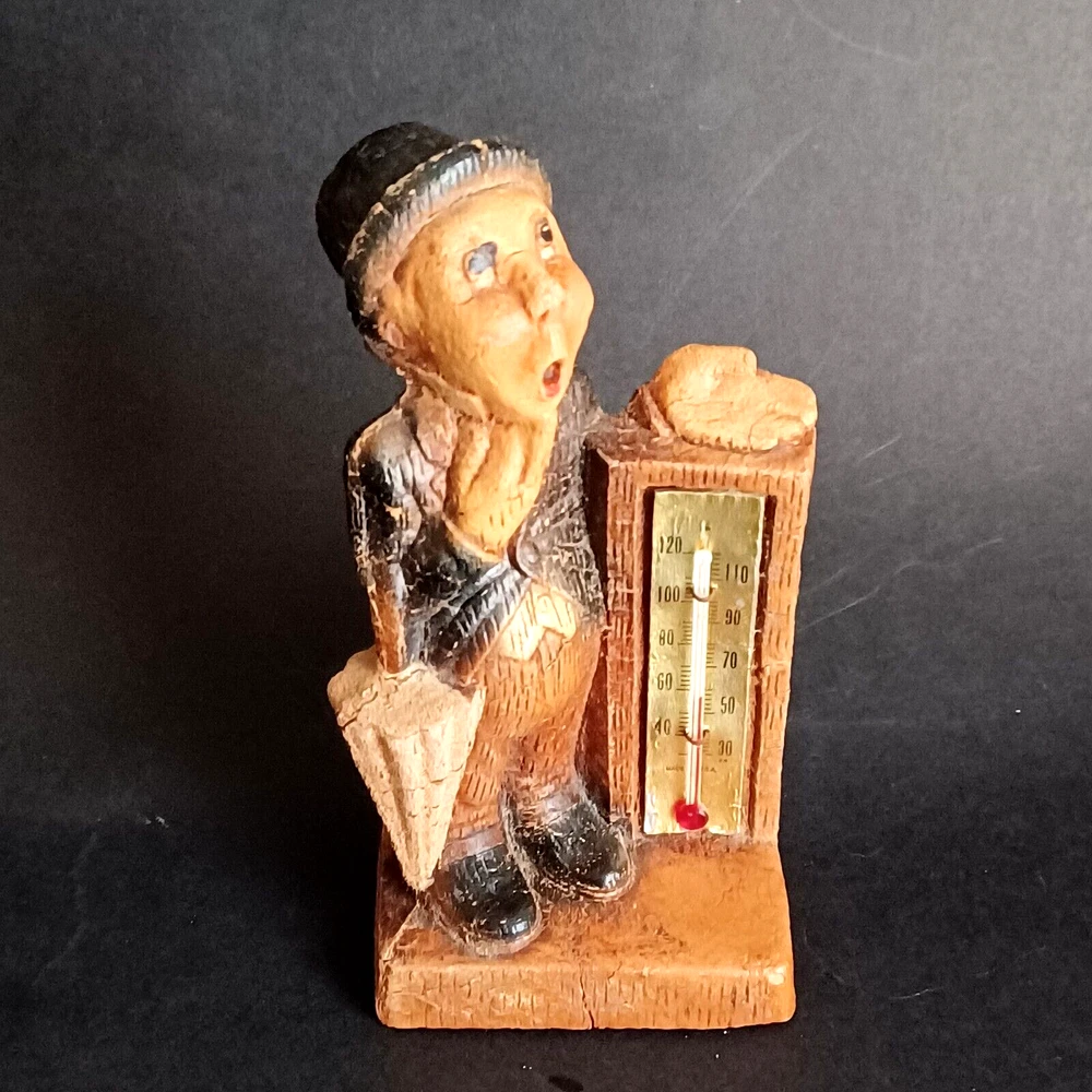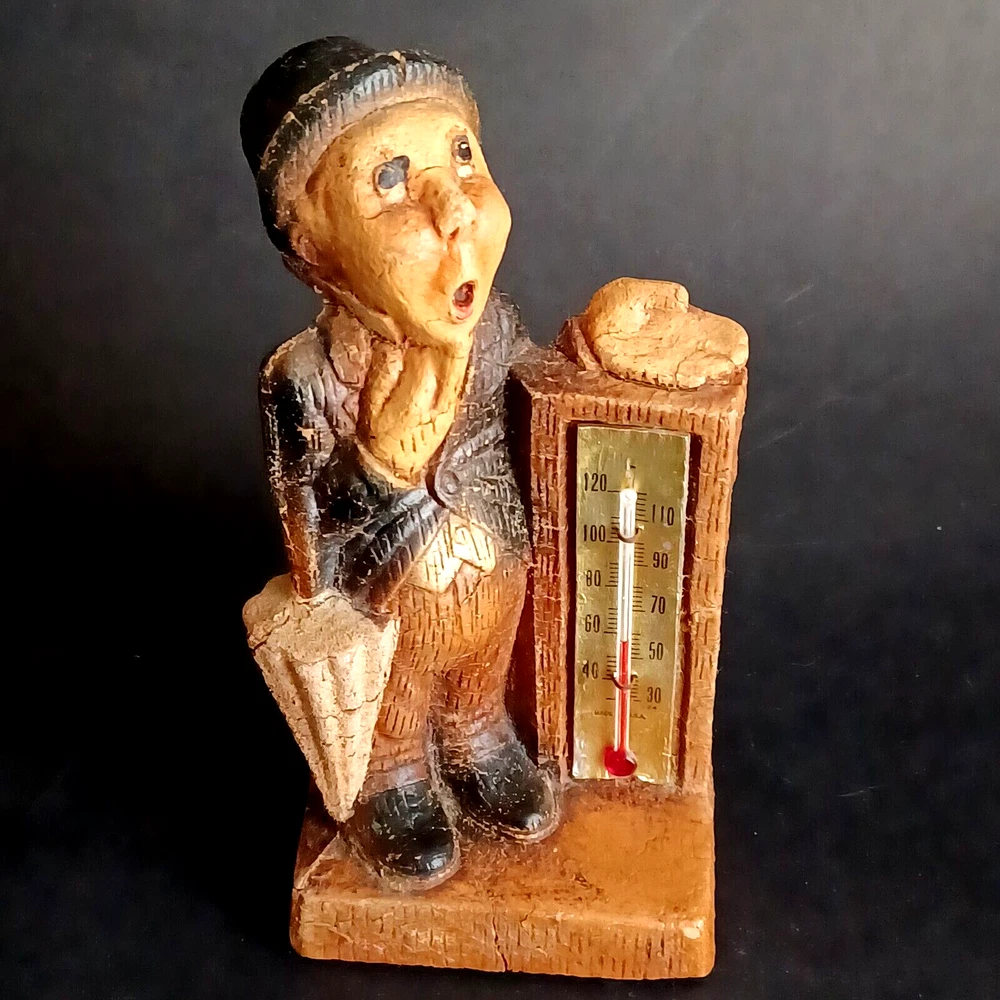 This vintage thermometer from 1952 features a man with a rain umbrella and top hat, made by Multi Products Syroco Wood. It's a great piece for collectors of advertising memorabilia, and would look fantastic in any room. The thermometer is functional and accurate, making it a practical item as well as a decorative one. The attention to detail in the design of the man's clothing and accessories is impressive, and the wood construction is sturdy and durable.