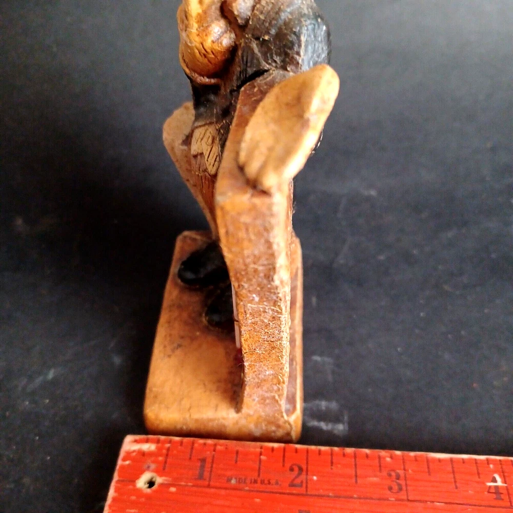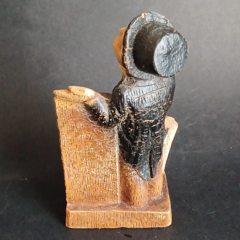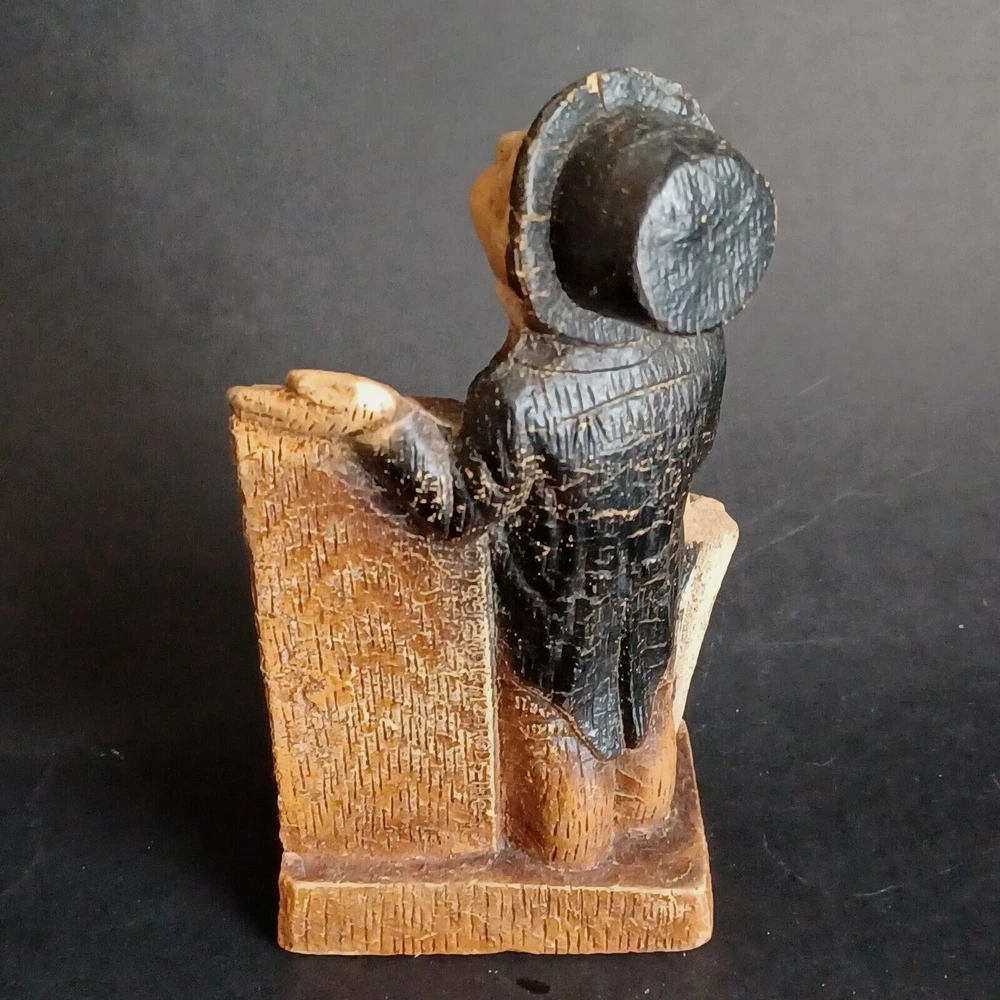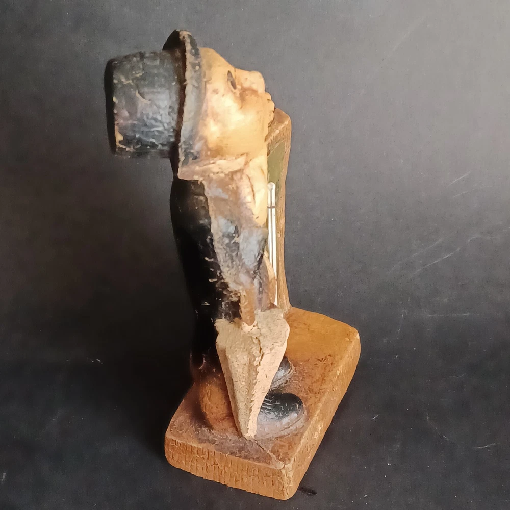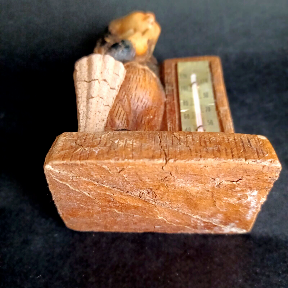 This vintage thermometer from 1952 features a man with a rain umbrella and top hat, made by Multi Products Syroco Wood. It's a great piece for collectors of advertising memorabilia, and would look fantastic in any room. The thermometer is functional and accurate, making it a practical item as well as a decorative one. The attention to detail in the design of the man's clothing and accessories is impressive, and the wood construction is sturdy and durable.