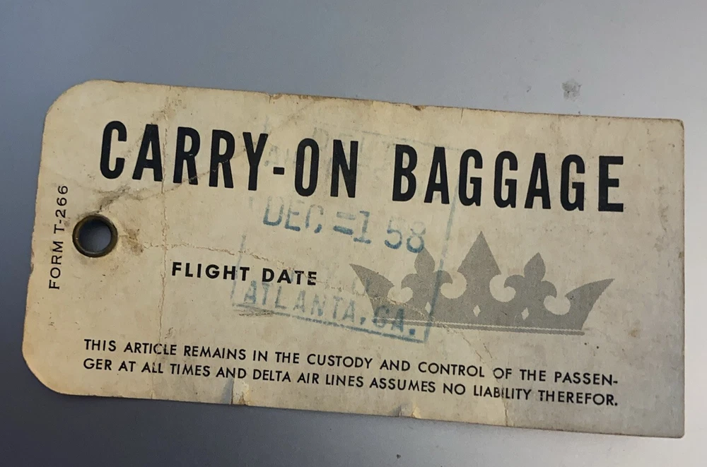 The vintage 1958 Delta Airlines Royal Service Carry On Baggage Tag is a collectible item related to aviation history. This retro airline tag was manufactured in the United States and represents a piece of Delta Airlines' past, specifically from the year 1958. The tag would have been attached to passengers' carry-on luggage during that time, showcasing the style and branding of Delta Airlines from that era. This item serves as a nostalgic reminder of the golden age of air travel and is sought after by collectors interested in aviation memorabilia.