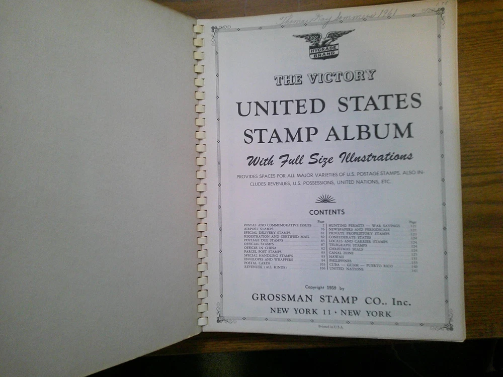 Vintage 1959 Grossman Stamp Co., Inc. The Victory United States Stamp Album With Full Size Illustrations spiral bound hard cover, good vintage condition, as pictured I will combine and reduce shipping costs whenever possible. Most items are second-hand and I cannot guarantee they have not ever been exposed to smoke or pets.