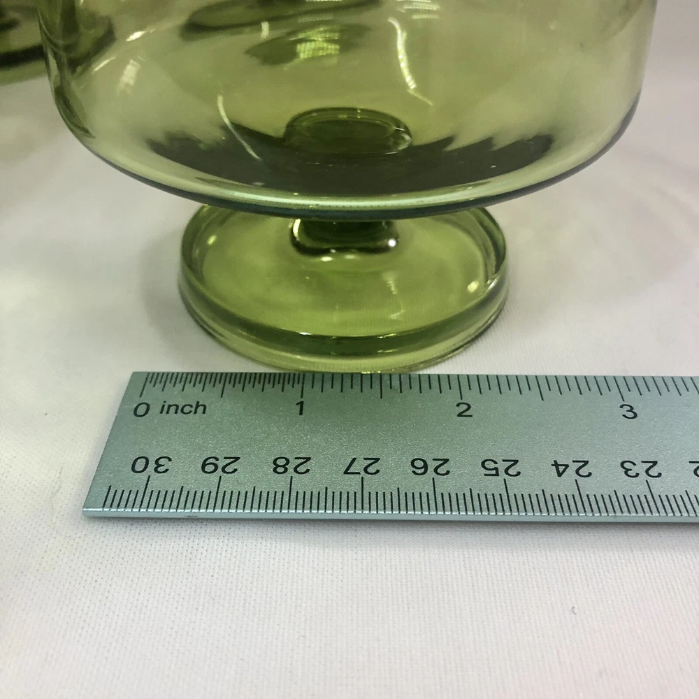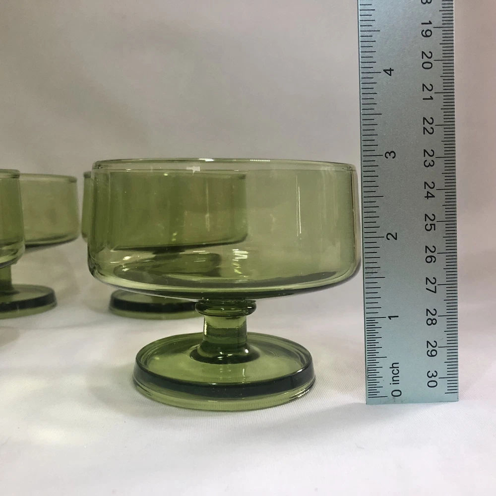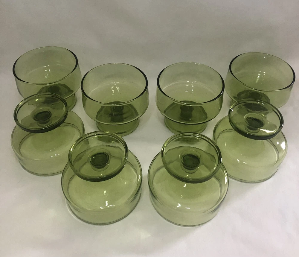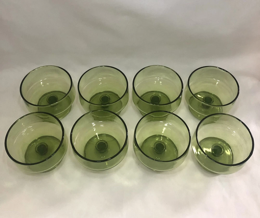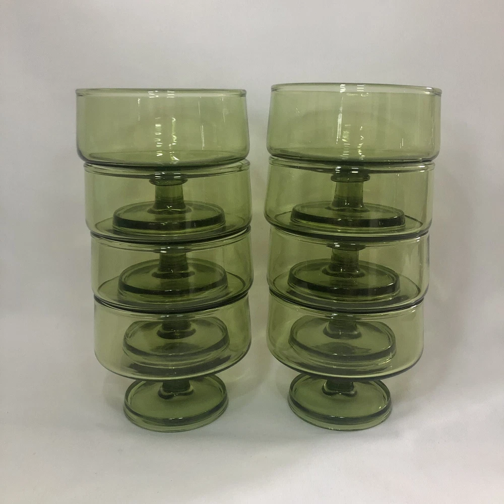 These are eight lovely little mid century dessert cups made by Anchor Hocking. The Finlandia line is a stunning avocado green glass set, smooth and free from imperfections. Each one is 3” tall with a 3.5” diameter cup sitting upon a footed base. They do stack inside one another if needed.
