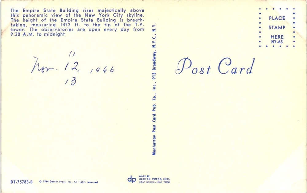 Vintage Postcard- The Empire State Building, New York. 1960s