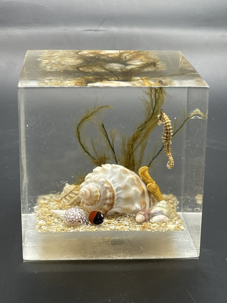 This is a vintage 1960's Mid Century Clearfloat Lucite Seashell Seahorse Paperweight. This paperweight features a clear Lucite material with a sea horse theme, showcasing the art glass production style and studio crafted technique. Made in the 1960s, this unique piece of decorative pottery and glassware is a charming addition to any collection.
