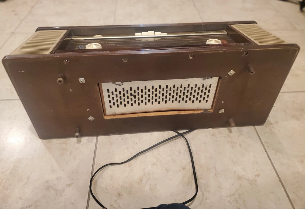 Vintage 1960s Philips Bi-Ampli 4 Band FM/AM STEREO Tube Radio B7X14A Reverbeo (Tested) Condition is Good to Fair Vintage and works. Has the ability to play AM/FM radio. Pressing the top sound adjustment buttons, I can hear slight differences in radio tone. Fidelita and Parola buttons makes some squeaking staticky sounds, while the Reverbeo amplifies the bass sounds. Pressing Stereo and Mono top buttons don't seem to make any difference in the sound. So I would assume that some tune up by a radio expert needs to be done on certain top sound buttons. This was an estate find, and I'm describing as best to my knowledge. Please watch the video. There is some chipping on the wood and dusty interior. All the parts inside look original and old. Aside from some a few issues mentioned, radio works very well. With the right parts and a professional technician, this can easily be fully refurbished. Philips "Bi-Ampli" 4-band FM/AM STEREO tube (valve) radio B7X14A 10 tubes - 2 speakers - stereo amplifier - reverb spring - EL backlit dial - desirable collectable - great sound Make and model Philips, B7X14A/64, Made in Holland, 1961-'63. Top of the line model; very hard to find this /64 version. Features include, Macore hardwood veneered cabinet with high gloss finish Large, EL (electro-luminescent) backlit station dial with separate pointers for AM and FM ranges LW/MW/SW/FM bands. FM frequency range ca. 87.5-104 Mhz Ten tubes: ECC85, ECH81, EF89, EBF89, EM80, EAA91, ECC83, 2x EL84, EZ81 Reverb (echo) spring for enhanced 'Concert Hall' sound Tape and Phono inputs (stereo!) Stereo amplifier with two Philips 800 Ohms double-cone AD3800AM speakers Volume control, bass and treble tone control knobs, push button tone control presets ('Fidelita', 'Parola'). Balance control thumb wheel, mono/stereo and Reverbeo push buttons. Built in ferroceptor antenna for MW/LW reception, connectors for external FM and AM antennas. 'Magic eye' fluorescent tuning indicator.