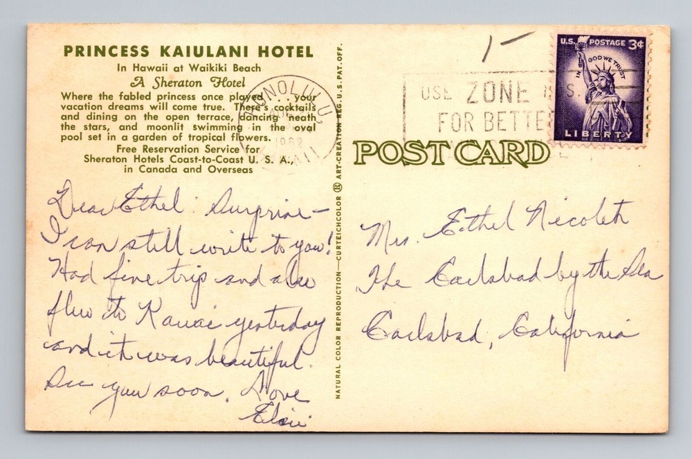 Vintage 1962 Princess Kaiulani Hotel Waikiki Beach HI Postcard Antique Collectible