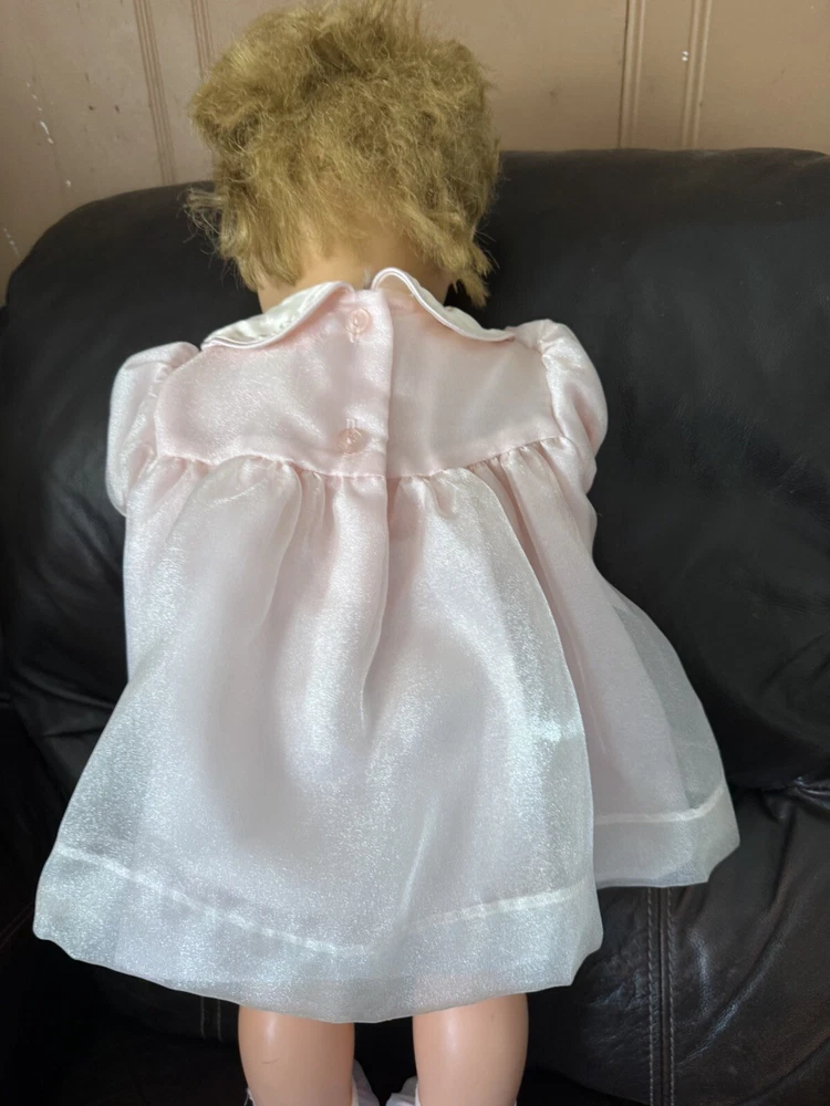 This vintage 1964 Horsman Thirstee Walker doll baby/toddler TB-26 is a rare find for collectors and doll enthusiasts alike. With a beautiful blonde straight hair and blue eyes, this gender-neutral doll has a light complexion and is made of high-quality vinyl material. Has a crack on neck and and hair is not great sold as is The doll's unique features include a Thirsty character and a vintage design, perfect for those who love to collect vintage dolls. This original Horsman doll was manufactured in the United States in 1964, making it a rare and valuable addition to any collection.