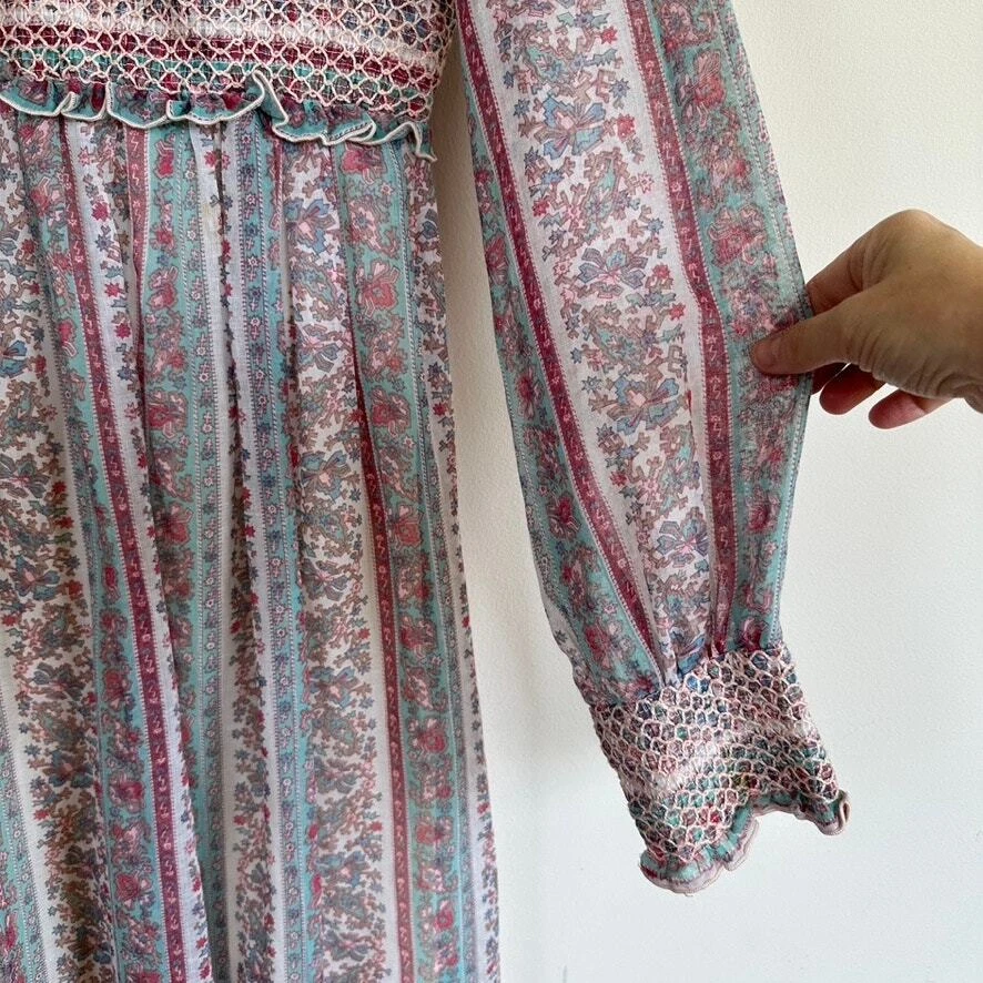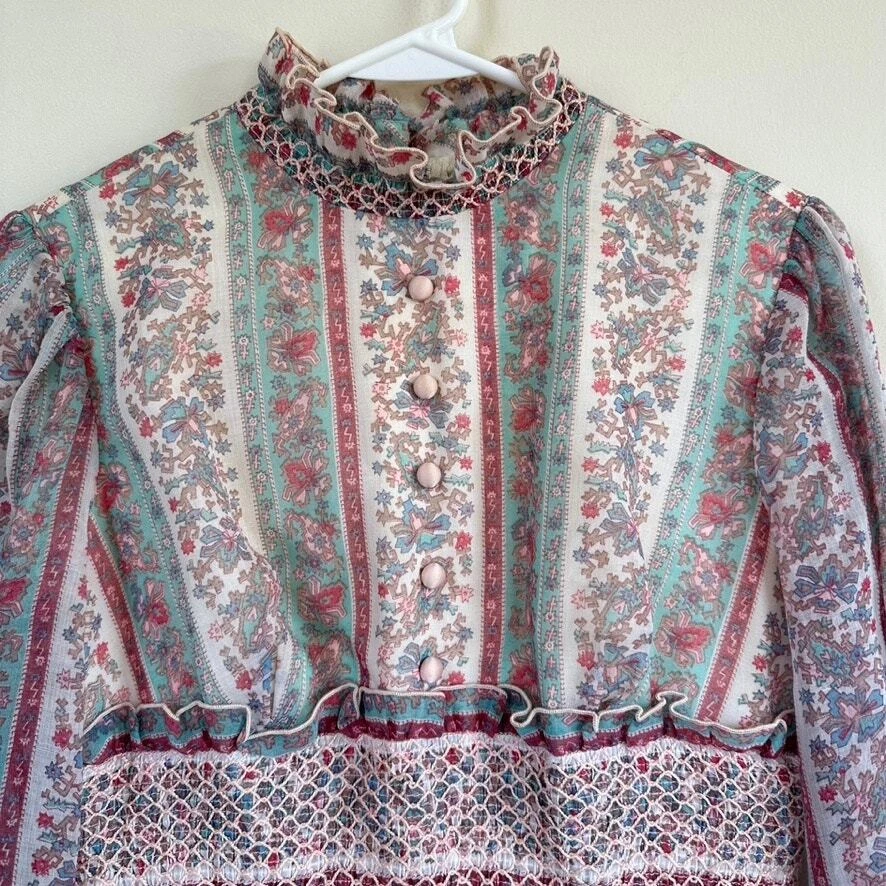 Vintage 1970 Cottagecore Victorian Maxi Dress Prairie Floral Smocked High Neck. Sheer sleeves with smocked detail on the cuffs. Dress is fully lined, except for the sleeves. Metal zipper on the back. Size: NO SIZE TAG. PLEASE SEE MEASUREMENTS TO ENSURE PROPER FIT Approx. measurements: 17" across (pit to pit), 14 waist, 52" long (shoulder to hem) Condition: Pre-owned good. Pre-loved and in gently used condition. Light wear. A few faint stains on the front, just under the chest. Please see all pics for any wear/condition. cottage, cottagecore, prairie, prairiecore, little house on the prairie, florence welch dress, Victoriana, regency, victorian, romantic