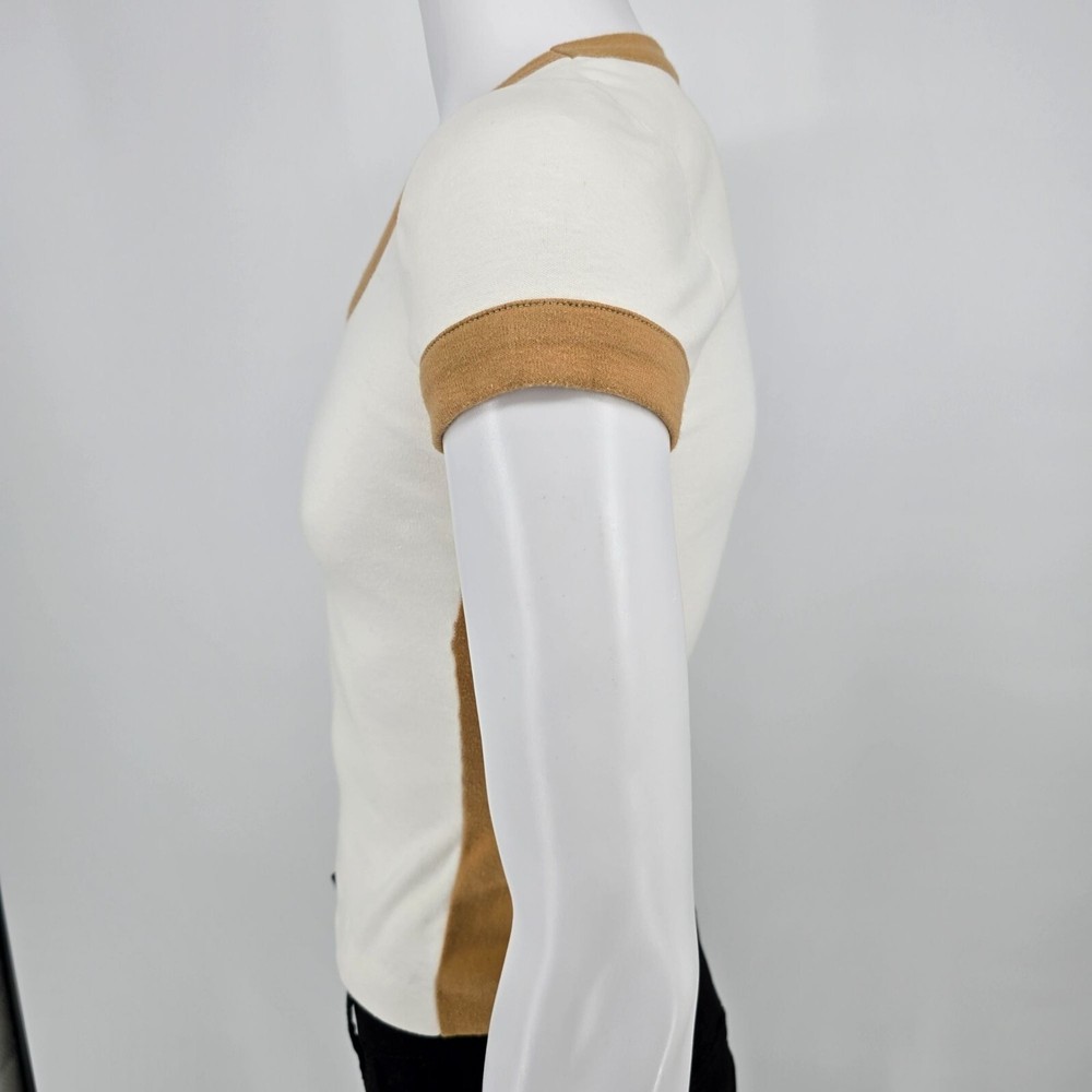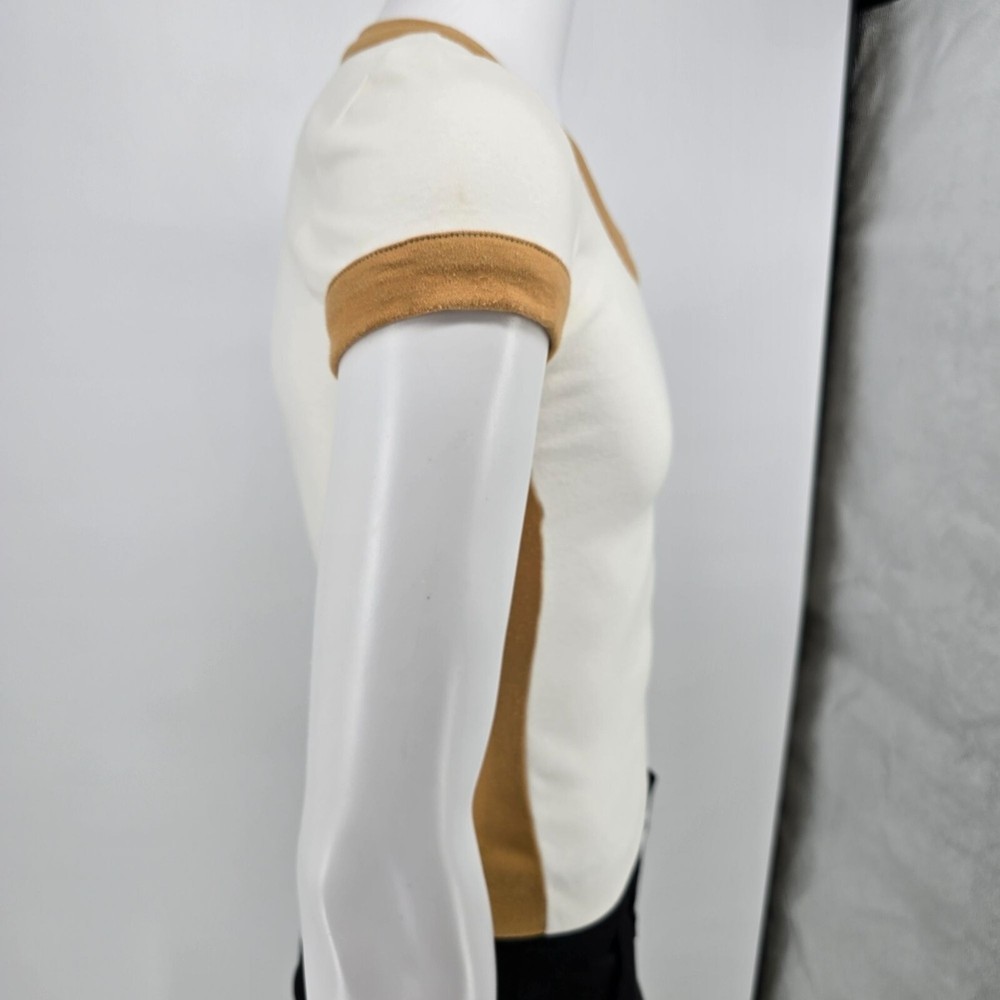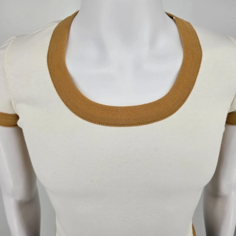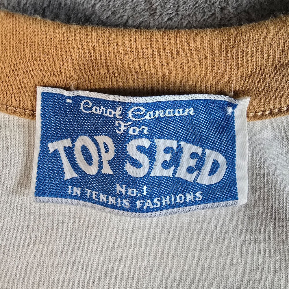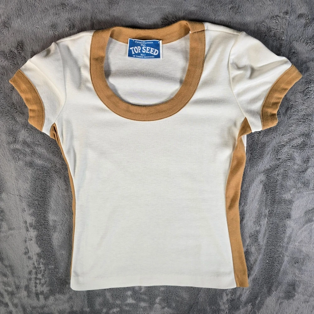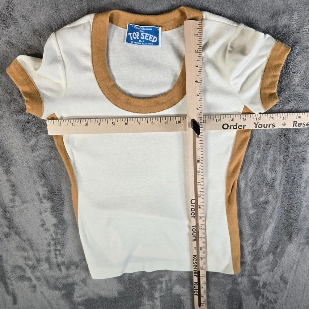 ๐น Item Details: Brand: Carol Canaan for Top Seed No. 1 in Tennis Fashions Material: Unknown (feels like synthetic knit) Color: Cream body with tan ringer accents Decade of Manufacture: 1970s Country of Manufacture: Unknown (almost certainly USA) Notable Features: Single Stitch ๐น Condition Notes: Good to Excellent used vintage condition. No size/materials tag. One loose thread on left side. Light to moderate fabric wear throughout. See photos for details. ๐น Size Notes: Vintage Tag Size: Unknown Modern Measured Size: Women's XS 0-2 (31.5" Chest) ๐น Measurements (Approximate): Chest (pit to pit): 31.5 inches Collar to Hem: 19.5 inches ๐น Shipping & Returns: Ships worldwide from Lexington, KY. Ships within 3 business days of purchase. Returns accepted within 60 days for domestic orders and 30 days for international orders.