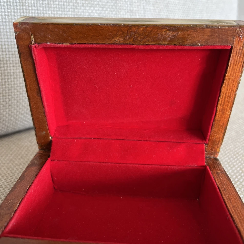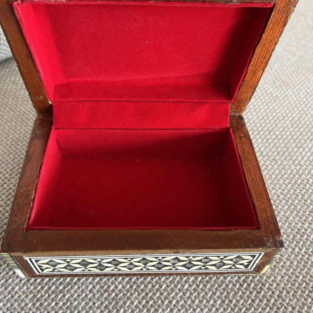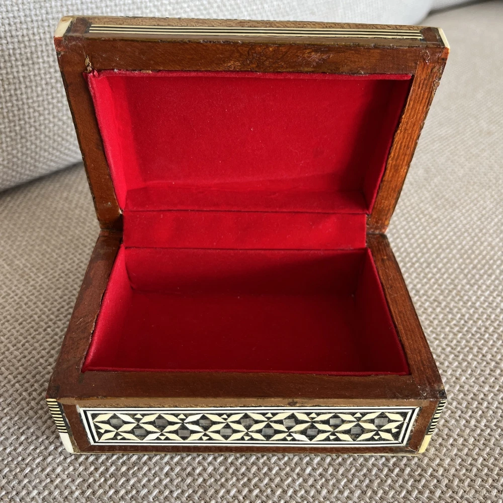Add a touch of vintage charm to your decor with this exquisite 1970s Egyptian Marquetry Trinket Box. Made with intricate wooden base and lined with red velvet, this medium-sized box features a geometric pattern with mother of pearl inlay, making it a perfect addition to any room. The box is handmade, original and in excellent condition, suitable for all occasions and suitable for furniture. The box measures 6.25 inches in length, 4.25 inches in width and 2.5 inches in height, finished with lacquer and cleaned with a damp cloth. Its unique 1970s style, with a boxing subject and key character, makes it a perfect collectible for art lovers. This keepsake box is a must-have for anyone looking to add a piece of art to their collection.