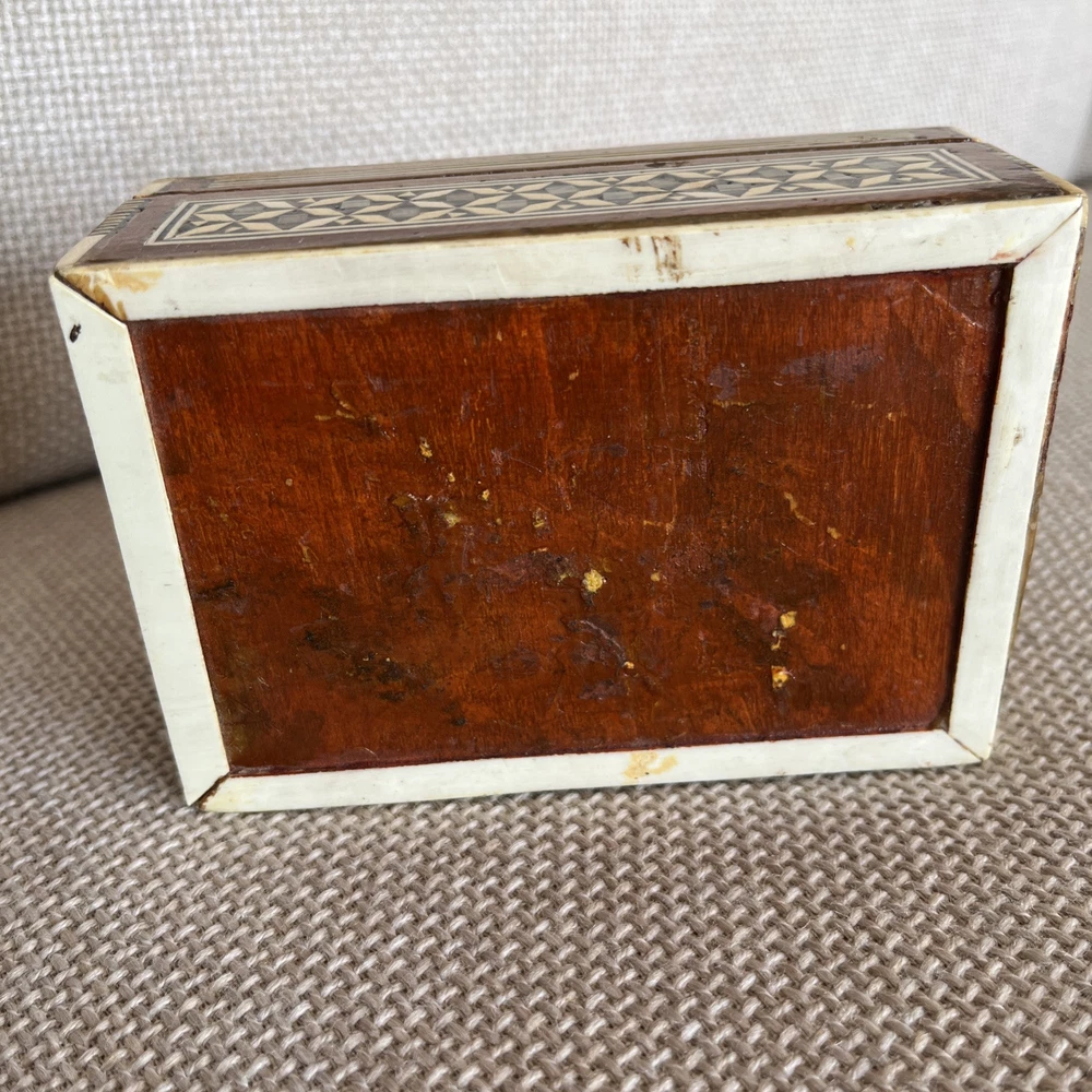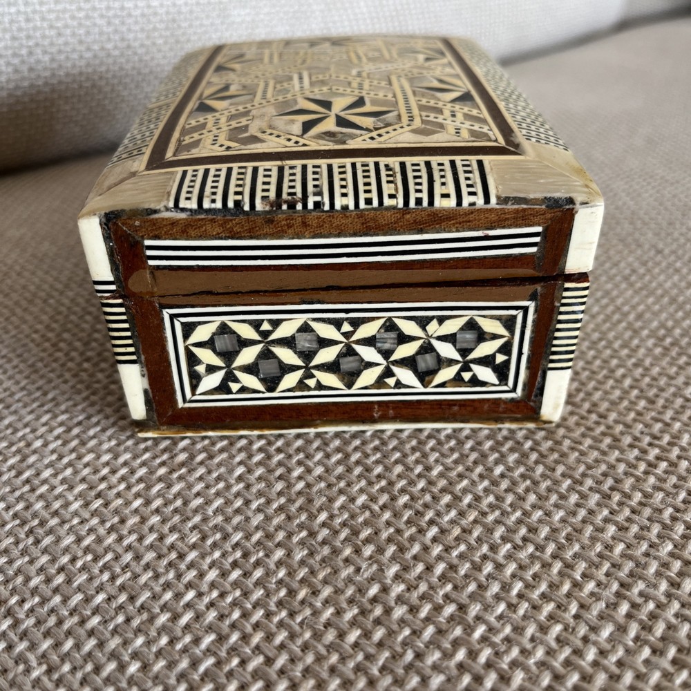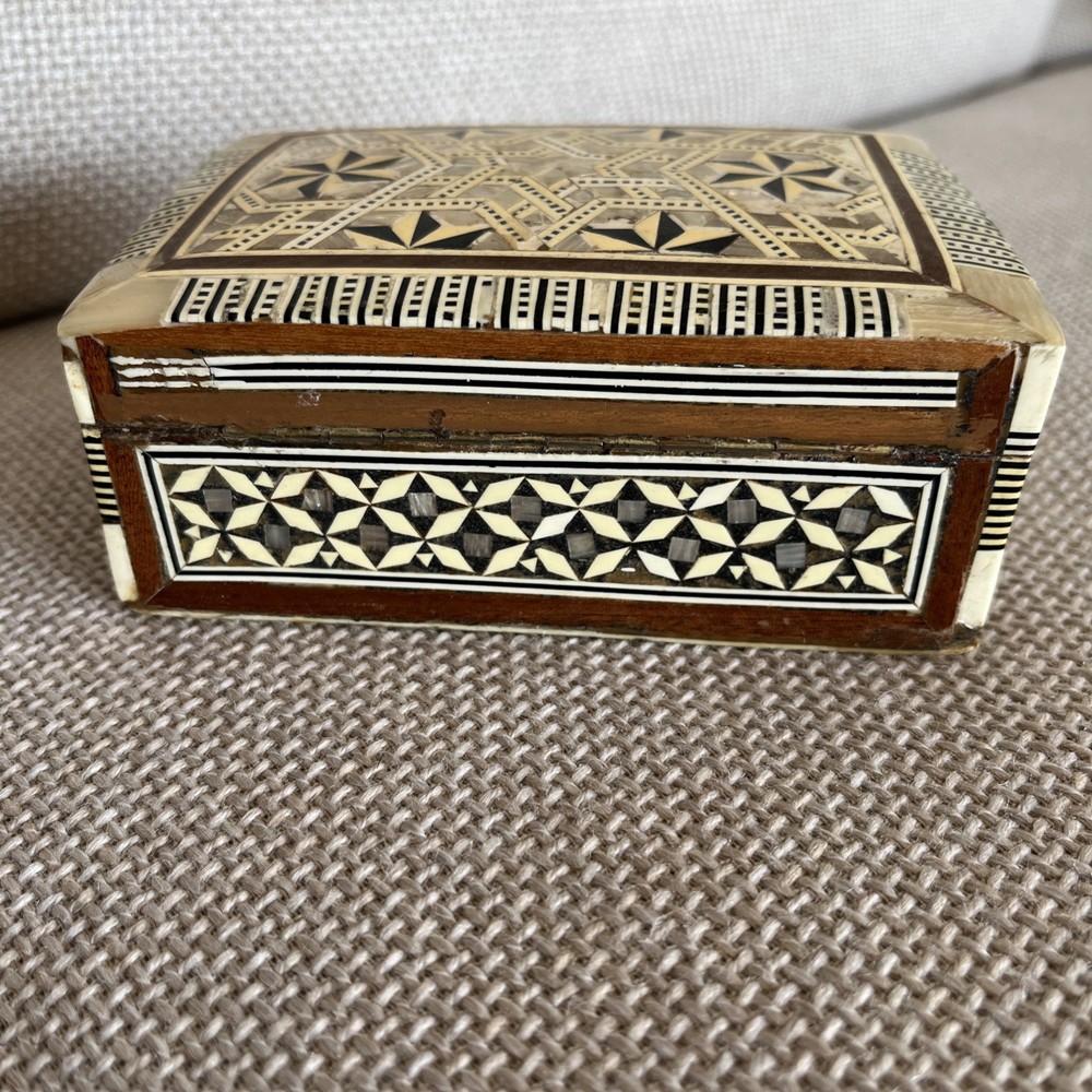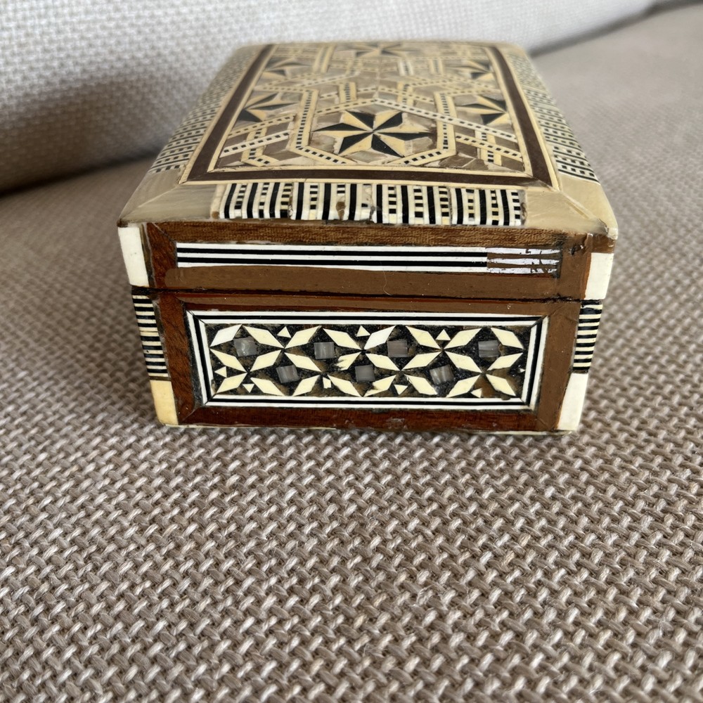 Add a touch of vintage charm to your decor with this exquisite 1970s Egyptian Marquetry Trinket Box. Made with intricate wooden base and lined with red velvet, this medium-sized box features a geometric pattern with mother of pearl inlay, making it a perfect addition to any room. The box is handmade, original and in excellent condition, suitable for all occasions and suitable for furniture. The box measures 6.25 inches in length, 4.25 inches in width and 2.5 inches in height, finished with lacquer and cleaned with a damp cloth. Its unique 1970s style, with a boxing subject and key character, makes it a perfect collectible for art lovers. This keepsake box is a must-have for anyone looking to add a piece of art to their collection.