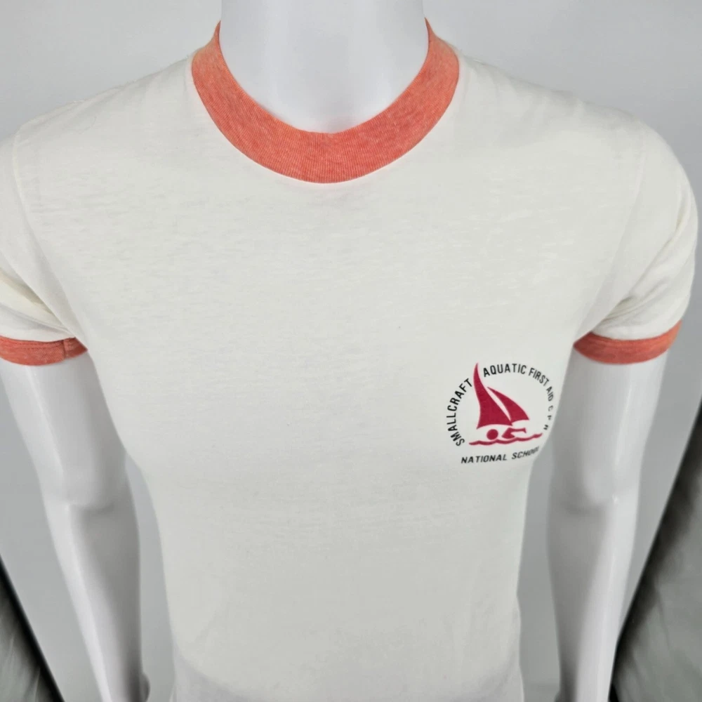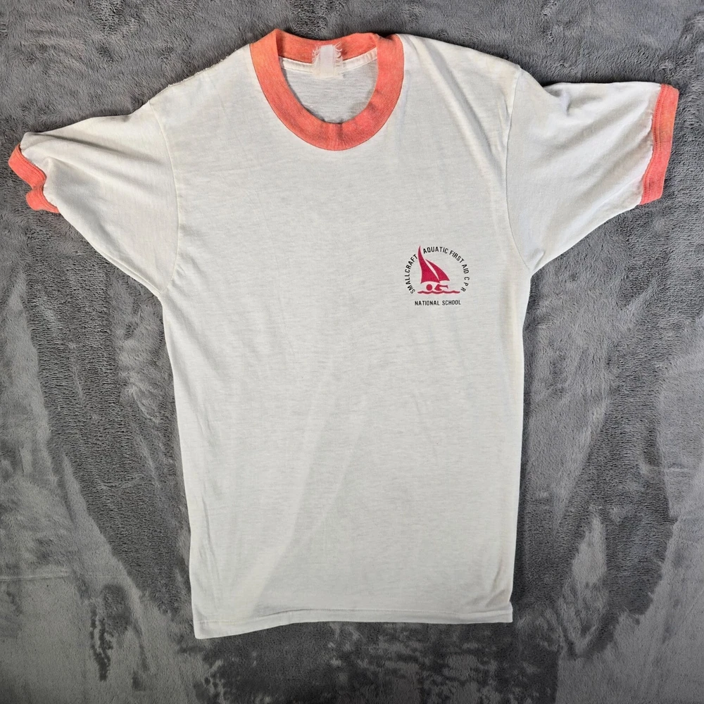 ๐น Item Details: Brand: Unknown (tag illegible) Material: Unknown (likely cotton-poly blend) Color: White with Heathered Orange Ringers Decade of Manufacture: 1970s (most likely date range is late 1970s but early 1980s is also a possibility) Country of Manufacture: Unknown (but almost certainly USA) Notable Features: Ring collar and cuffs, single stitch hem ๐น Condition Notes: Good used vintage condition. Tag illegible. Multiple small stains on back of shirt in middle. Deep vertical fold lines in the middle of both the front and the back of the shirt. Light to moderate fabric wear throughout. See photos for details. ๐น Size Notes: Vintage Tag Size: Unknown Modern Measured Size: Extra Small (32.5) ๐น Measurements (Approximate): Chest (pit to pit): 32.5 inches Collar to Hem: 25.5 inches ๐น Shipping & Returns: Ships worldwide from Lexington, KY. Ships within 3 business days of purchase. Returns accepted within 60 days for domestic orders and 30 days for international orders.