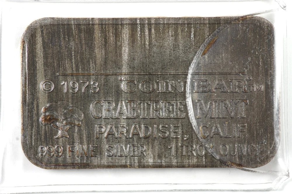 Vintage 1973 "Coin Bar" Crabtree Mint 1 Troy Oz .999 Fine Silver Art Bar [17B22] You will receive the exact item(s) shown in the photos. *Shipping is always combined when multiple lots are purchased on the same invoice. The shopping cart should combine automatically at checkout, or we will send an invoice. Please message us if you have any questions or issues. Returns are easy and free if you are unsatisfied with your purchase for any reason. Satisfaction and authenticity guaranteed. Be sure to check out our other listings!