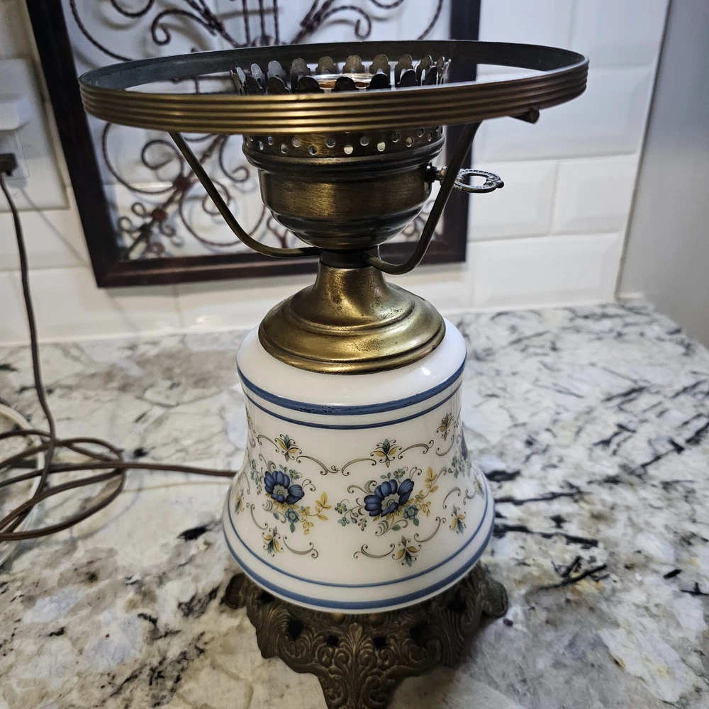 This vintage 1973 Quoizel Hurricane Lamp features an antique design with a shaded globe-shaped shade. The lamp is made of brass and glass, with a mid-century modern style in white color. It is an original parlor lamp with an electric power source, showcasing a blue and white Abigail Adams floral pattern. 3 way Lamp Tested works bulbs not included. Not in the original packaging