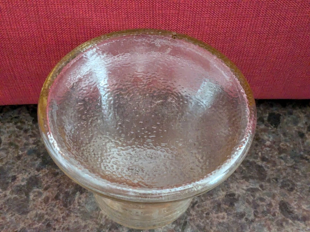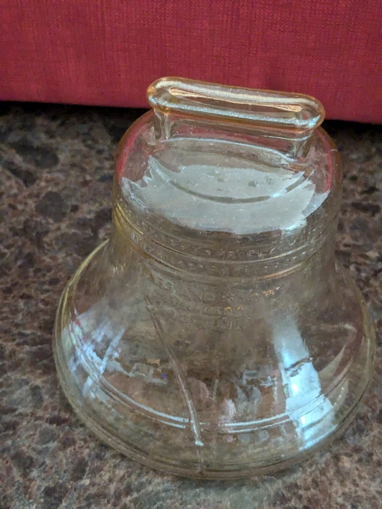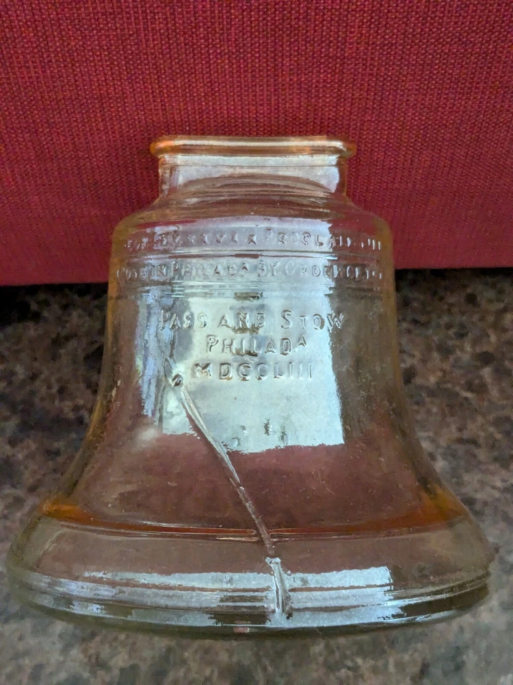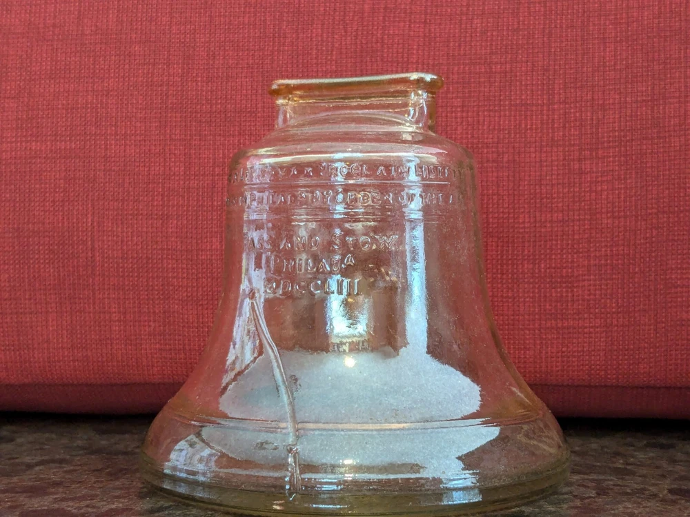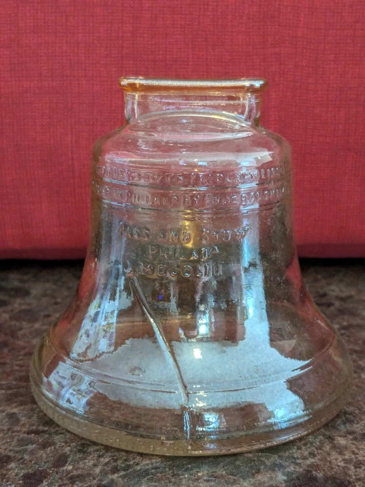 The **Vintage 1976 Bicentennial Glass Liberty Bell Coin Bank** by **Anchor Hocking** is a stunning piece of patriotic memorabilia, beautifully crafted in **carnival glass** that shimmers with a vibrant iridescent finish. Designed in the shape of the iconic Liberty Bell, this coin bank was created to commemorate the **United States Bicentennial** in 1976, making it a significant and collectible item for history enthusiasts and Americana collectors. The **carnival glass** provides a rich, colorful glow, with the bell reflecting shades of purple, gold, and green, giving it a unique and eye-catching appearance. The intricate details of the bell are beautifully etched into the glass, capturing the essence of this historic symbol of American independence. The coin slot is located at the top, while a rubber stopper at the base allows easy access to the coins inside. Whether you’re adding to a collection of vintage glassware or seeking a meaningful piece of U.S. history, the **Bicentennial Glass Liberty Bell Coin Bank** is a perfect choice. Its combination of historical significance, striking **carnival glass** design, and practical functionality make it a cherished keepsake and a standout piece in any collection.