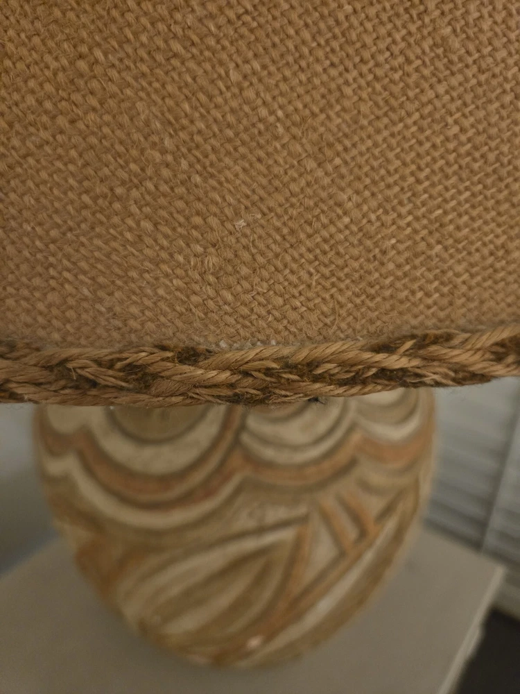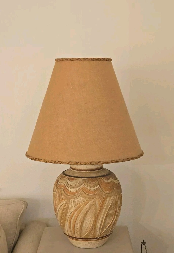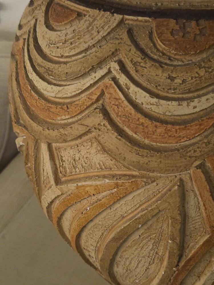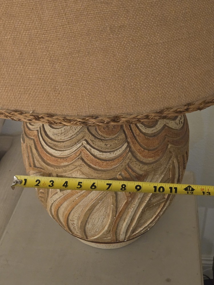 Add a touch of Palm Beach Regency to your space with this exceptional 1977 Casual Lamps of California abstract plaster lamp. The round, textured finish lamp features a multicolored cone shade and knob control, making it a unique addition to any room. The lamp stands 36.5 inches tall and 12 inches in diameter. This vintage lamp is an original piece, manufactured in the United States during the 1970s. The lamp is made of high-quality pottery and ceramic materials. The power source is corded electric with a 3-way switch for easy control Note: Original lamp shade is part of sale price but must be shipped separately for additional shipping costs due to size and to preserve condition of the shade. I have included an extra $25 for shipping to generate a second shipping label.