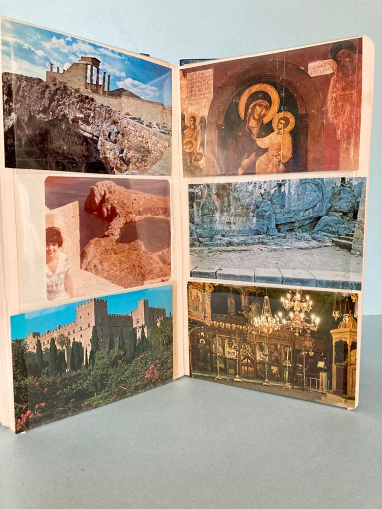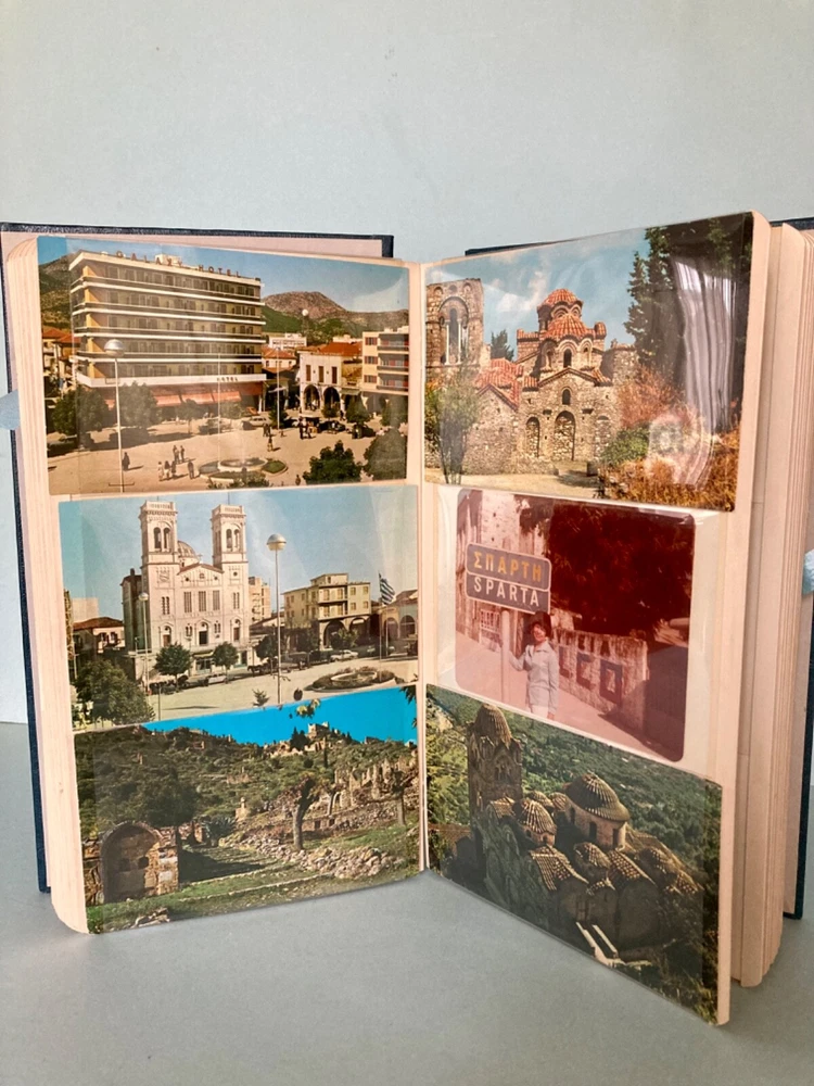 This vintage, 1978, photo album features photographs and over 60, unused post cards, capturing the essence of a family vacation in Greece. The album cover is adorned with Greek dolls, dressed in traditional clothing. It showcases the beauty of famous places, people, and cultures, offering a glimpse into the history and domestic life of the time period. The album is a one-of-a-kind, perfect for collectors. It offers a perspective on family and travel, featuring vibrant color images of cities and towns such as Greece, Corfu and Istanbul. Can you believe the TWA booklet ~ complete with dinner menu, cocktail list and Duty free shop? Wow!! Whether you are an avid traveler, fan of history or simply appreciate the beauty of family, vacation photographs, this vintage album is a must-have addition to your collection. The wonderful, vintage postcards are unused. What a fantastic collection! Take out the personal, family photos, if you wish and replace with your own. Great gift for the World Traveler. Please see photos for measurements and condition.