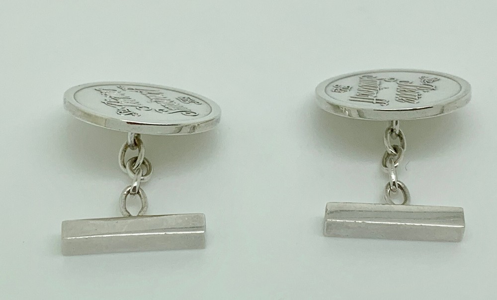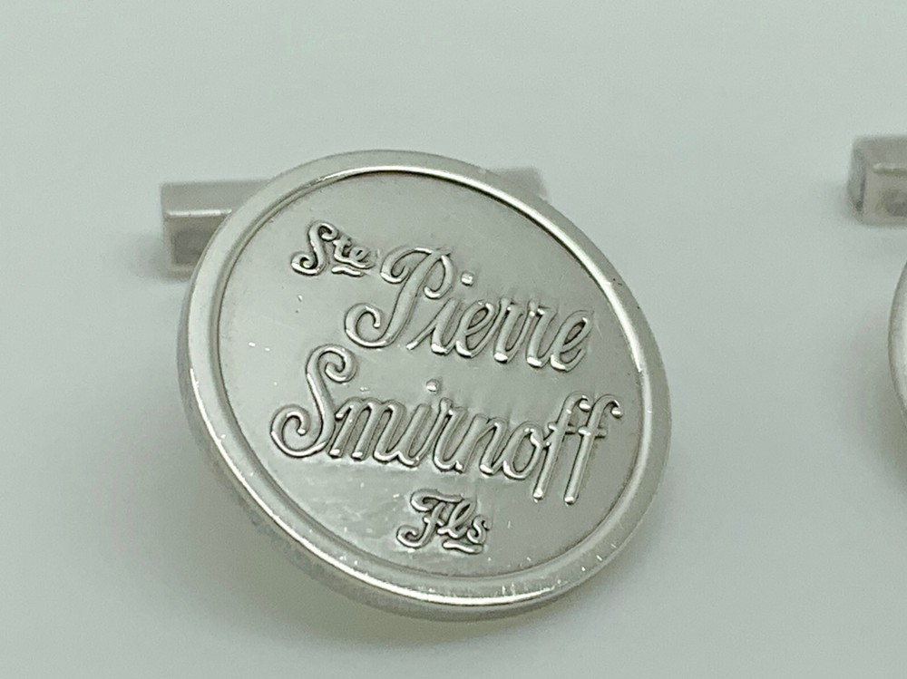 A superb pair of vintage (hallmarked for 1978) sterling silver cufflinks, the design reads Ste Pierre Smirnoff - this is what Smirnoff vodka was branded as in its early days. Probably produced to commemorate an anniversary, nice pieces of breweriana memorabilia. Nice quality weight. Maker/Markings: Marked with english hallmarks - SS, Lion Passant, Leopards Head, Date Letter D for 1978 Condition: Very Good Used Condition, general wear to the silver - Please look at photos Measurements: Face of Cufflink 20mm ~ 3/4" Weight: 14g Combined Shipping on all items SC5667-4 Vintage 1978 English Sterling Silver Ste Pierre Smirnoff (Vodka) Cufflinks