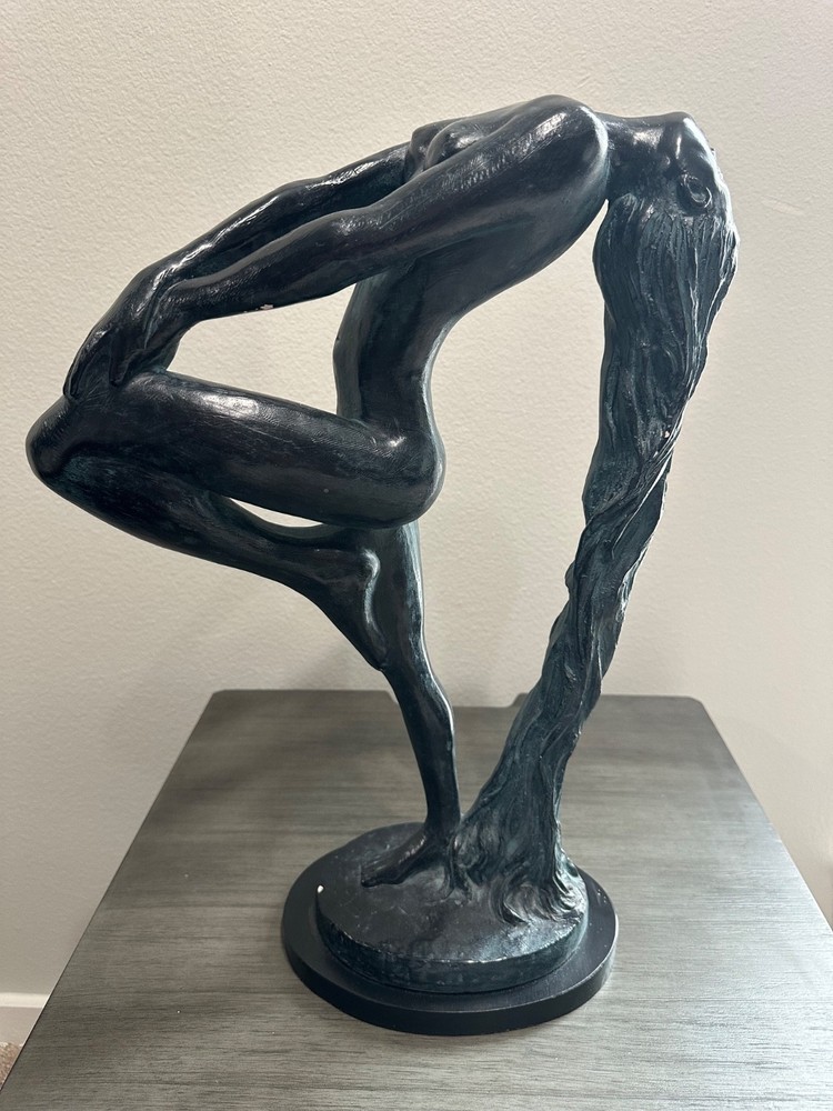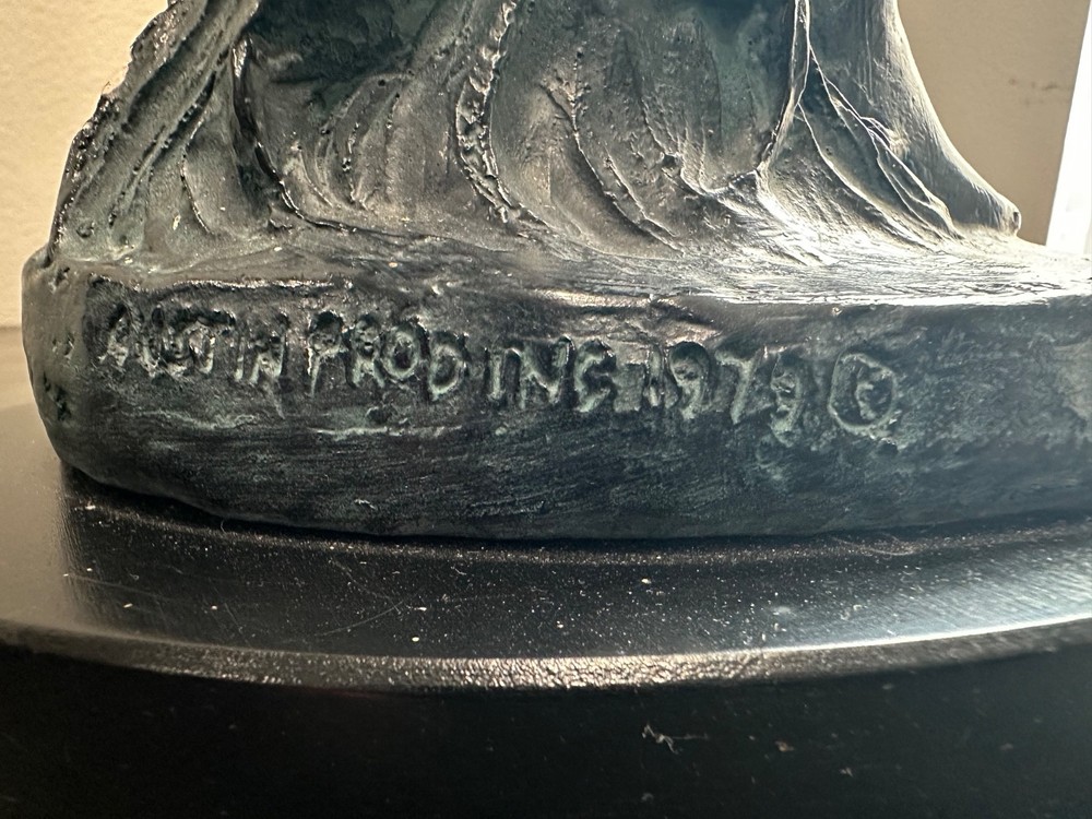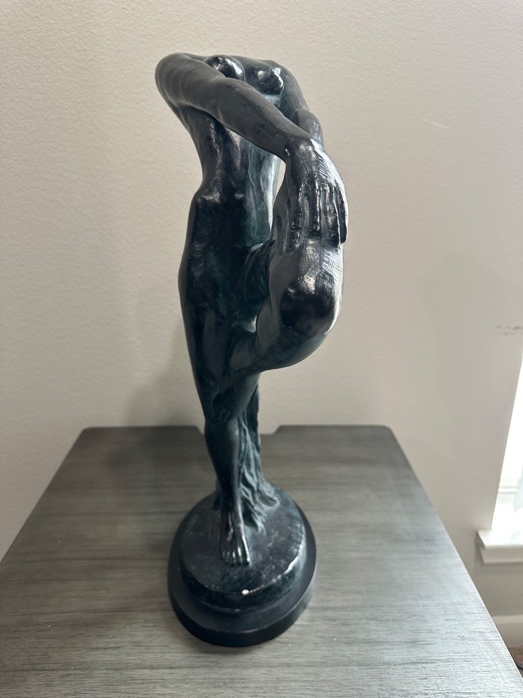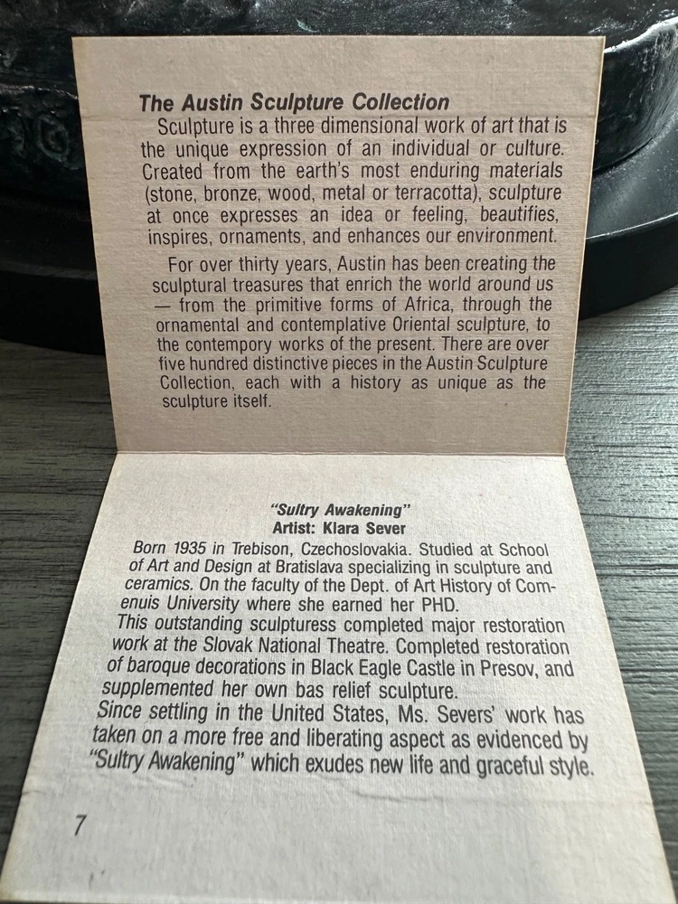Austin Productions Sculpture “Sultry Awakening” 1979 by Klara Sever (signed) VTG. Small chip (white) on base, can be seen in the pictures. Includes the original sculpture description card from Austin Productions. 16" tall x 11" wide x 5" deep.