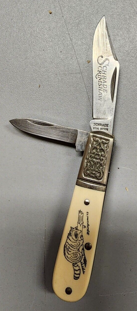 Vintage 1979 Schrade Scrimshaw Raccoon Barlow Knife SC506 USA Made with Sheath