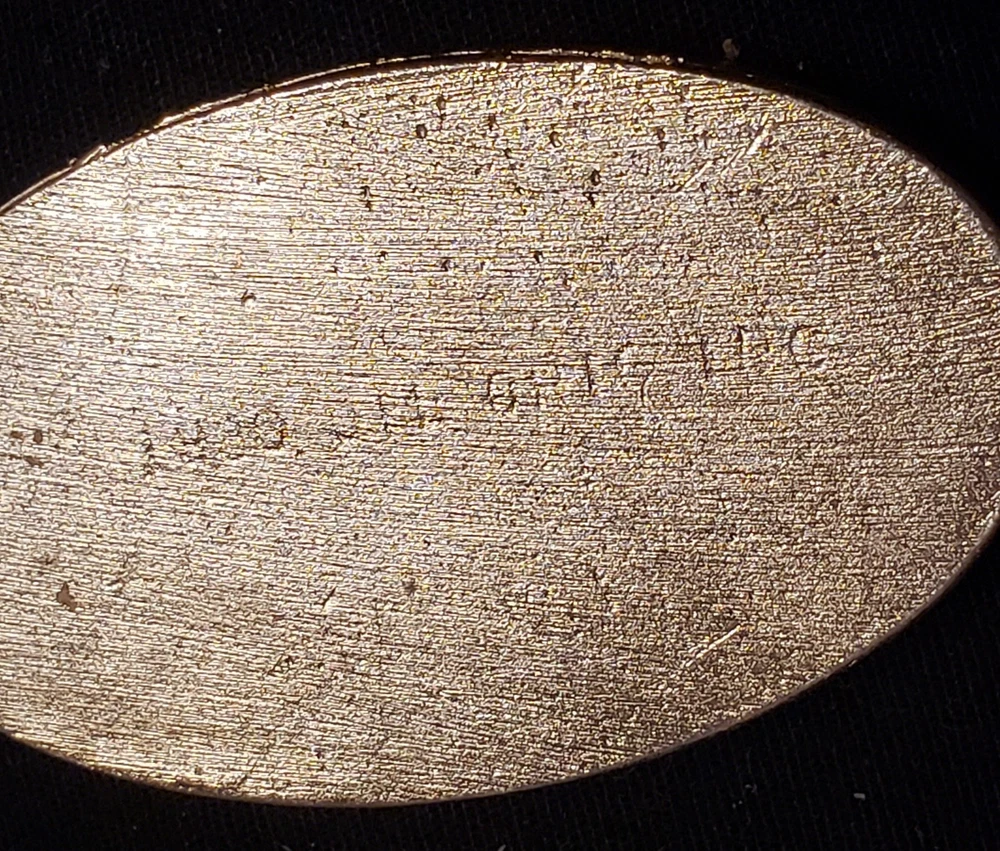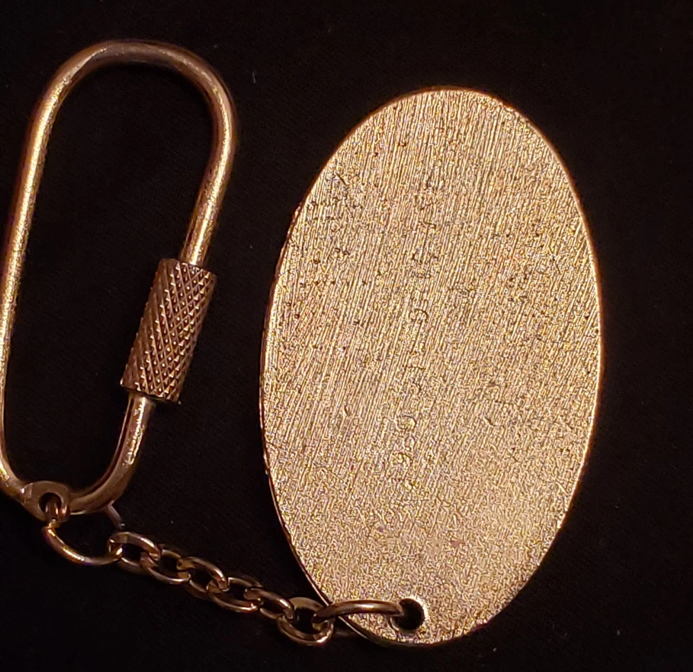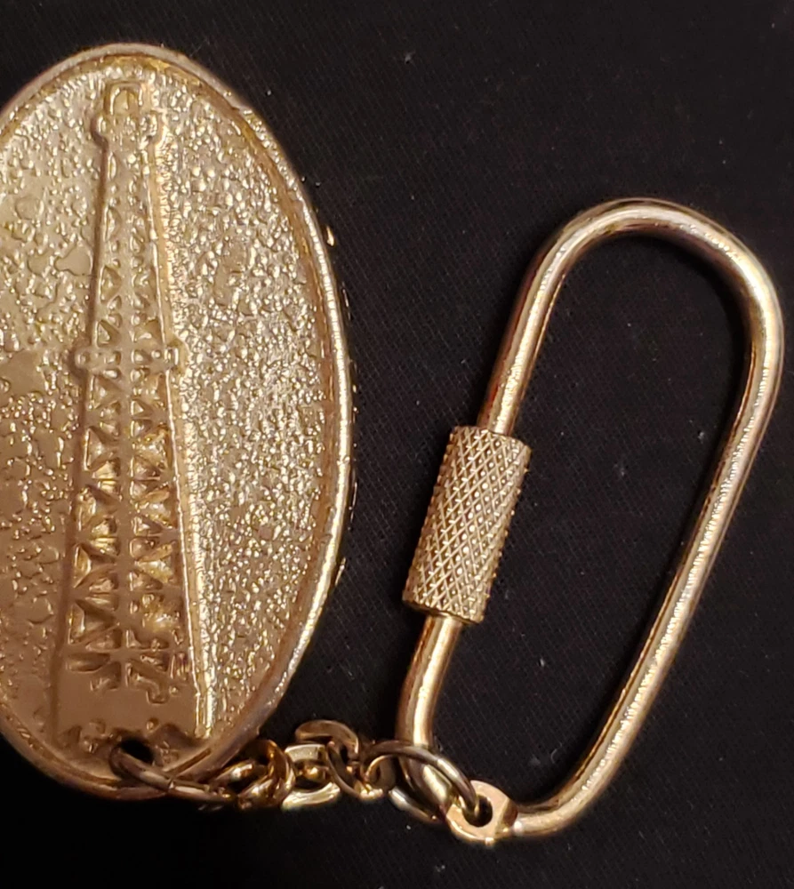 This vintage 1980 key chain features a gold color oil rig design with a detachable keyring and engraving. It is made of stainless steel and is part of the oil industry character family.