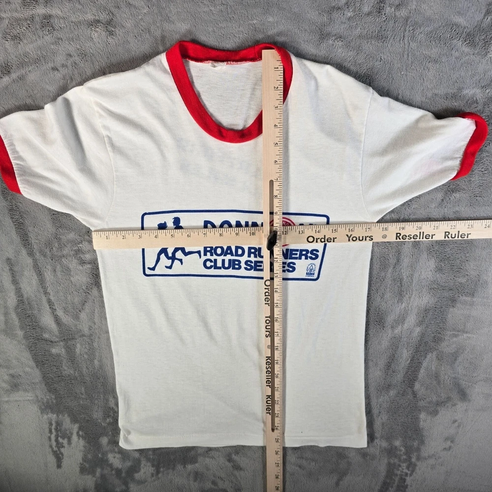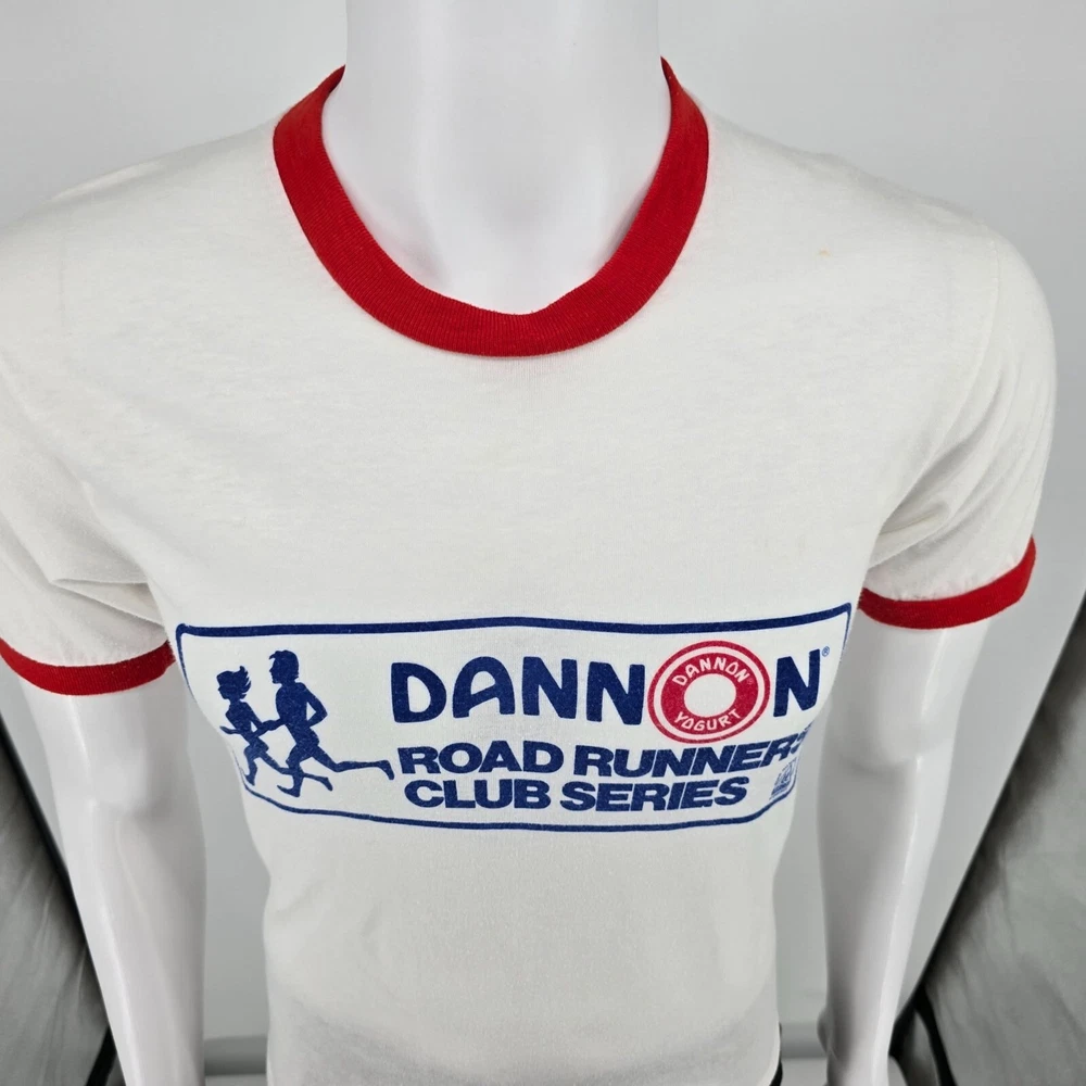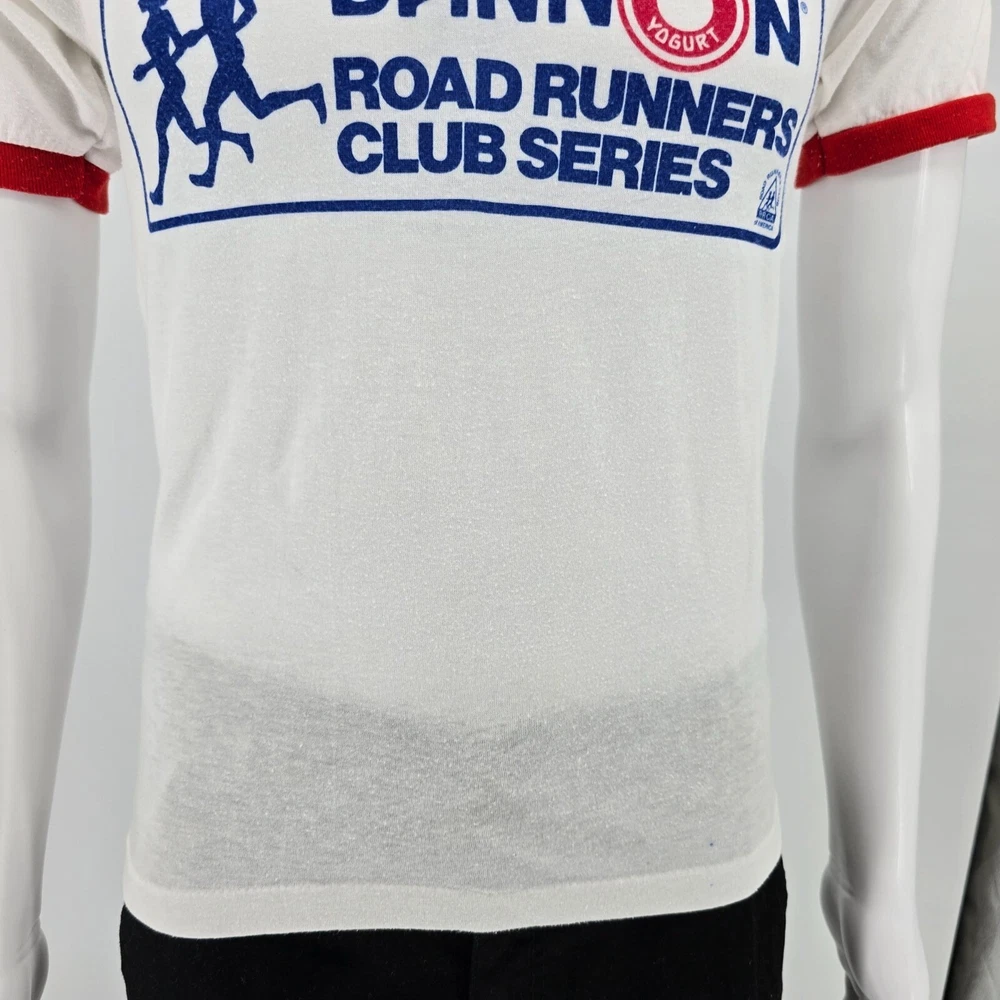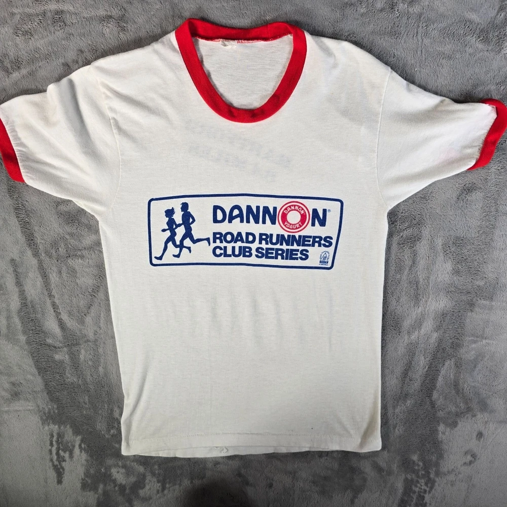 🔹 Item Details: Brand: Unknown (Tag illegible) Material: Unknown (feels like cotton/poly blend) Color: White and Red Decade of Manufacture: Early 1980s (chance of late 1970s- likely range is 1979-1982) Country of Manufacture: Unknown (almost certainly USA) Notable Features: Ringer collar and cuffs, single stitch hem Front Text: Dannon Road Runners Club Series RRCA Road Runners Club of America Back Text: Hartford 6.4 miles 🔹 Condition Notes: Good used vintage condition. Tag illegible. A few ink spots on front lower hem of t-shirt. Light to moderate fabric wear throughout. See photos for details. 🔹 Size Notes: Vintage Tag Size: Unknown Modern Measured Size: Small (34.5) 🔹 Measurements (Approximate): Chest (pit to pit): 34.5 inches Collar to Hem: 25.5 inches 🔹 Shipping & Returns: Ships worldwide from Lexington, KY. Ships within 3 business days of purchase. Returns accepted within 60 days for domestic orders and 30 days for international orders.