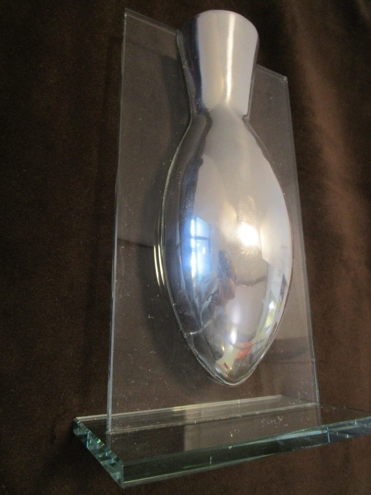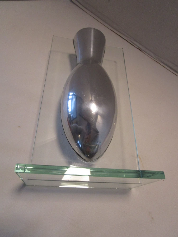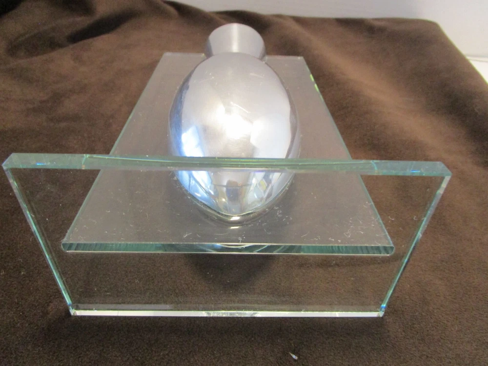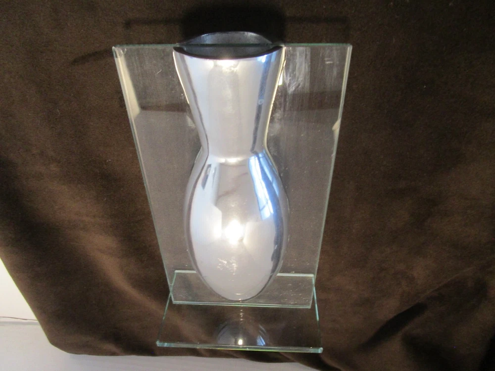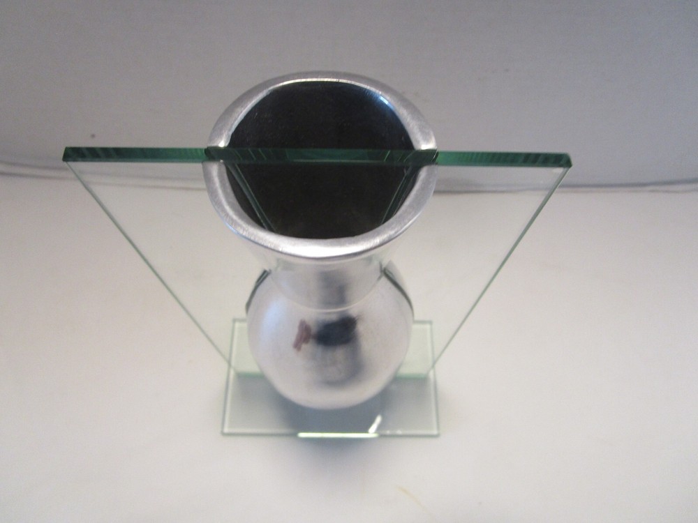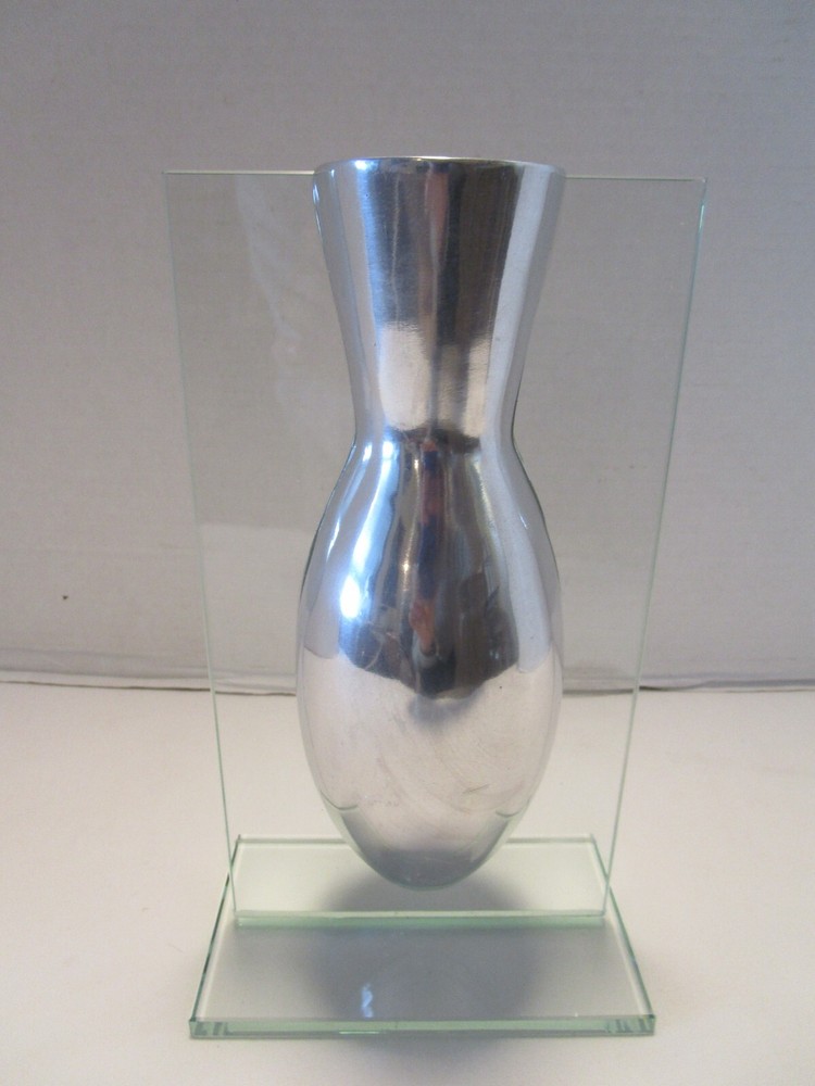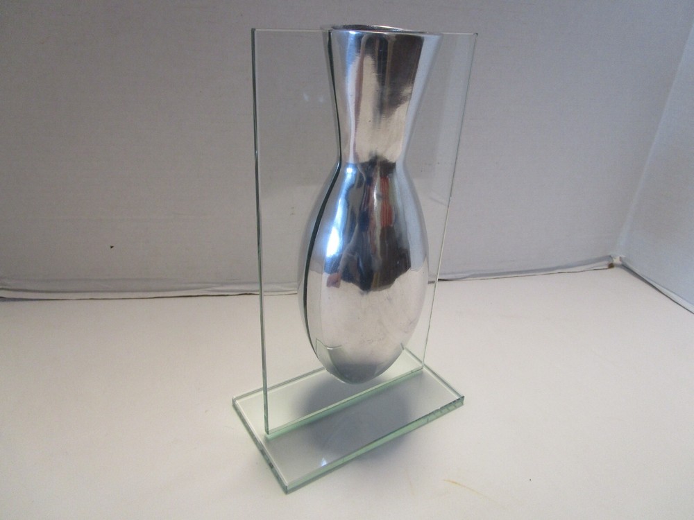 Description- 6/14/11/10 book # 426 AWESOME piece referred to as a "floating" vase because the aluminum vase appears to be suspended in air the way that it is mounted in the glass frame Stand. This is a pretty unique piece and believe that it was probably produced by BADASH, however there is no mark or label. Perfect for dry flowers – it is not good for water It is 9.5” tall x 5.5” wide and 3.75” deep Unpacked weighs 2.25 pounds- Preowned used condition-clean, no cracks chip top corner and rough bottom edge, see last pictures. Please zoom and view all pictures for more details as they are part of the description. I DO MY BEST TO DESCRIBE EVERY LISTING BUT I AM NOT AN EXPERT AND ITEMS ARE SOLD “AS IS”. My idea of great/good may be different than yours, so EXAMINE PHOTOS CAREFULLY since they are binding and a supplement to the word description in case I should miss something. If I fail to mention something, it does not qualify as “item not as described” if it shows in my pictures. EACH PHOTO IS WORTH A THOUSAND WORDS AND THEY ARE OF THE EXACT ITEM YOU WILL RECEIVE. RETURN POLICY: Returns are acceptable ONLY if the item is defective, or grossly misrepresented. THIS MEANS I DO NOT ACCEPT RETURNS for FIT, SIZING, COLOR ISSUES, OR BUYER'S REMORSE. Please zoom and view ALL pictures for more details as they are part of the description. Email me with any questions you may have. Please note: Buyer pays ALL return shipping and fees. · FEEDBACK I do not leave feedback until the end of a transaction. The transaction is considered over once I receive feedback from you confirming that you have received it and expressed satisfaction with it. If you are unsatisfied with your purchase, please contact me before leaving a neutral or negative feedback- so I can fix the issues. Postage is fully tracked ·