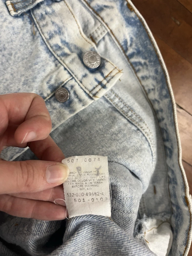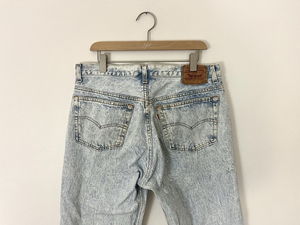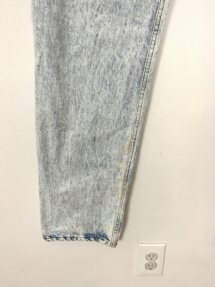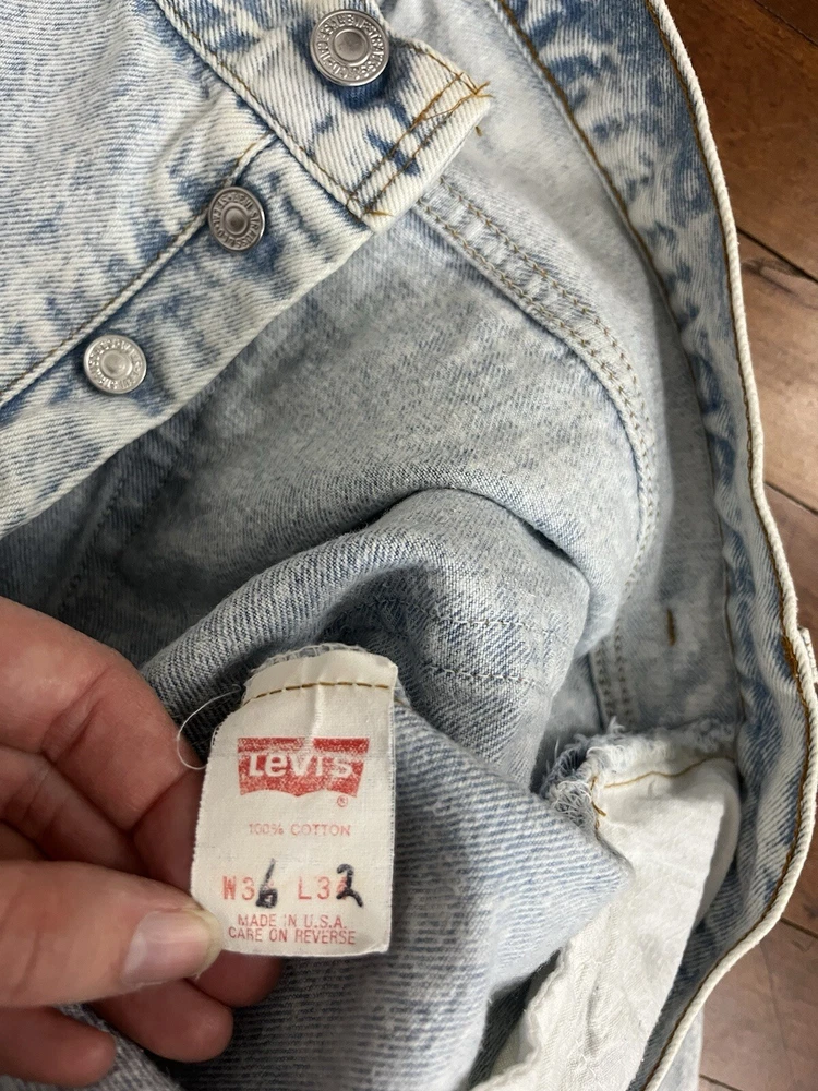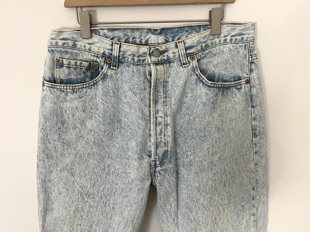 Vintage Levi’s 501 button fly jeans made in 1980! Acid wash finish and a tapered leg fit. Wash is light and there is a fair amount of staining (please refer to photos). I was able to get a significant amount of the staining out with bleach, so more could possible come out with more elbow grease than I was willing to give these. Otherwise pretty minimal distressing to the denim. I believe the original sizing was a 38 x 34 but not the waist measures between 34-35 inches and the inseam is just over 32”. More specific measurements are also in the photos. Thanks for shopping! Search words: vtg retro hippie hippy 36 Levi red tab orange tab preppy casual lighter blue as is 5 pocket relaxed silhouette