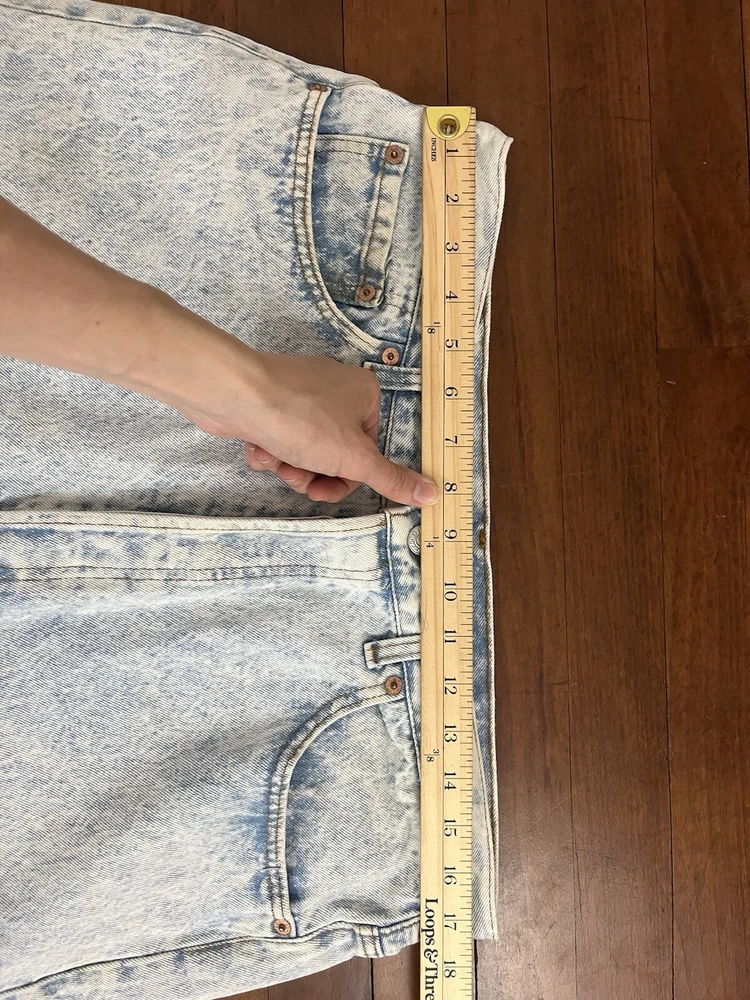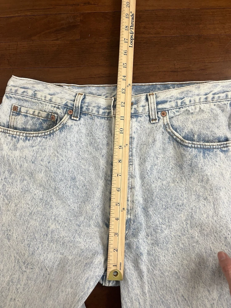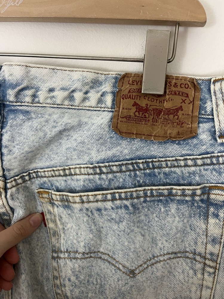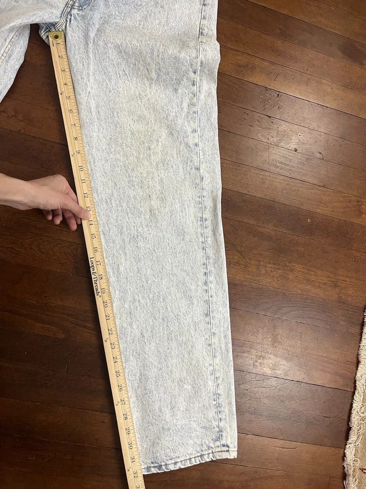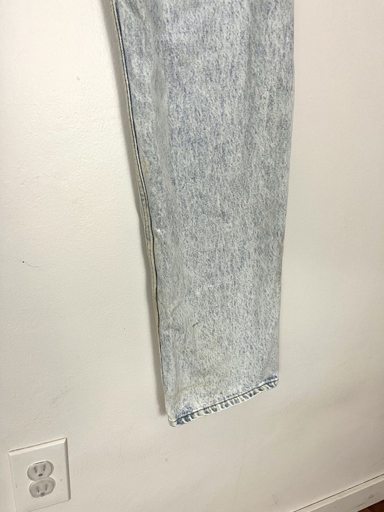Vintage Levi’s 501 button fly jeans made in 1980! Acid wash finish and a tapered leg fit. Wash is light and there is a fair amount of staining (please refer to photos). I was able to get a significant amount of the staining out with bleach, so more could possible come out with more elbow grease than I was willing to give these. Otherwise pretty minimal distressing to the denim. I believe the original sizing was a 38 x 34 but not the waist measures between 34-35 inches and the inseam is just over 32”. More specific measurements are also in the photos. Thanks for shopping! Search words: vtg retro hippie hippy 36 Levi red tab orange tab preppy casual lighter blue as is 5 pocket relaxed silhouette