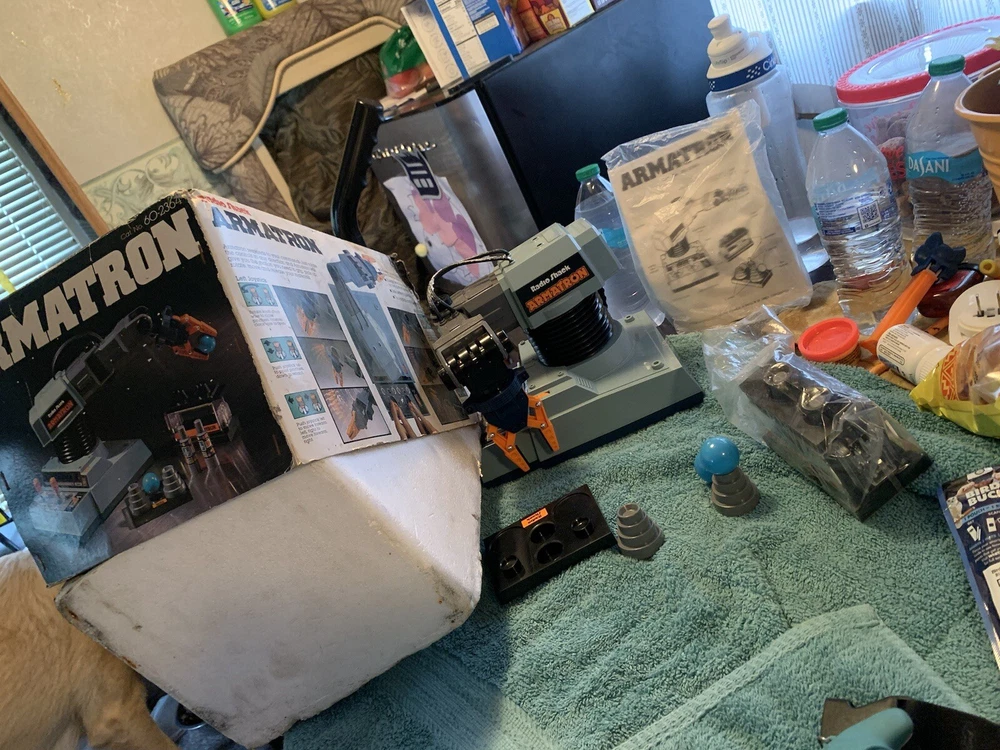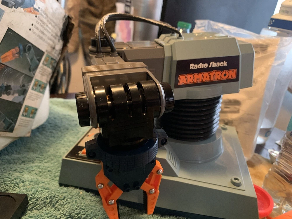 Vintage 1980s Radio Shack Armatron Robotic Arm 60-2364 w/ Box Works Tested Comes brand new box is a little damaged but it has never been used besides testing been sitting in my grandpas basement for 20+ years nice old toy good throwback comes with everything!!
