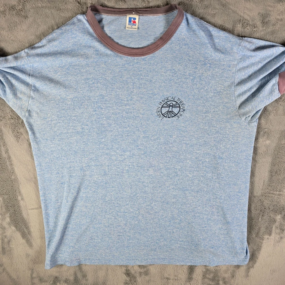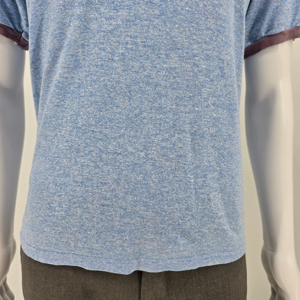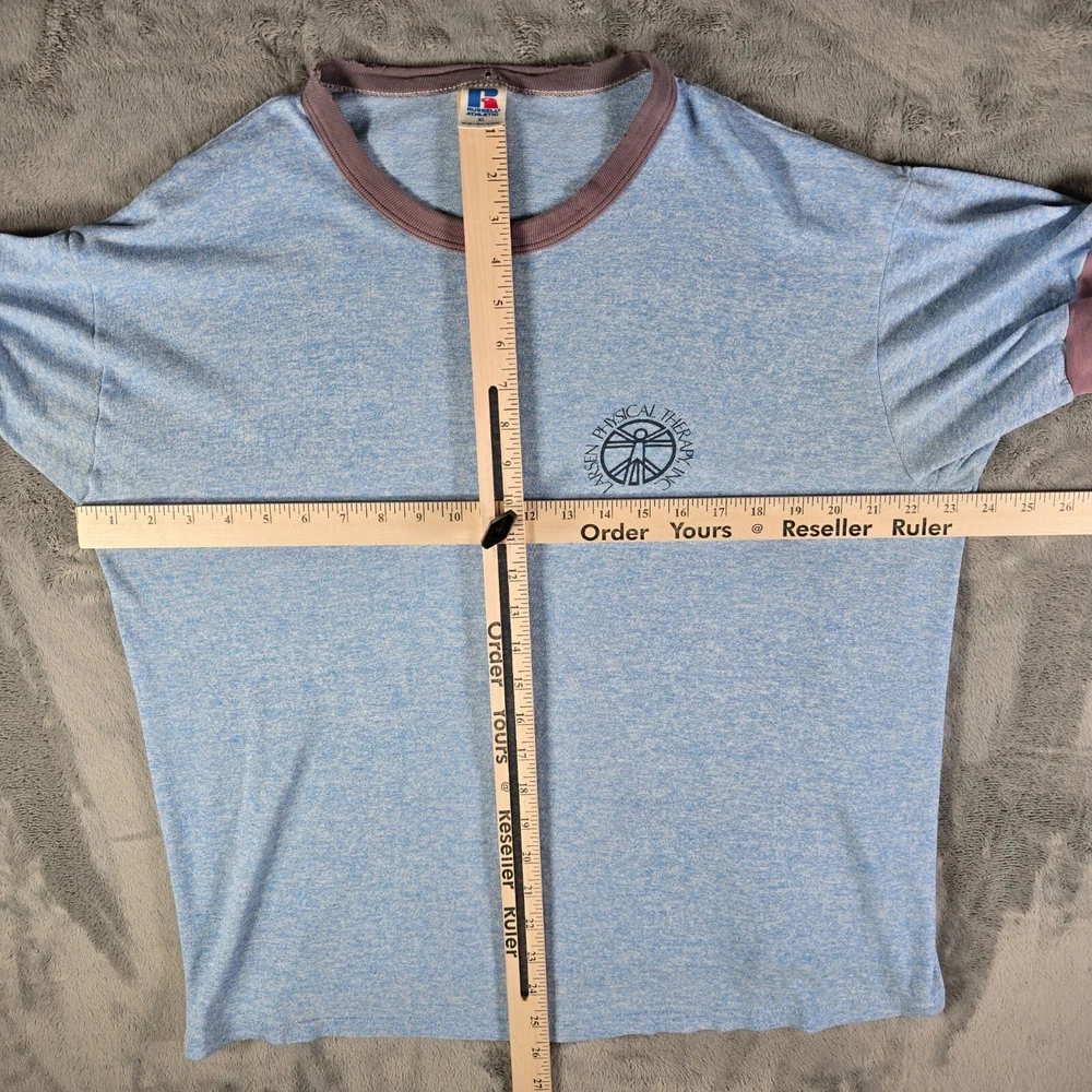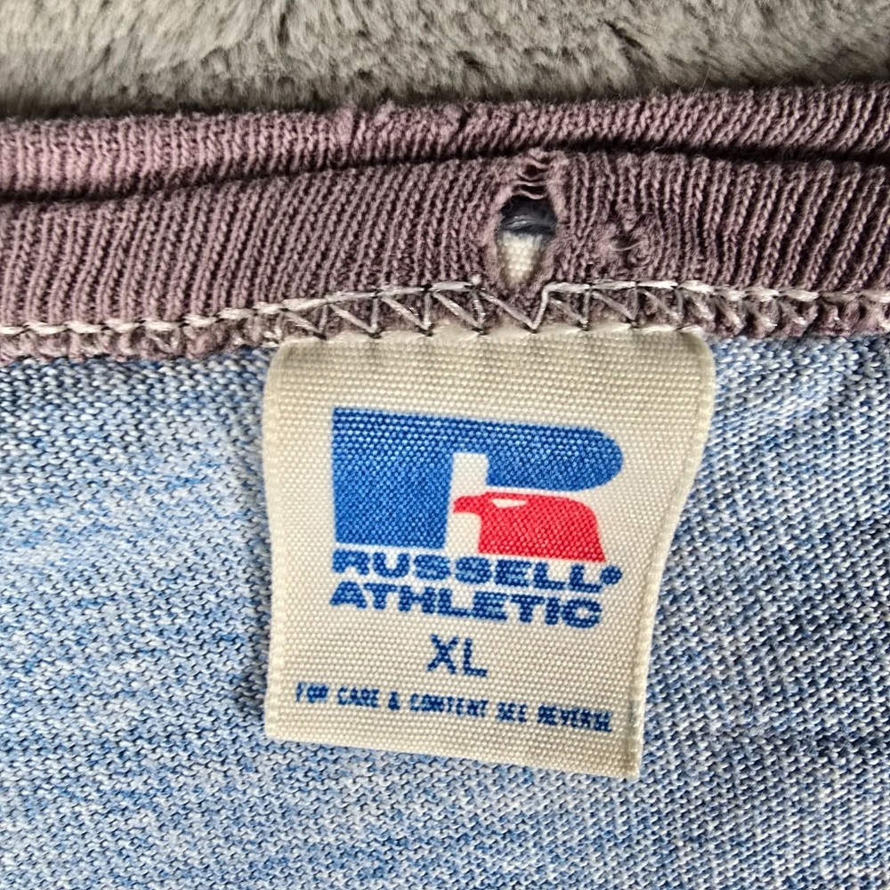 🔹 Item Details: Brand: Russell Athletic Material: 50% Polyester, 38% Cotton, 12% Rayon (tri-blend) Color: Heather Blue Decade of Manufacture: 1980s Country of Manufacture: U.S.A. Notable Features: Single Stitch Hem, Ringer Tee 🔹 Condition Notes: Good used vintage condition. Visible wear/grinding at collar and at both cuffs. Faint stain on front to right of logo. A few other spots of faint staining throughout. Light to moderate fabric wear throughout. See photos. 🔹 Size Notes: Vintage Tag Size: XL Modern Measured Size: XL 🔹 Measurements (Approximate): Chest (pit to pit): 47 inches Collar to Hem: 25.5 inches 🔹 Shipping & Returns: Ships worldwide from Lexington, KY. Ships within 3 business days of purchase. Returns accepted within 60 days for domestic orders and 30 days for international orders.