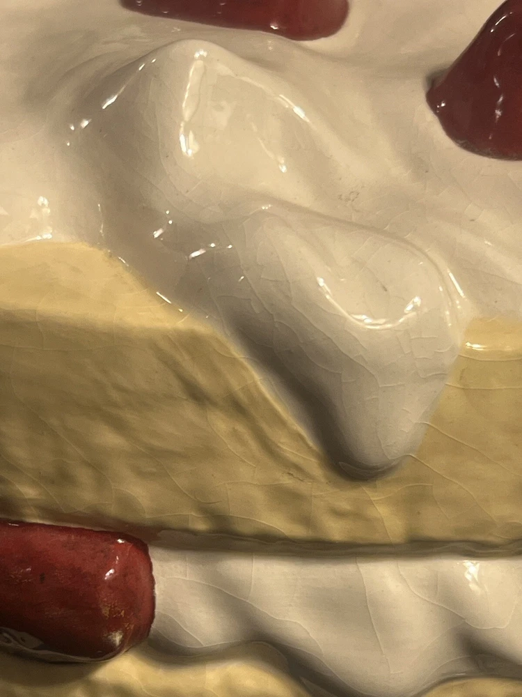 Great overall condition considering age. Few spots on strawberries that show some wear, a small Knick in the side, and crazing lines. All of these things are pictured. Measures: 10.5” H x 10.5” W Please view all pictures for overall condition!