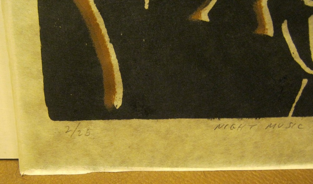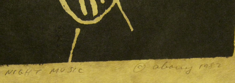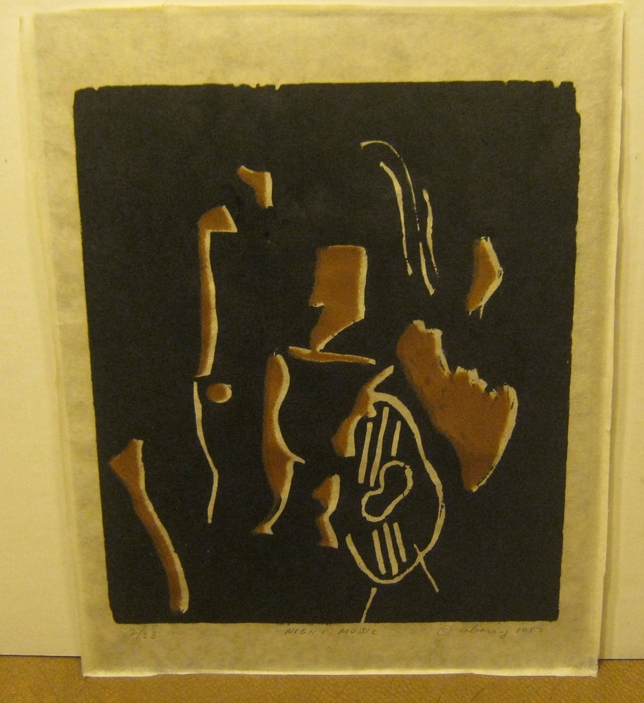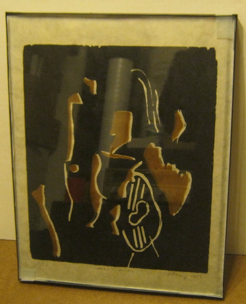 This wonderful Abstract Modern print is a serigraph I believe, and the signature is "Abouy" as far as I can decipher it!! It is titled "Night Music" and is number 2 of only 25 prints created in 1982!! The print is in MINT condition having been framed under glass, with a little curl on the outer edges of the paper (nothing that will show when it is properly matted and framed!)!! The inexpensive frame is not included!! Approx. 11" X 14" overall!! Please see my many other art listings and email me with any questions!!
