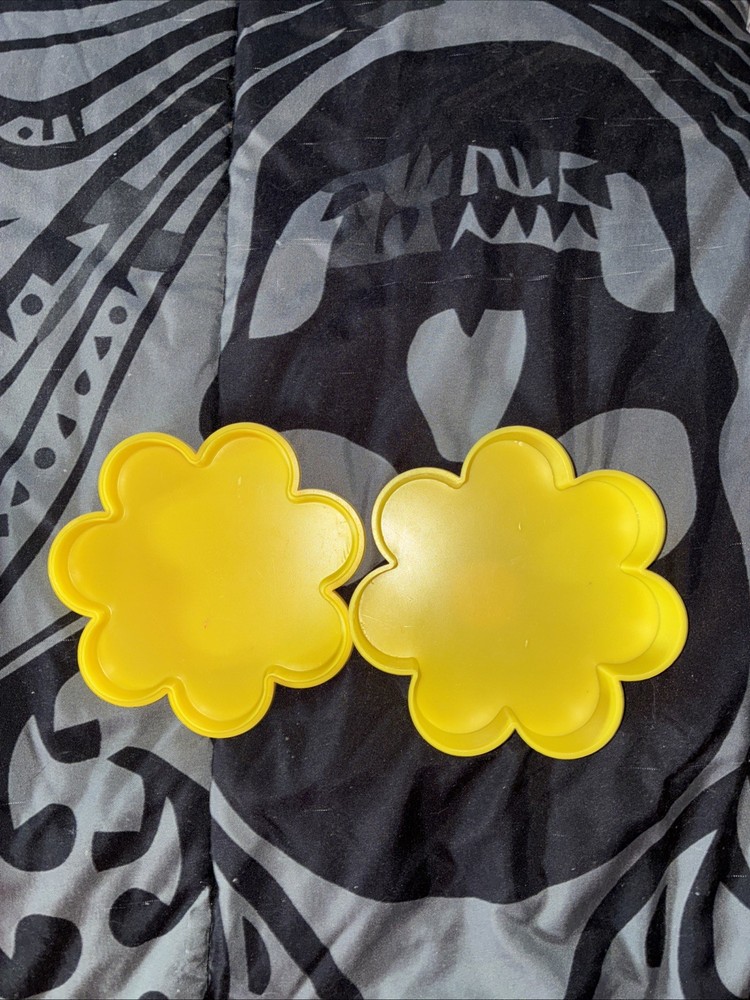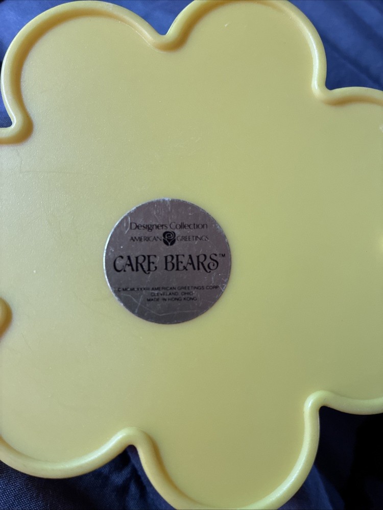 This vintage Care Bears 1983 Funshine Bear keepsake trinket jewelry box is a small, asymmetrical box suitable for storing trinkets. It features a 3D effect with a matte finish and a yellow color with a flower pattern. The box is branded by American Greetings and is part of the Care Bears collection, making it a nostalgic item for fans of 1980s cartoon characters. Its unique design and vintage appeal make it a special addition to any collection or decor. Reads “the nicest things under the sun.”