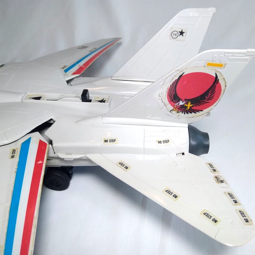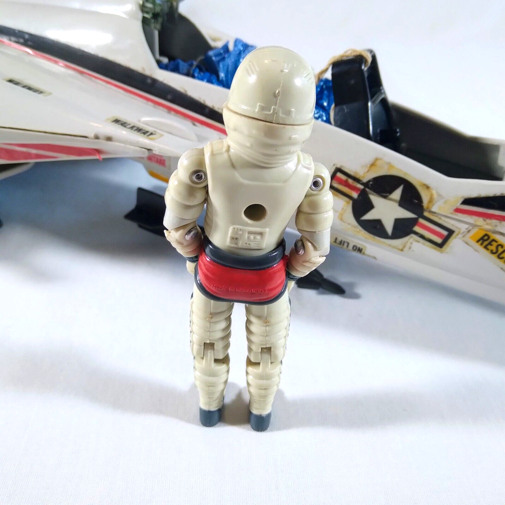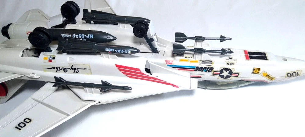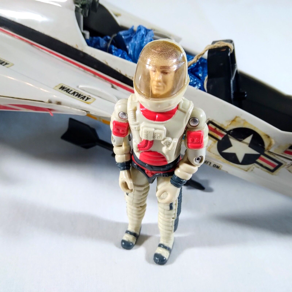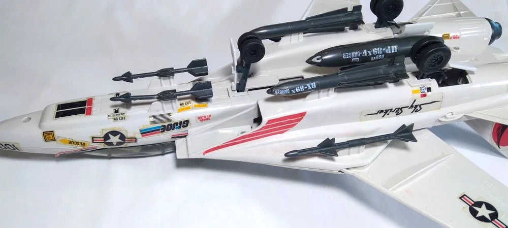 Vintage 1983 GI Joe Skystriker XP14F Combat Jet Includes: Fighter Jet Vehicle Ace Figure w/ Helmet 1x Parachute 1x Seat 7x Missiles Cockpit Canopy 2x Hatch Covers 2x Tail Fins Damaged: 2x Landing gear covers Missing: 1x Landing gear cover spring 1x Parachute 1x Seat All original, no repro. Smoke free pet free home. I combine shipping on all items.