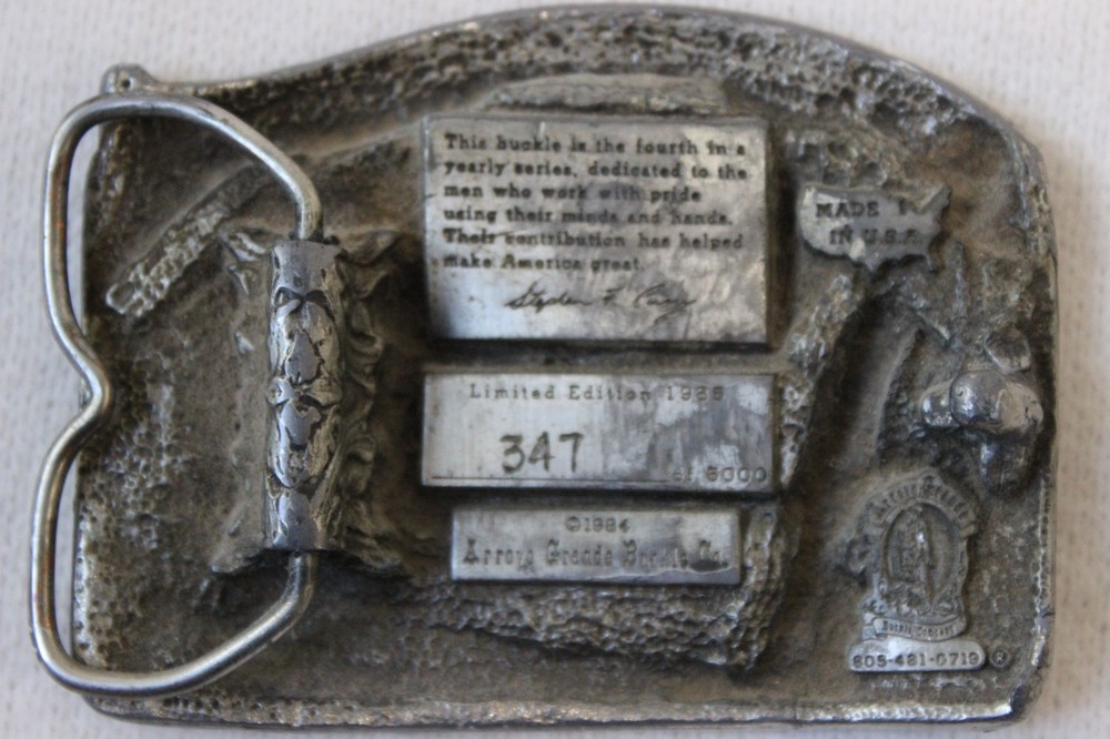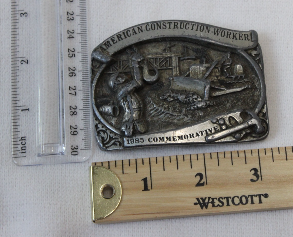 This 1985 American Construction Worker commemorative silver belt buckle by Arroyo Grande Buckle Co. is a unique vintage accessory. The occupational theme and original design make it a special piece for any collection. Crafted from metal in the United States, this belt buckle is suitable for adult wearers and showcases the craftsmanship of the 1980s era. The silver color adds a touch of elegance to any outfit, making it a stylish and timeless addition to any wardrobe.